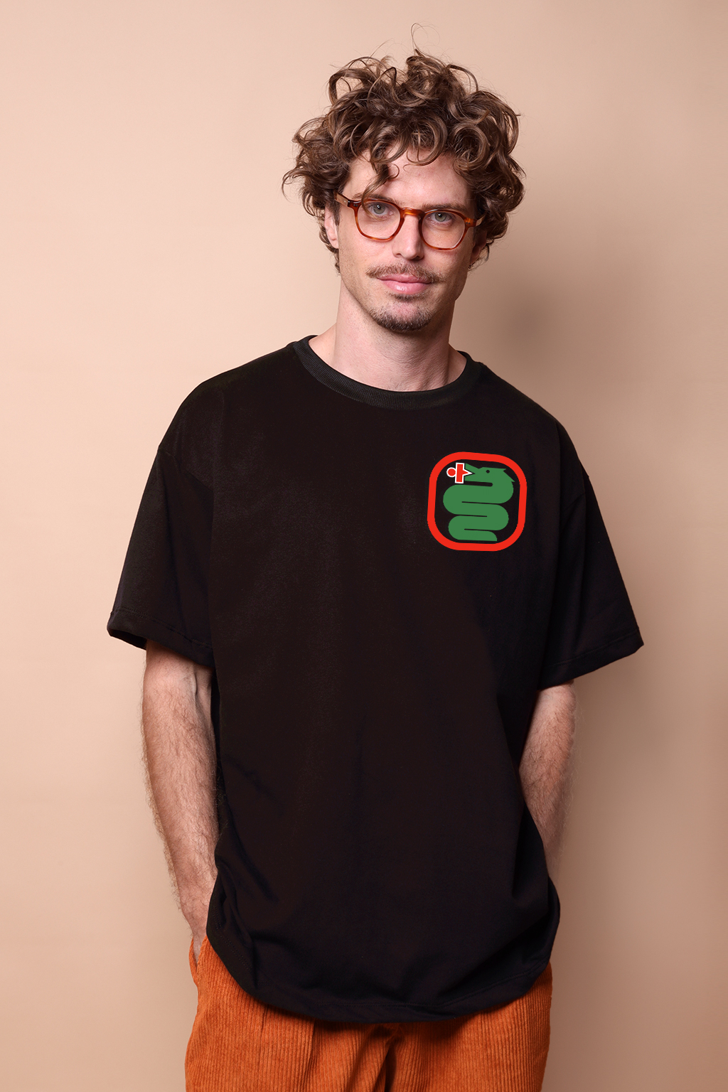 Camiseta oversize preta estampada Alfa Romeo. Ambos modelos vestem tamanho 1.