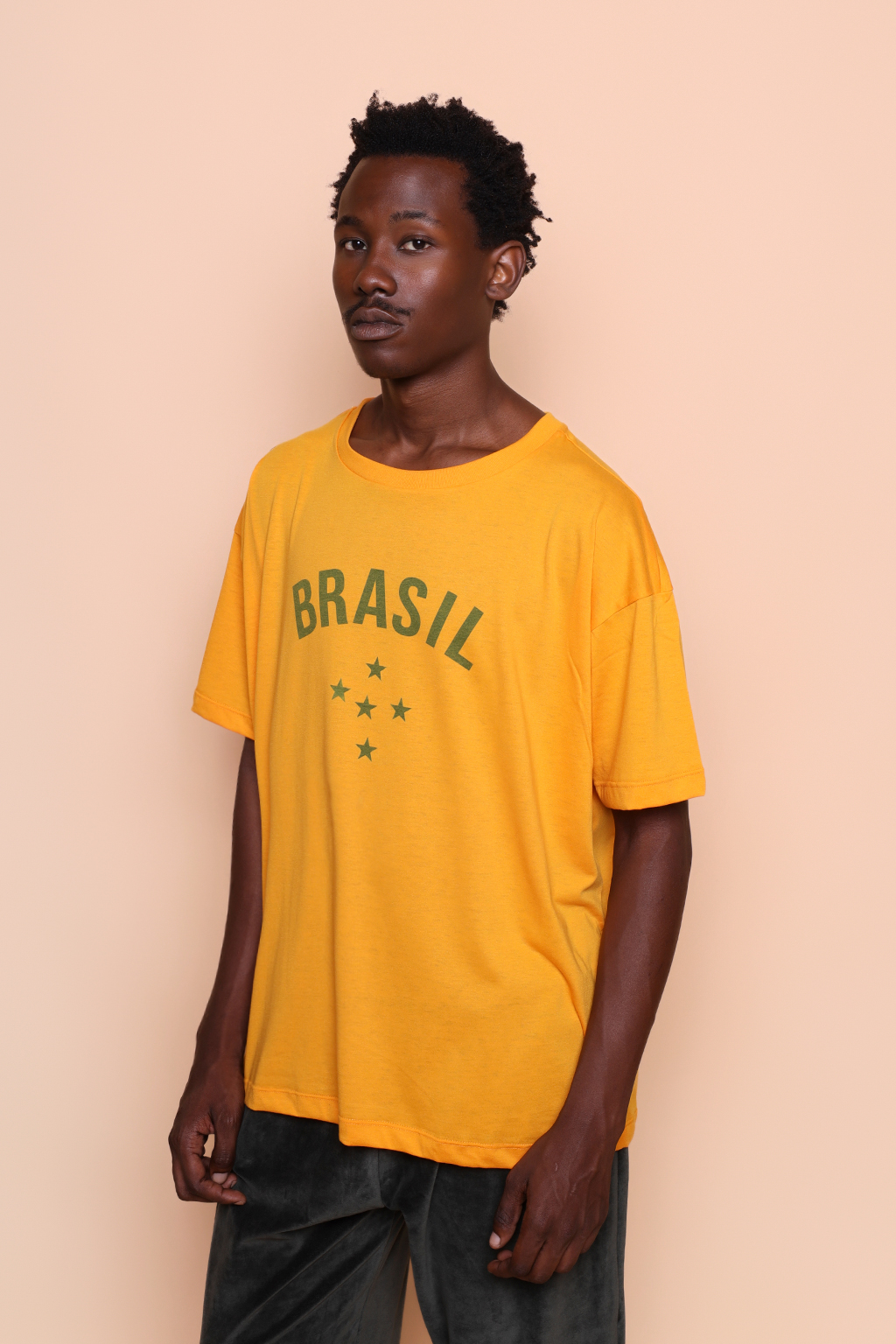 Camiseta oversize amarela Brasil. Ambos os modelos vestem tamanho 1.