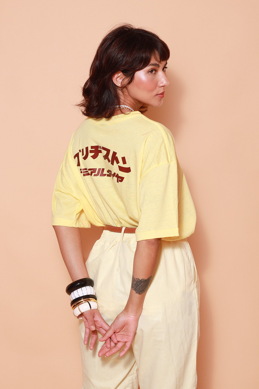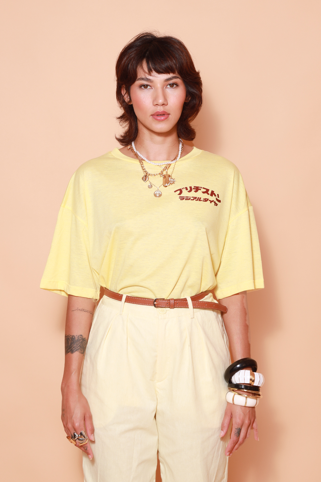 Camiseta oversize amarela estampada Bridgestone DTF. A modelo mede 1,74 e o modelo mede 1,78 e ambos usam tamanho 1.