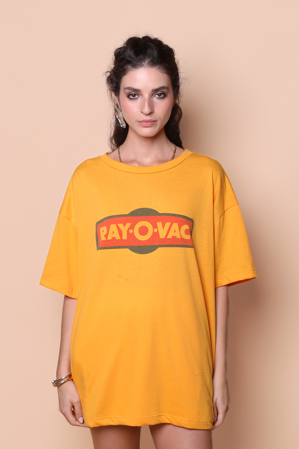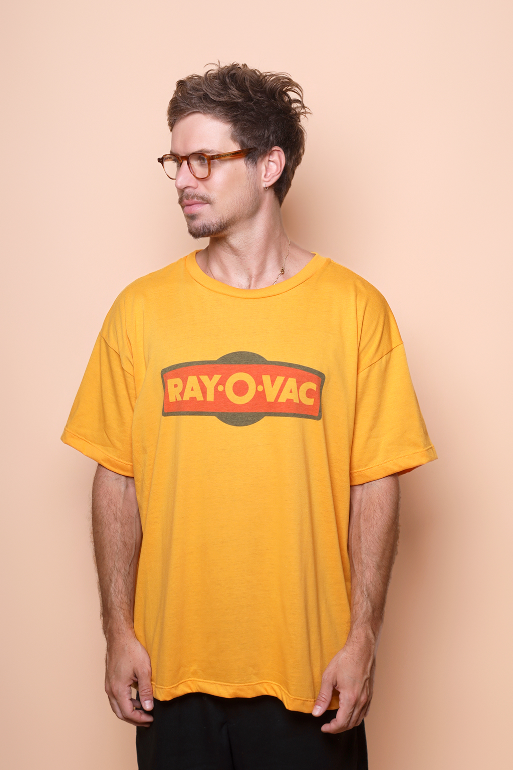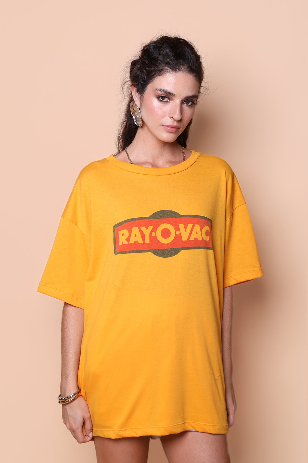 A camiseta oversize Ray-O-Vac é confeccionada em tecido meia malha de algodão, dando um toque mais macio e agradável. Além disso, tem como estampa o logo da Rayovac (antiga Ray-O-Vac), marca de pilhas e baterias da Spectrum Brands de Sandy Springs, Geórgia, nos EUA. Fundada em 1906 como French Battery Co., mudou seu nome para Ray-O-Vac em 1930, e seu nome faz alusão à tecnologia de válvulas termiônicas e raios de elétrons utilizada no primeiro aparelho auditivo vestível do mundo, patenteado pela empresa.