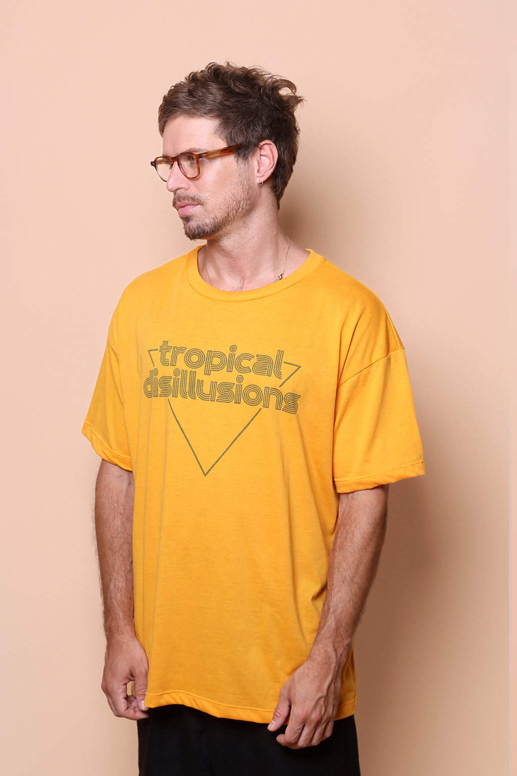 Camiseta oversize amarela estampada Tropical Disillusions. A modelo mede 1,72 e o modelo mede 1,78 e ambos usam tamanho 1.