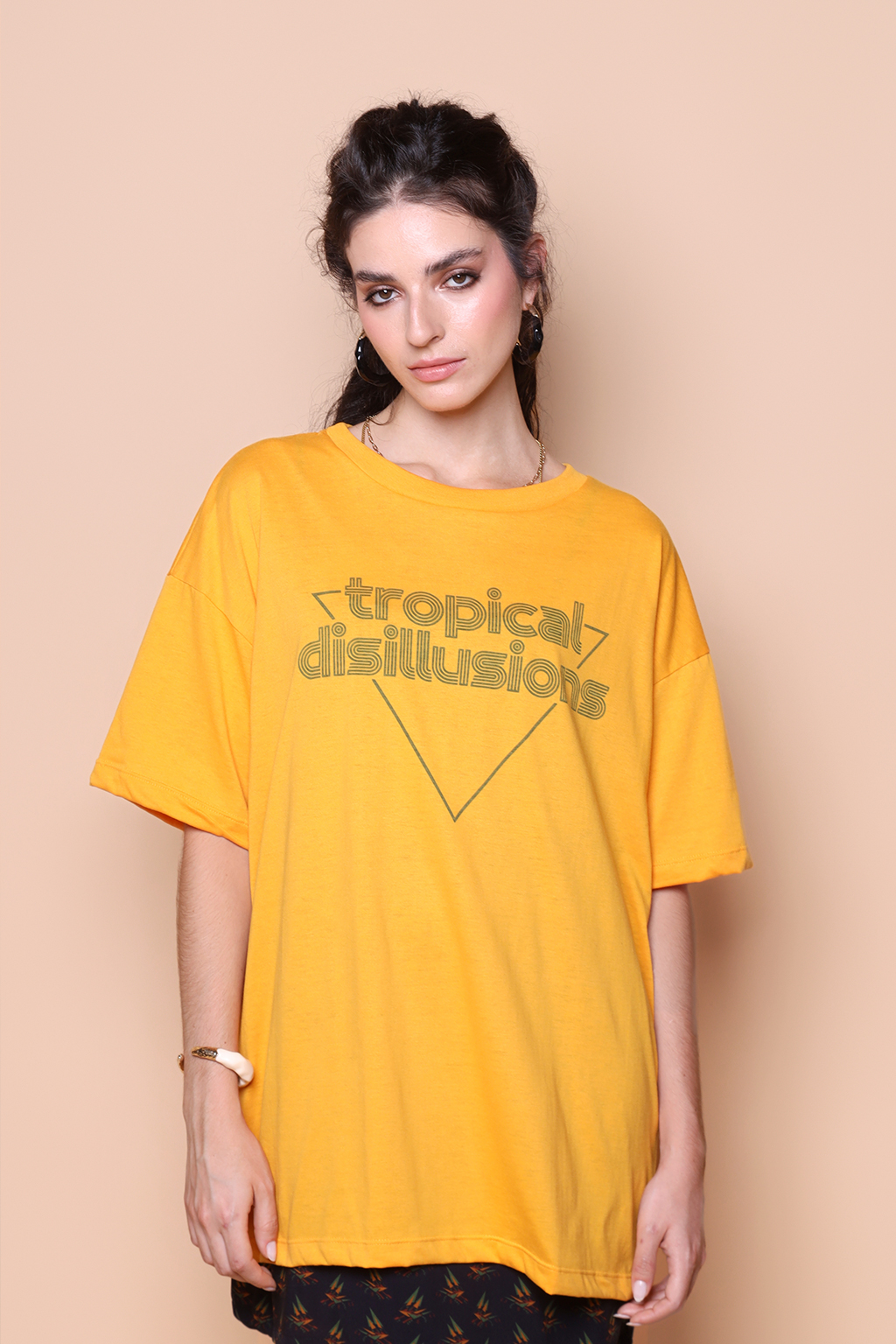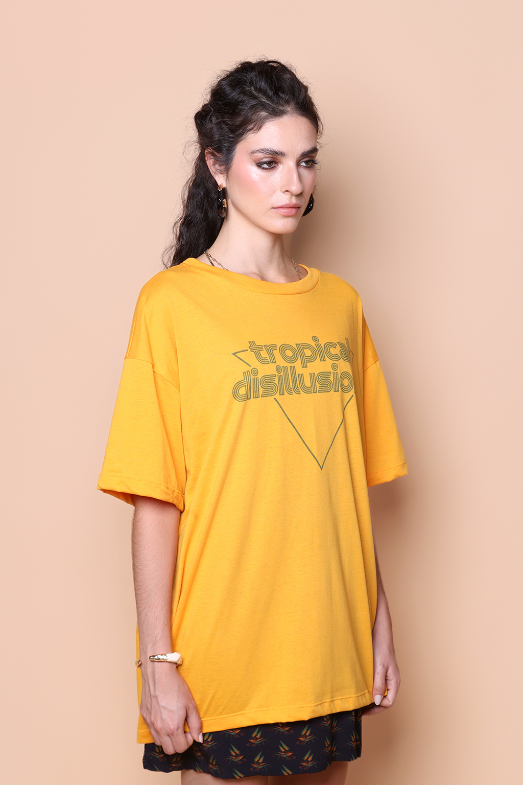 Camiseta oversize amarela estampada Tropical Disillusions