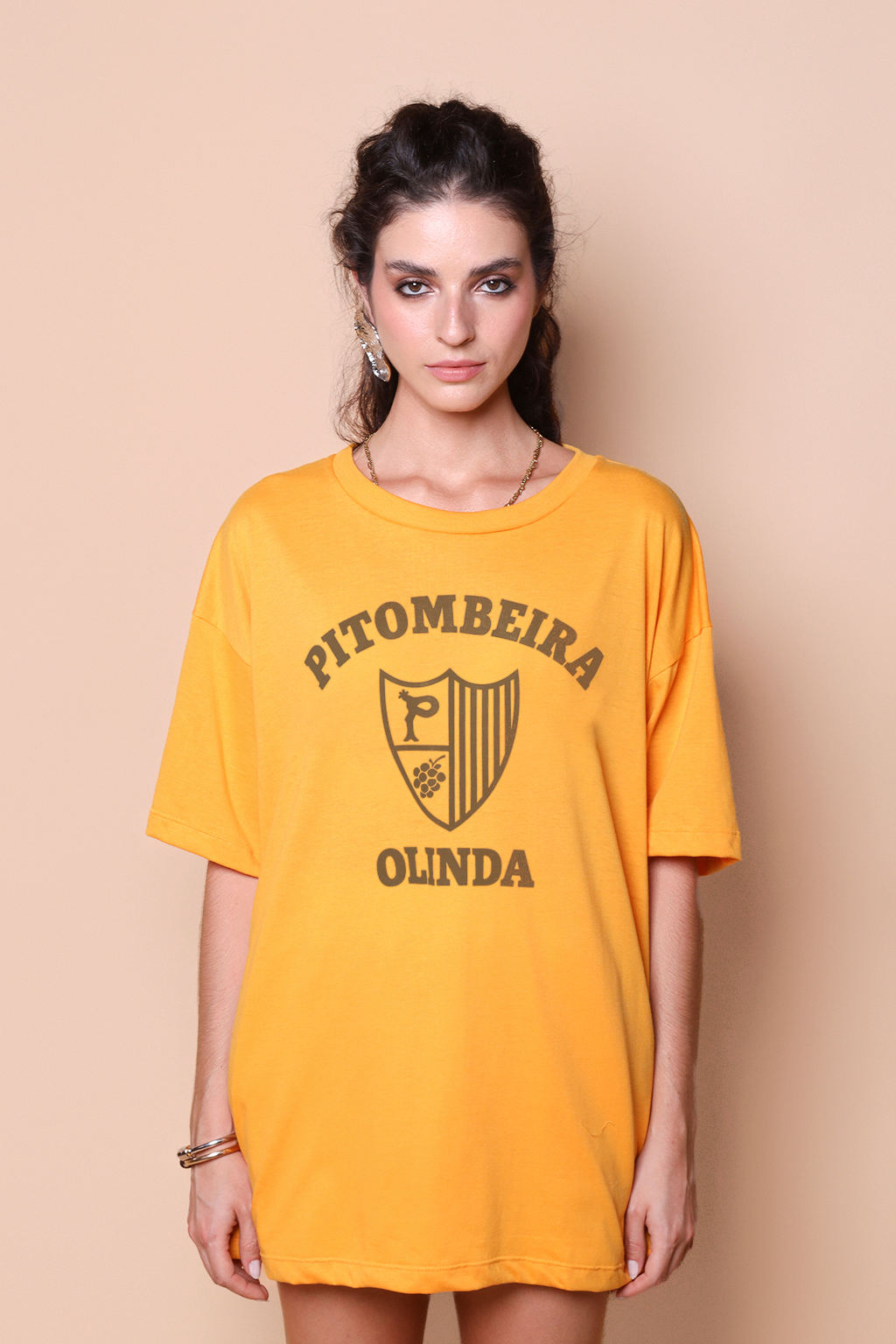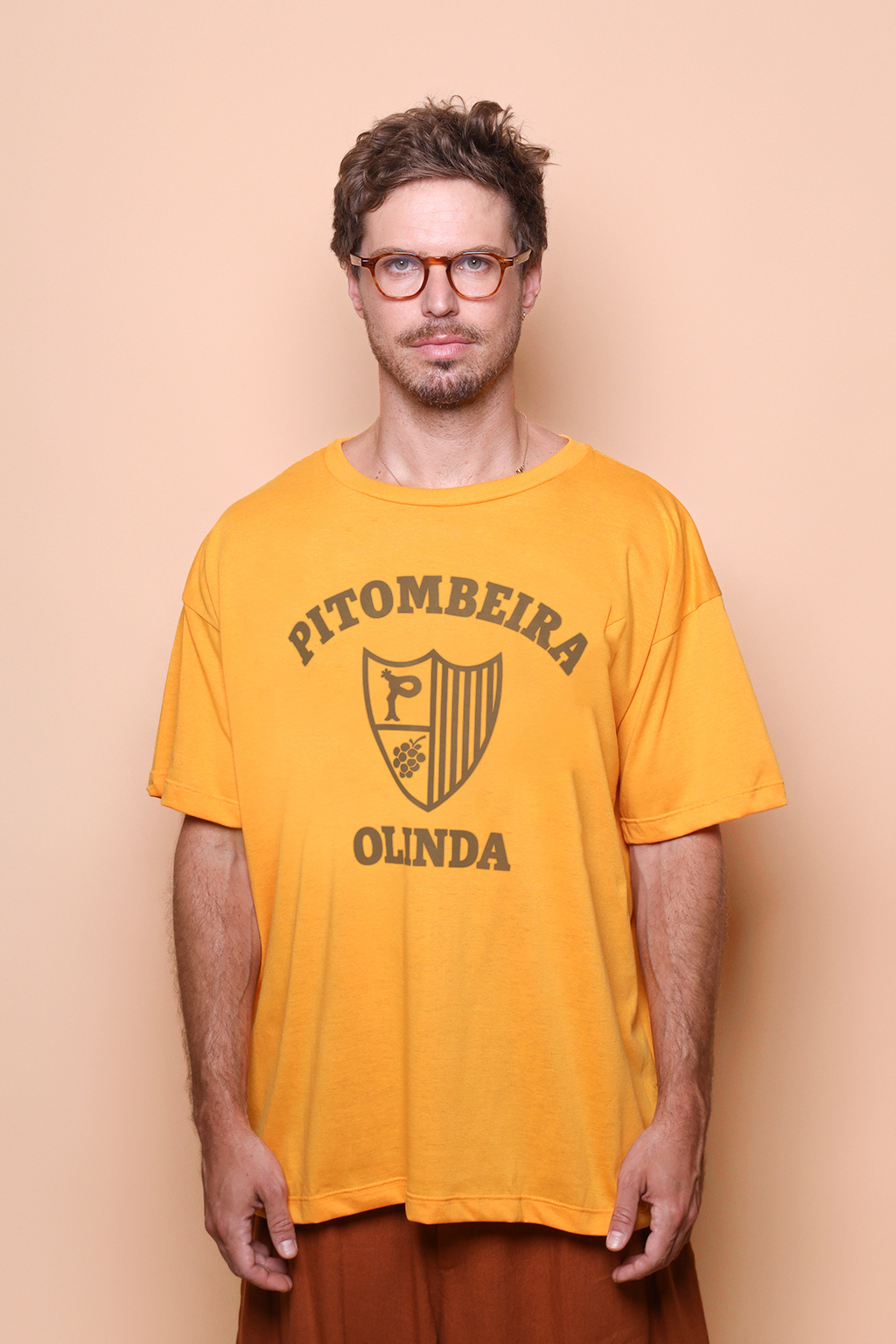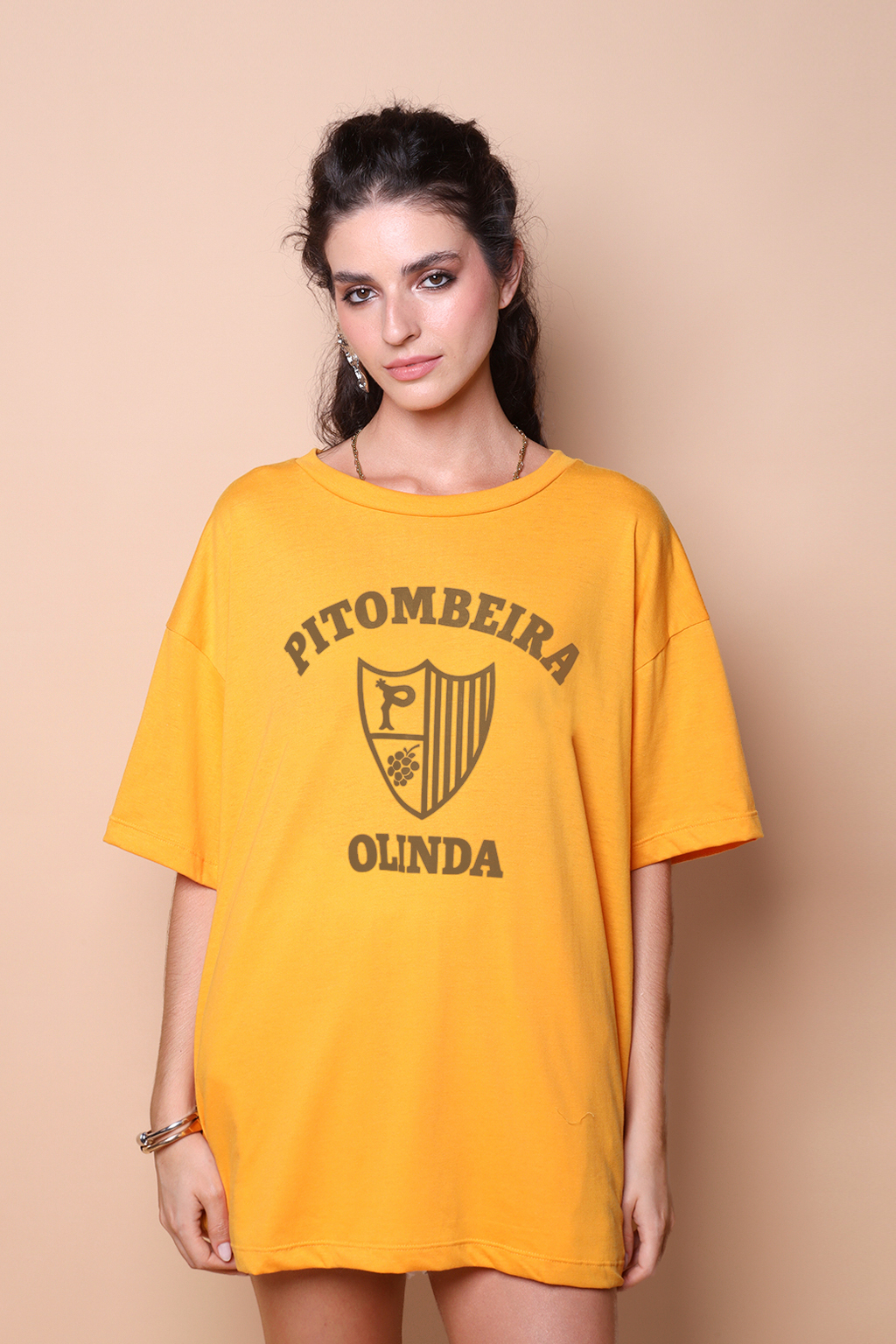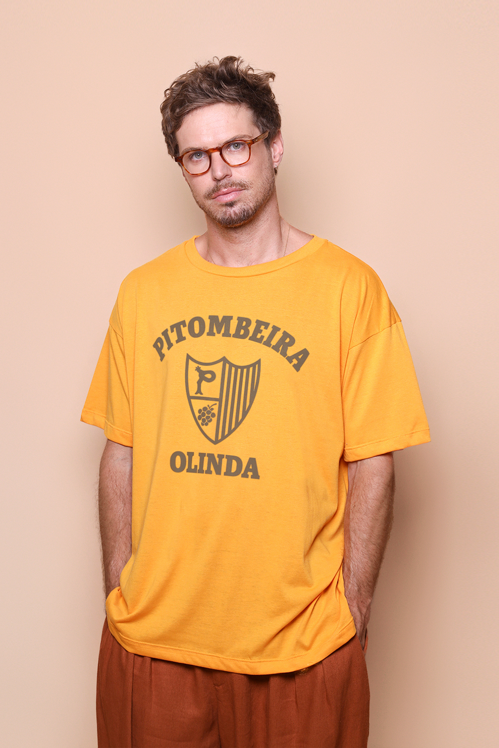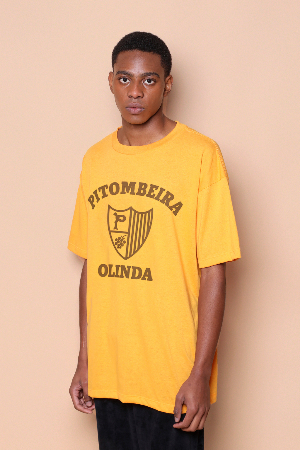 A camiseta oversize Pitombeira é confeccionada em tecido meia malha de algodão para um toque mais macio e agradável. Essa peça faz parte de uma coleção collab com o filme O Agente Secreto, novo filme de Kleber Mendonça Filho indicado ao Globo de Ouro. Em especial, a camiseta Pitombeira traz como estampa o escudo da Troça Carnavalesca Mista Pitombeira dos Quatro Cantos, agremiação carnavalesca de Olinda, no Pernambuco. Fundada em 1947, tem como cores o amarelo e o preto, porém o escudo em questão surgiu apenas em 1978, ano importante para a agremiação, que teve como enredo daquele ano o tema “Festa das Nações”.