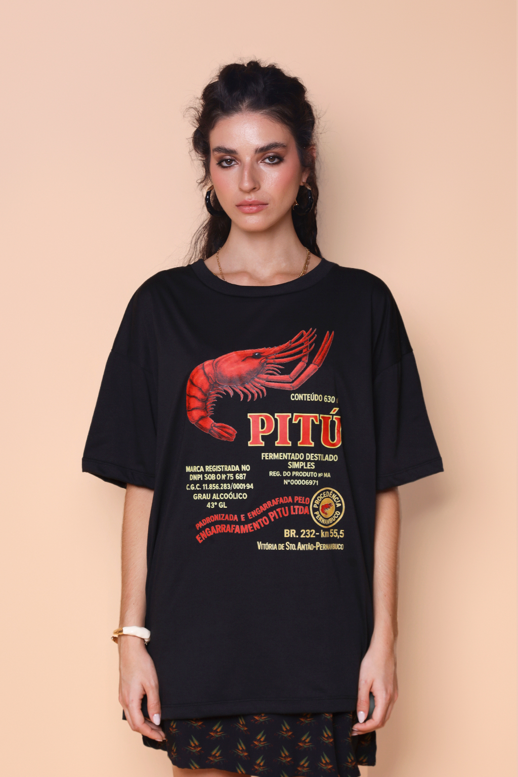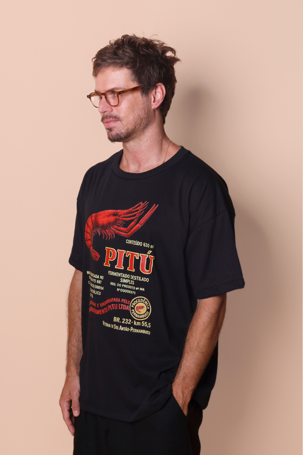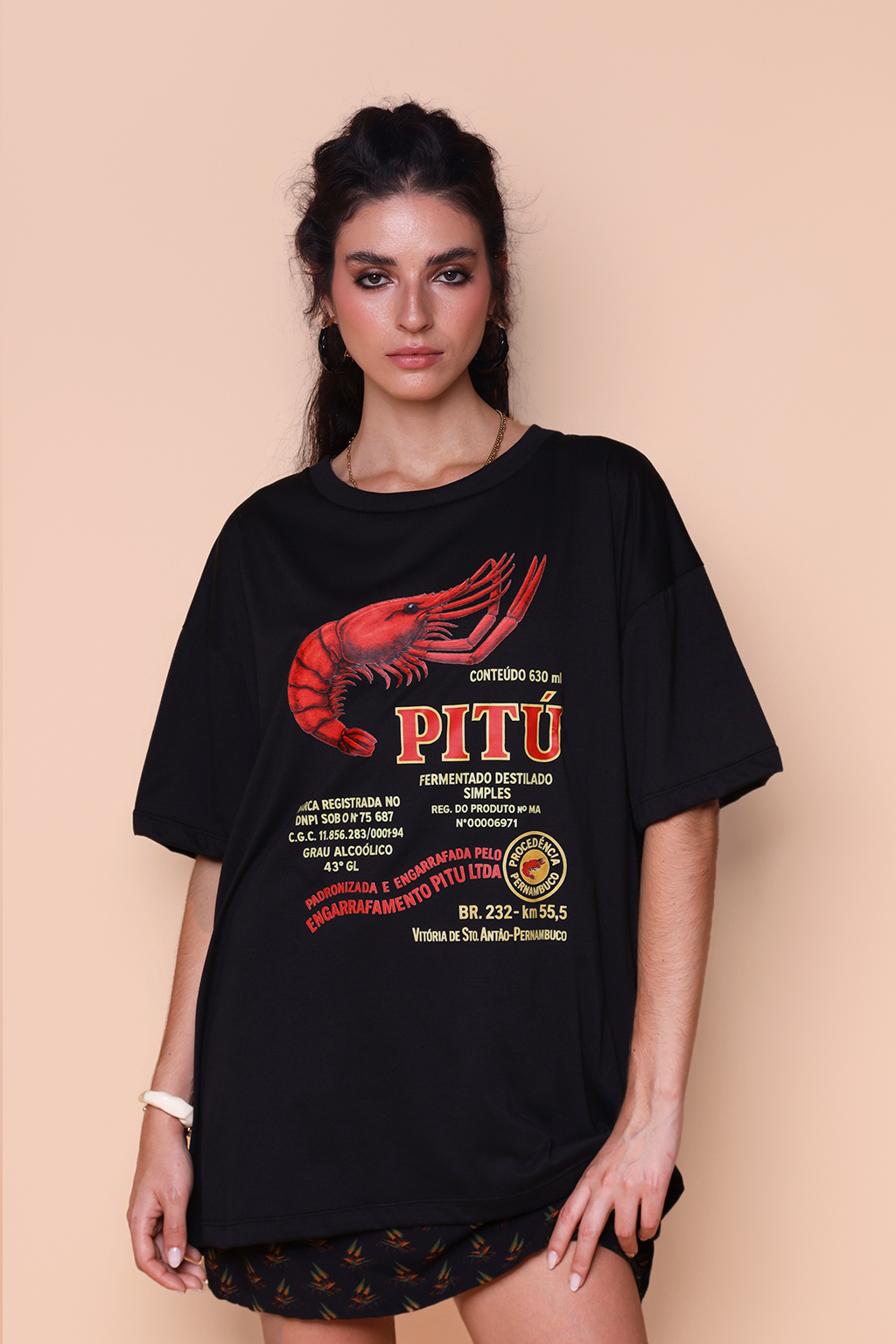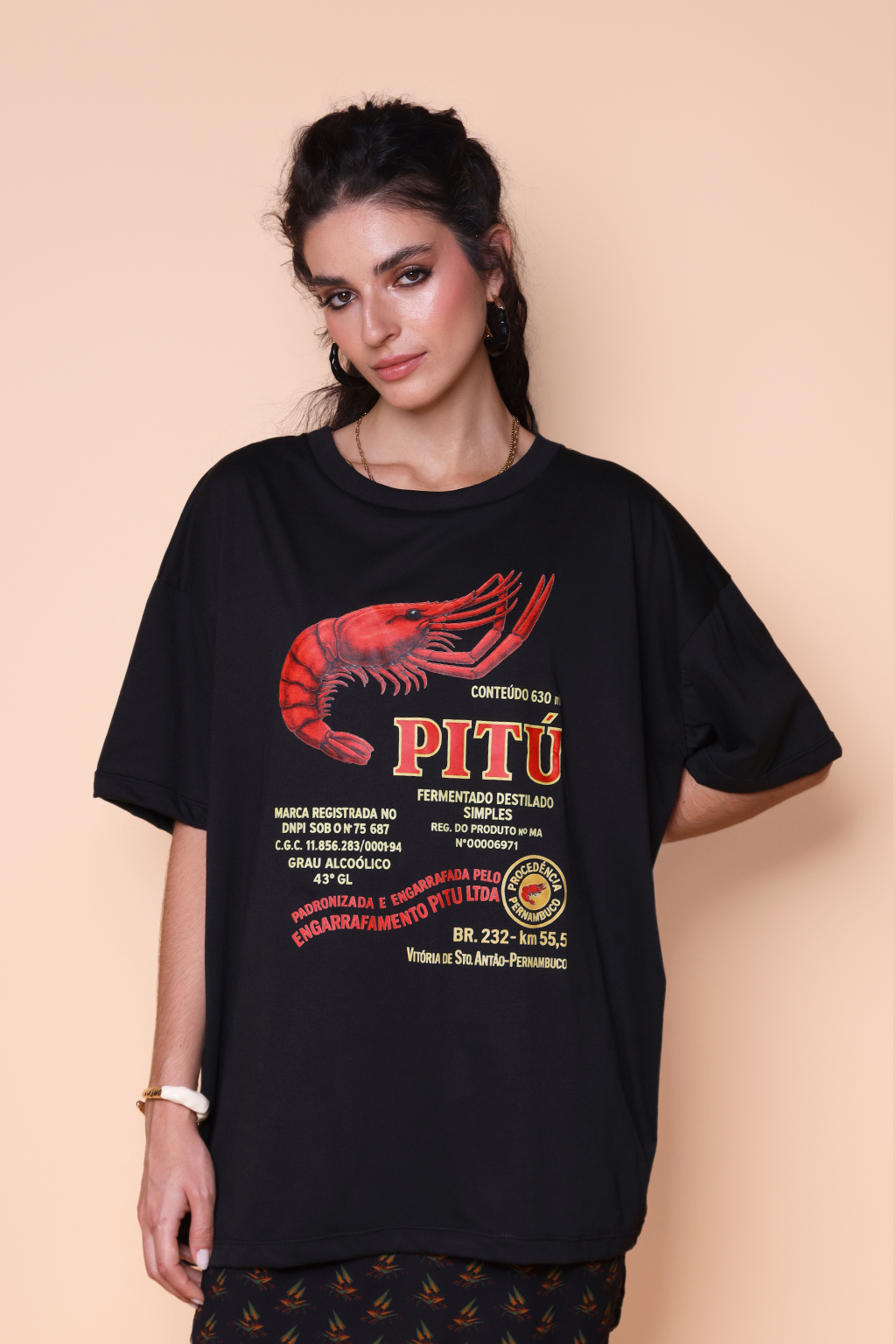 A camiseta oversize Pitú é confeccionada em tecido meia malha de algodão para um toque mais macio e agradável. Essa peça faz parte de uma coleção collab com o filme O Agente Secreto, novo filme de Kleber Mendonça Filho indicado ao Globo de Ouro. Em especial, a camiseta Pitú traz como estampa o logo da cachaça criada pela empresa de nome homônimo, em 1938. A empresa foi fundada em Vitória de Santo Antão, apenas 46 km da capital pernambucana, Recife, cenário do filme. É a maior exportadora de cachaça do país, sendo reconhecida internacionalmente como uma bebida típica brasileira, exportada para diversos países como Alemanha, EUA, Canadá, Japão e países do Mercosul.