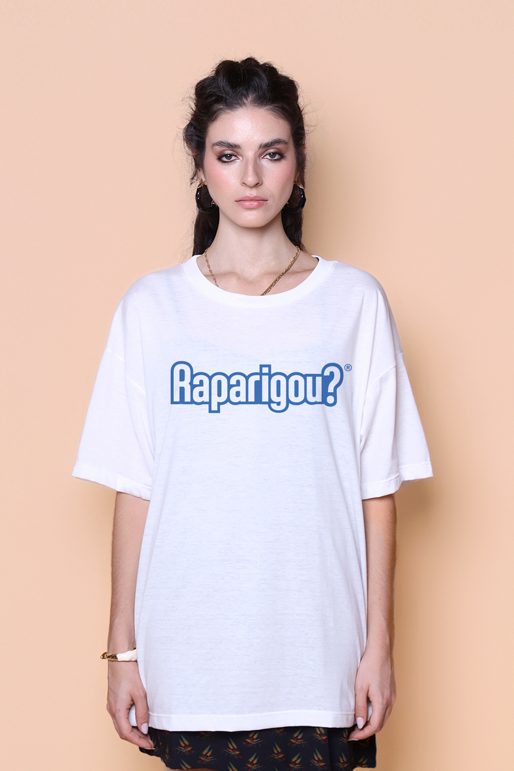 A camiseta oversize Raparigou? é confeccionada em tecido meia malha de algodão para um toque mais macio e agradável. Essa peça faz parte de uma coleção collab com o filme O Agente Secreto, novo filme de Kleber Mendonça Filho ganhador do Globo de Ouro. Em especial, a camiseta Raparigou traz como estampa uma fala do filme, “Raparigou ou não raparigou?”, pergunta feita por Seu Alexandre (Carlos Francisco) para Armando (Wagner Moura), a respeito da relação de Armando sua esposa, Fátima (Alice Carvalho), filha de Seu Alexandre. No filme não é possível saber a resposta, porém no roteiro original, que foi transformado em livro, é possível saber a resposta.
