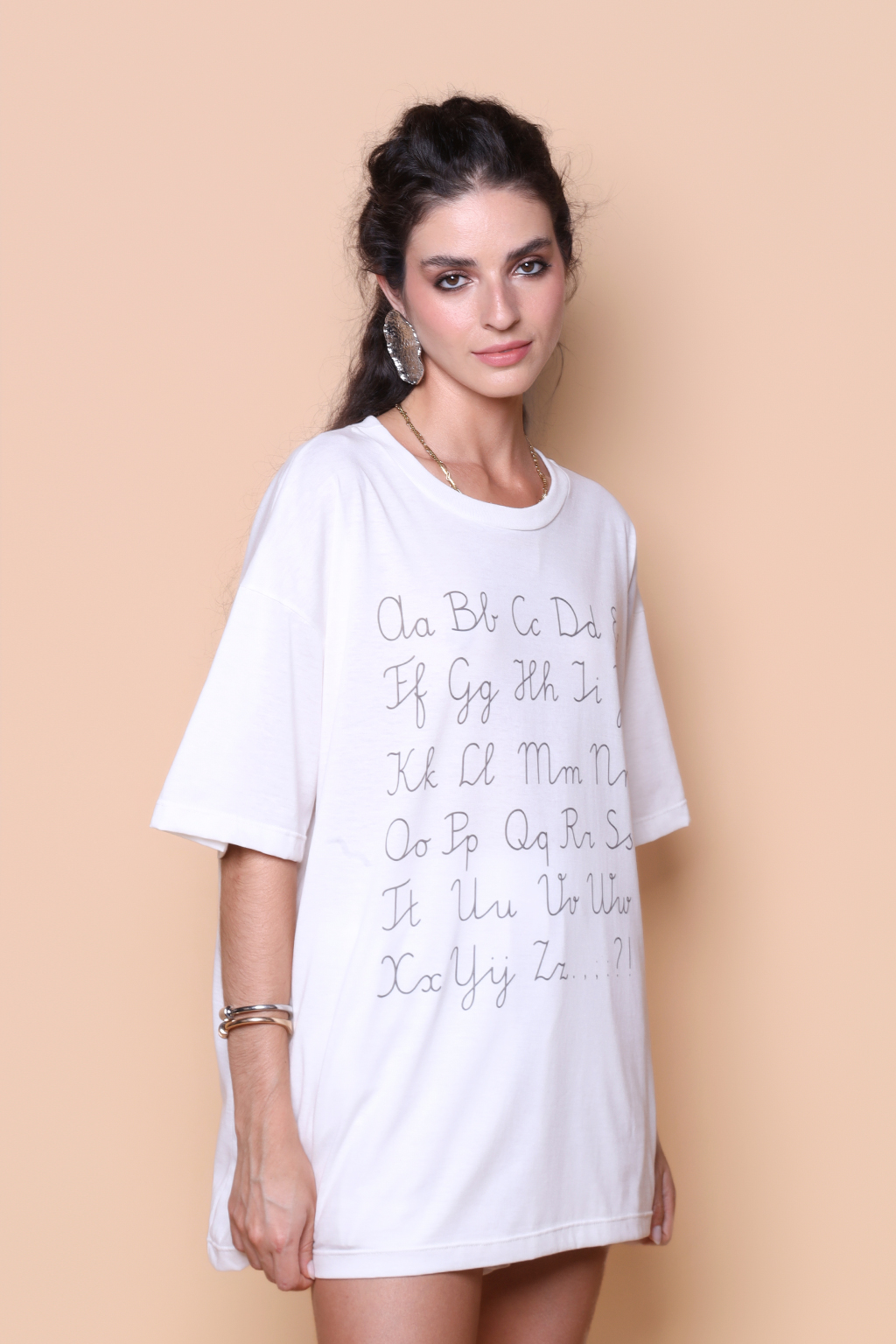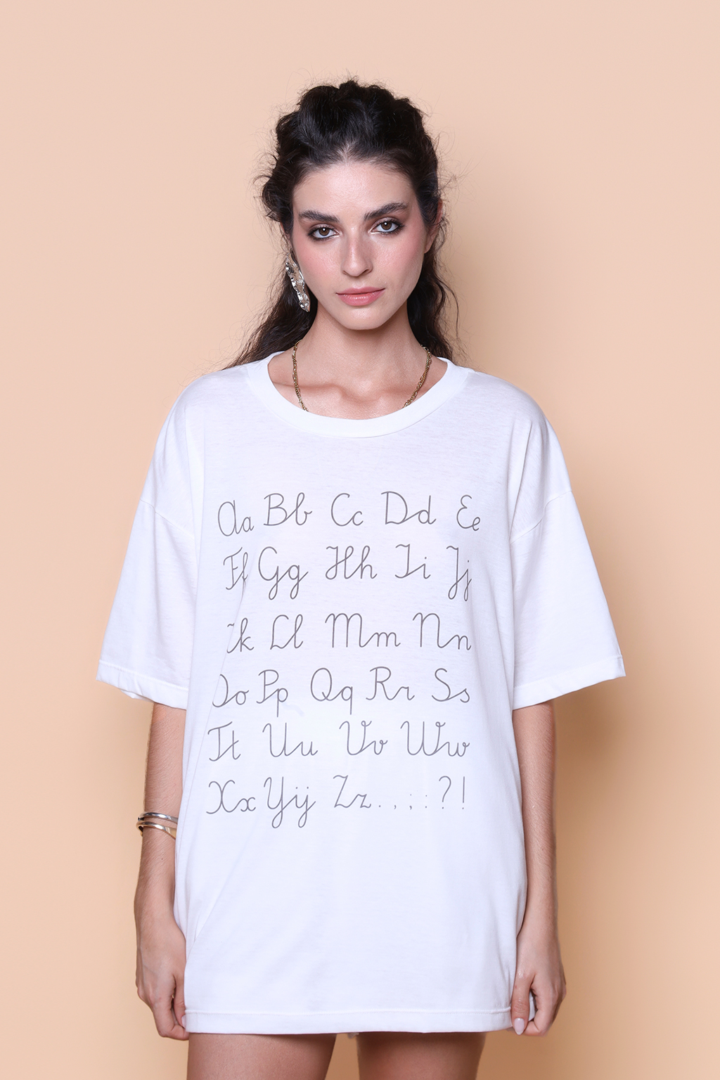 A camiseta oversize Abecedário é confeccionada em tecido meia malha de algodão, dando um toque mais macio e agradável. Além disso, tem como estampa um abecedário em letra cursiva.