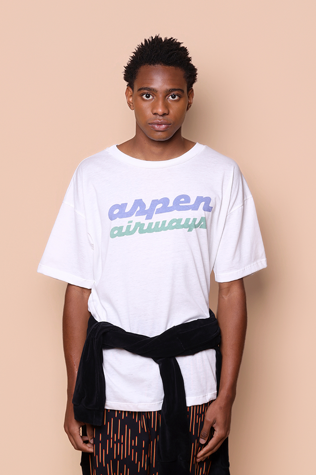 A camiseta oversize Aspen Airways é confeccionada em tecido meia malha de algodão, dando um toque mais macio e agradável. Além disso, tem como estampa o logo da empresa de aviação estadunidense Aspen Airways. A empresa era um filial regional da United Express, e tem como sede o hangar 5 do aeroporto internacional de Denver, Colorado. Fundada em 1952, a empresa encerrou suas operações em 1990, ao ser vendida e incorporada pela Mesa Airlines e Air Winsconsin Services Inc.