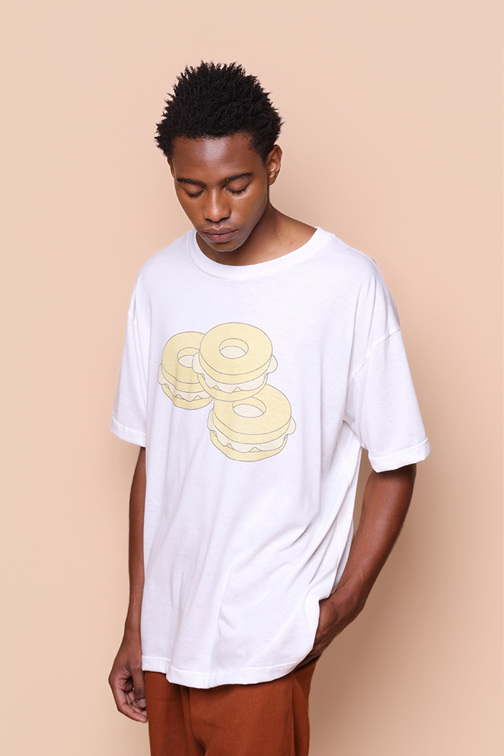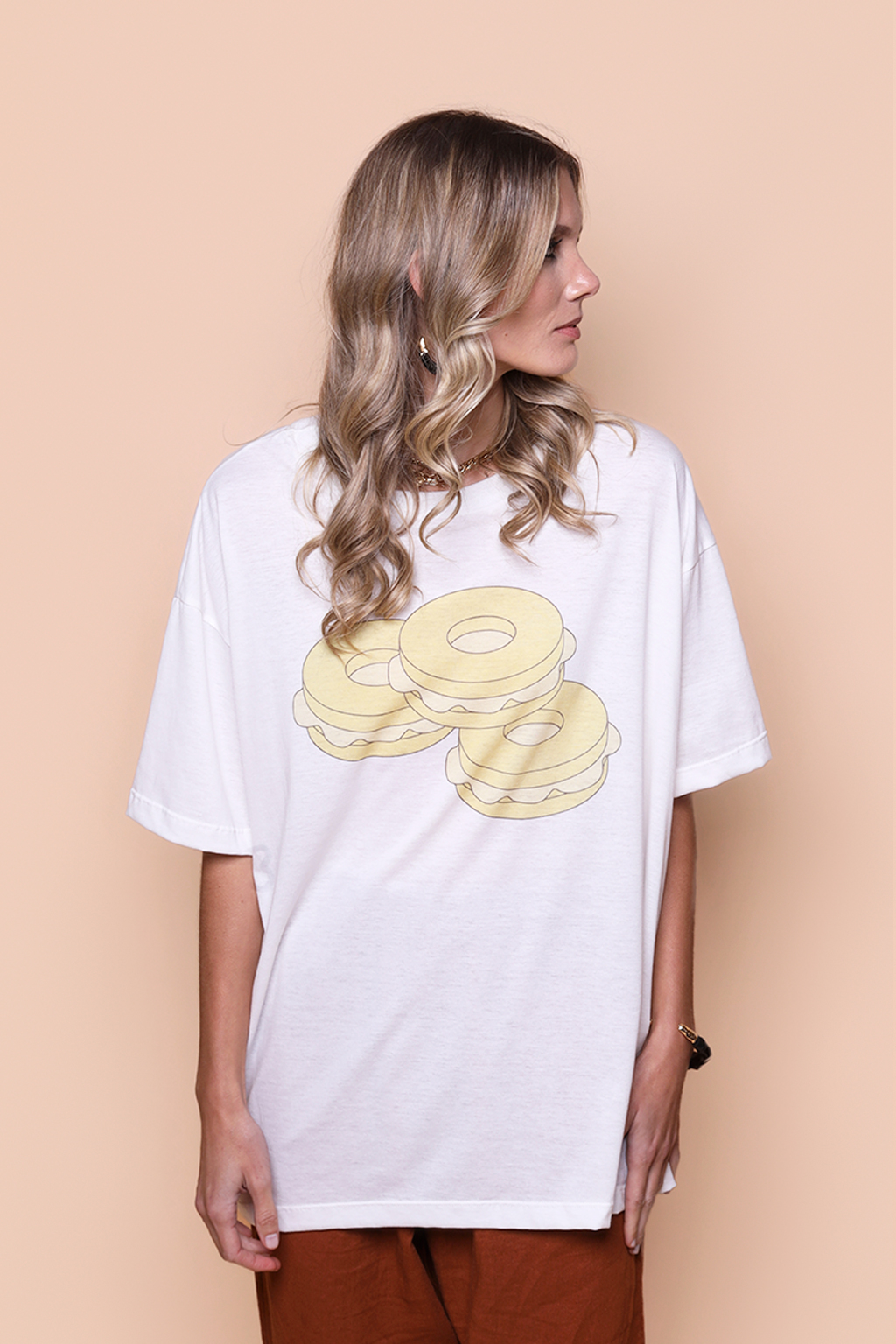 A camiseta oversize Bolachas é confeccionada em tecido meia malha de algodão, dando um toque mais macio e agradável. Além disso, tem como estampa três “bolachas” amarelas estilizadas.