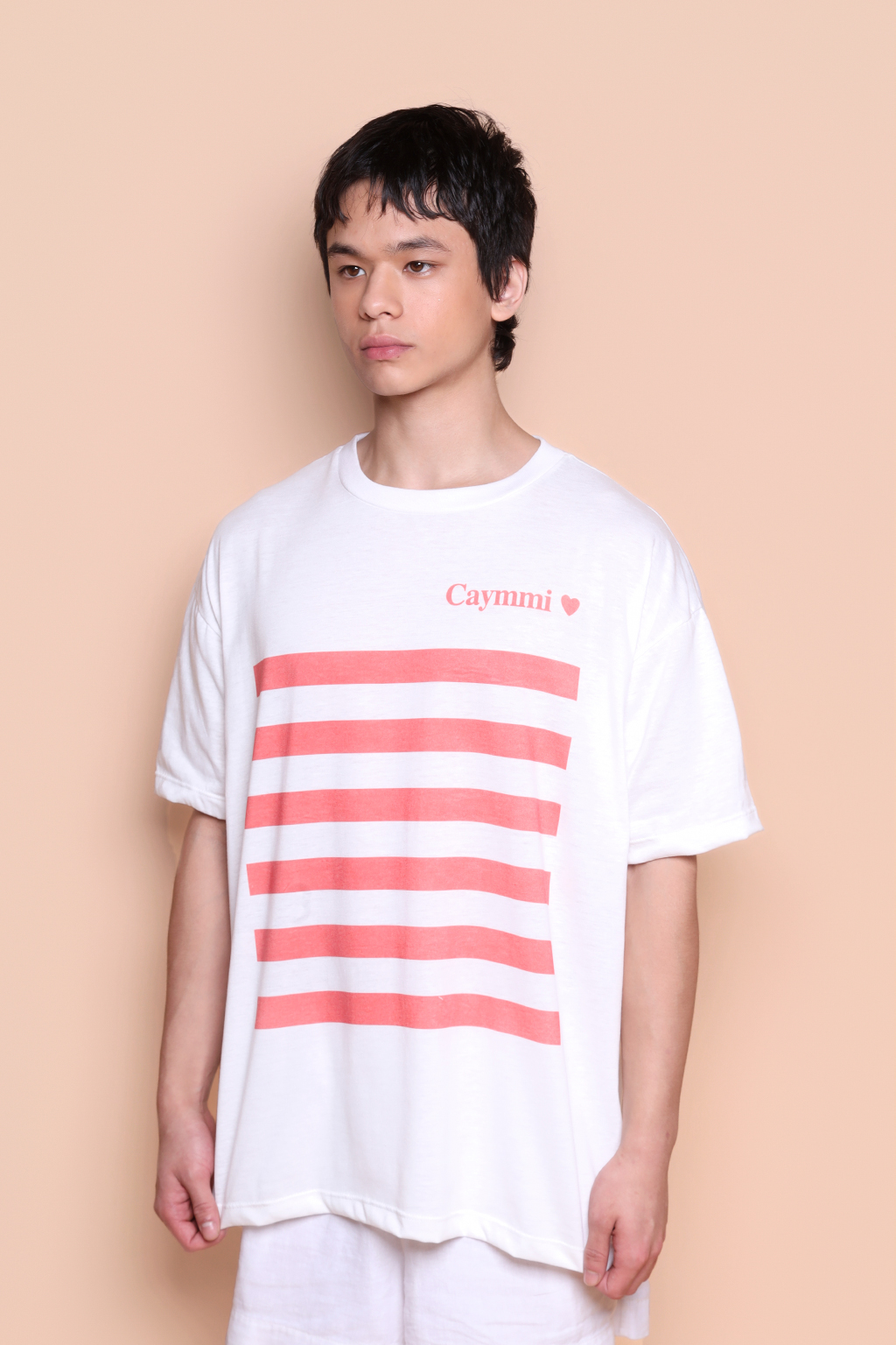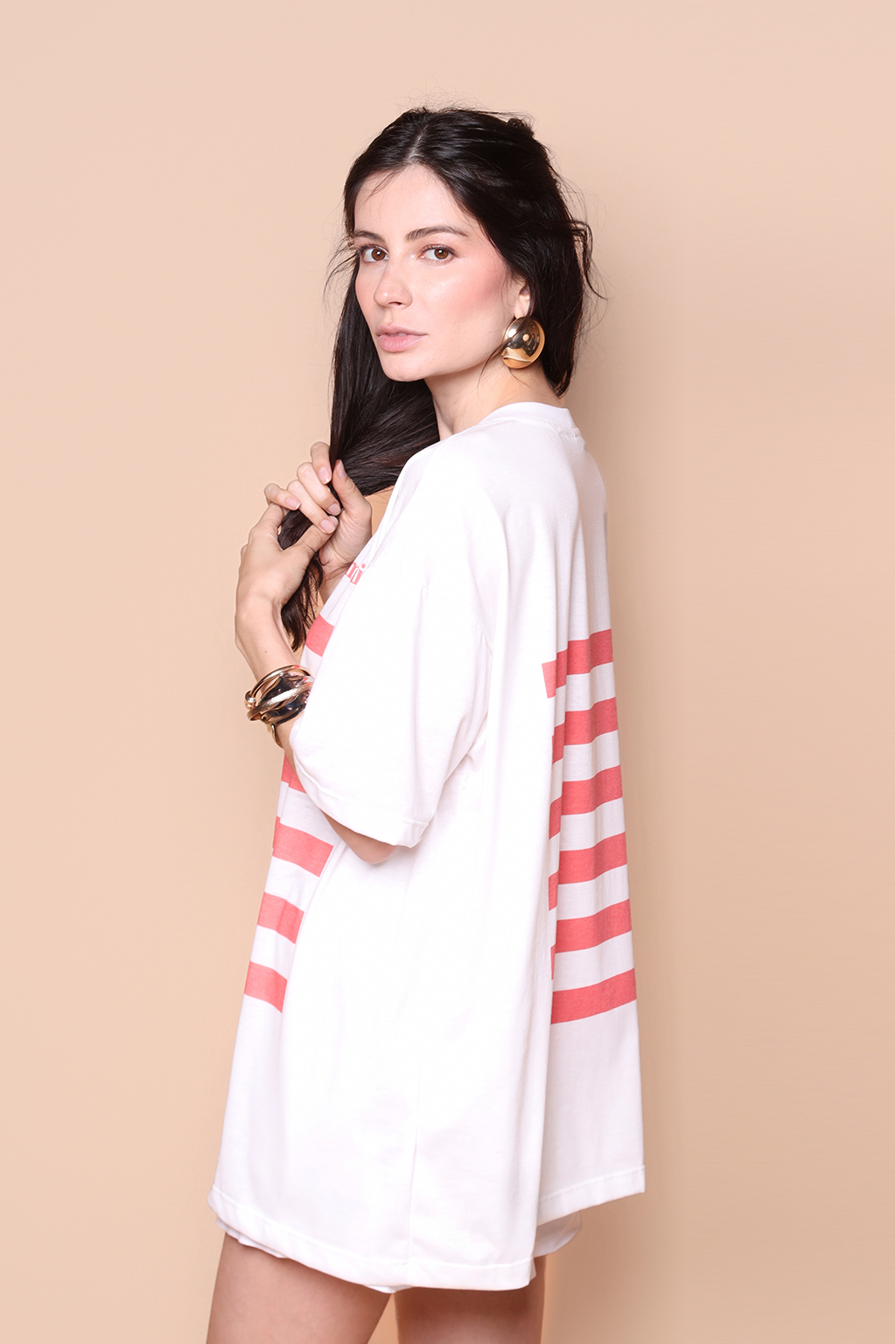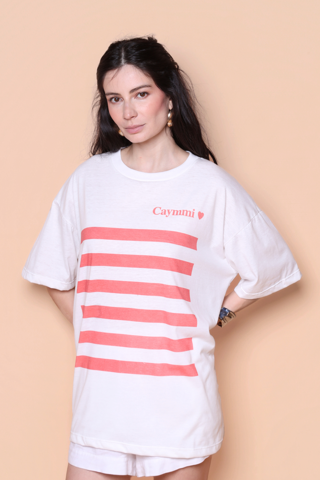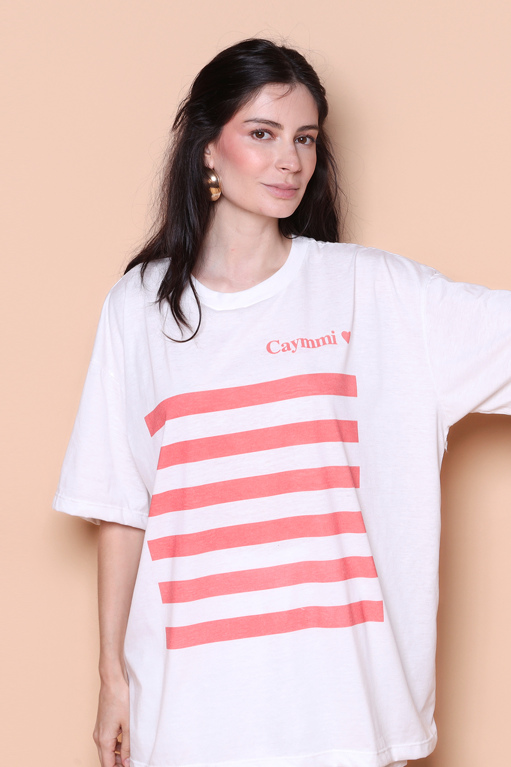Camiseta oversize estampada Caymmi. A modelo mede 1,72 e usa tamanho 1.