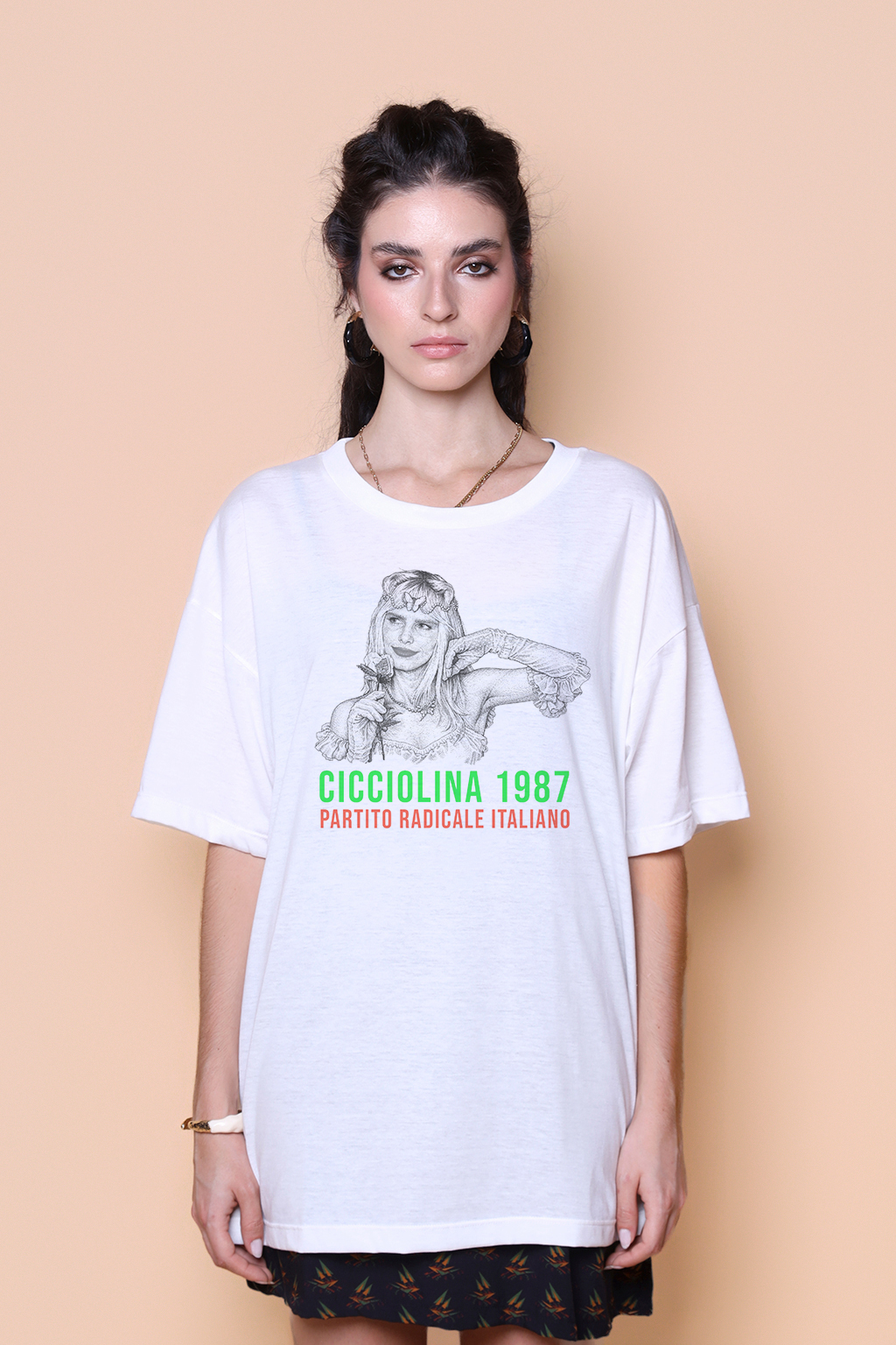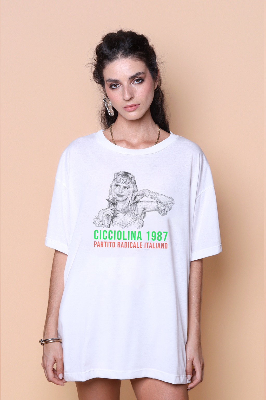 A camiseta oversize Cicciolina 1987 é confeccionada em tecido meia malha de algodão, dando um toque mais macio e agradável. Além disso, tem como estampa uma espécie de propaganda eleitoral para Cicciolina, nome artístico de Ilona Anna Staller, uma ex-atriz de filmes adultos que foi eleita para o parlamento italiano em 1987. Representando o distrito de Lácio de Roma, recebeu 20 mil votos e foi a segunda deputada mais votada de seu partido. Suas principais bandeiras eram a luta contra a energia nuclear e contra a OTAN.