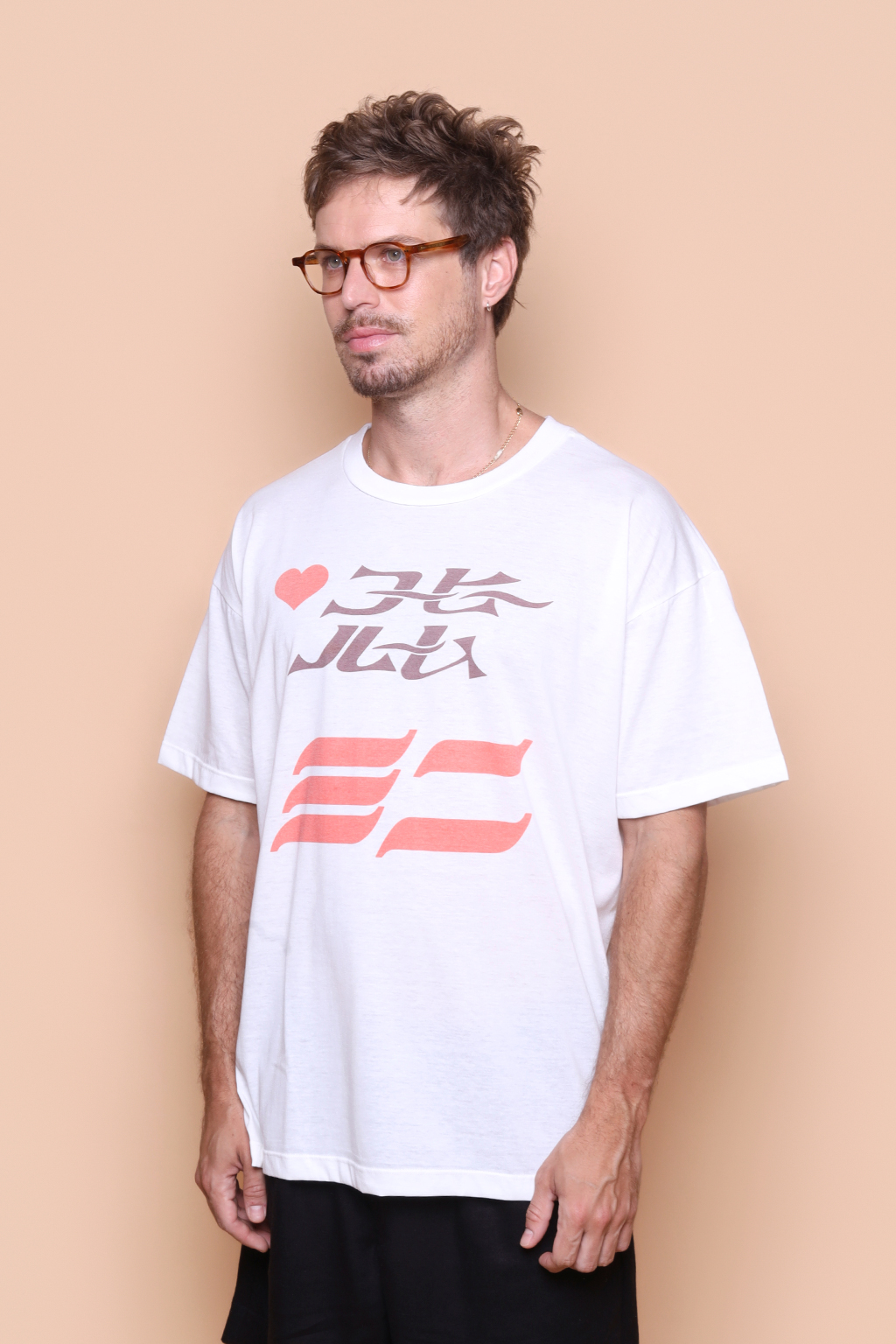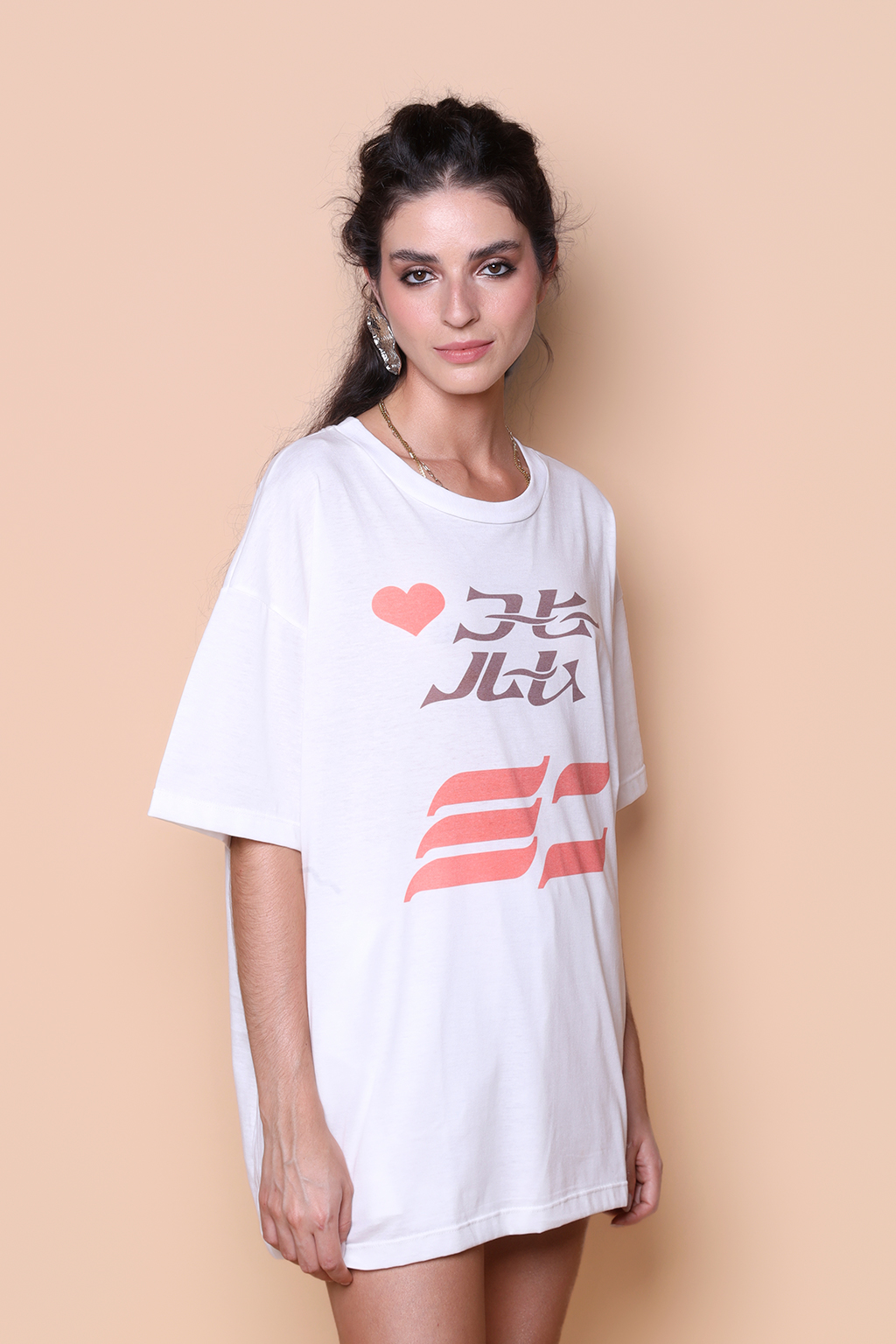 Camiseta oversize estampada Coração. Ambos modelos vestem tamanho 1.