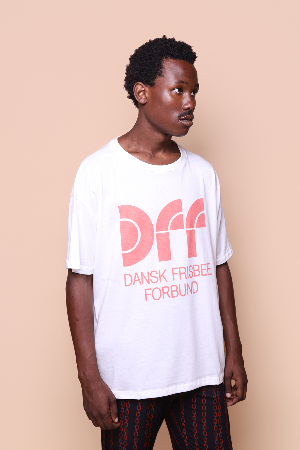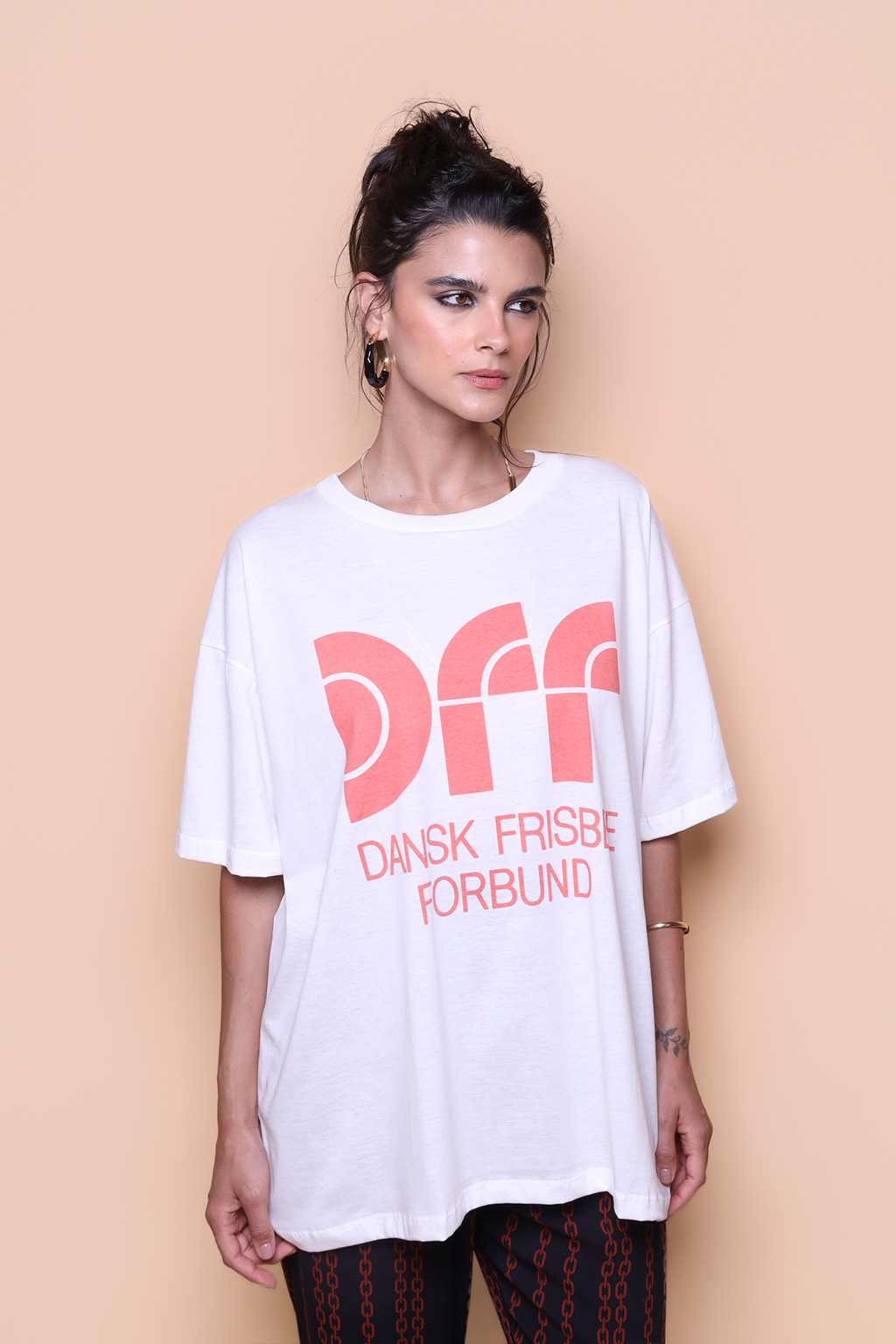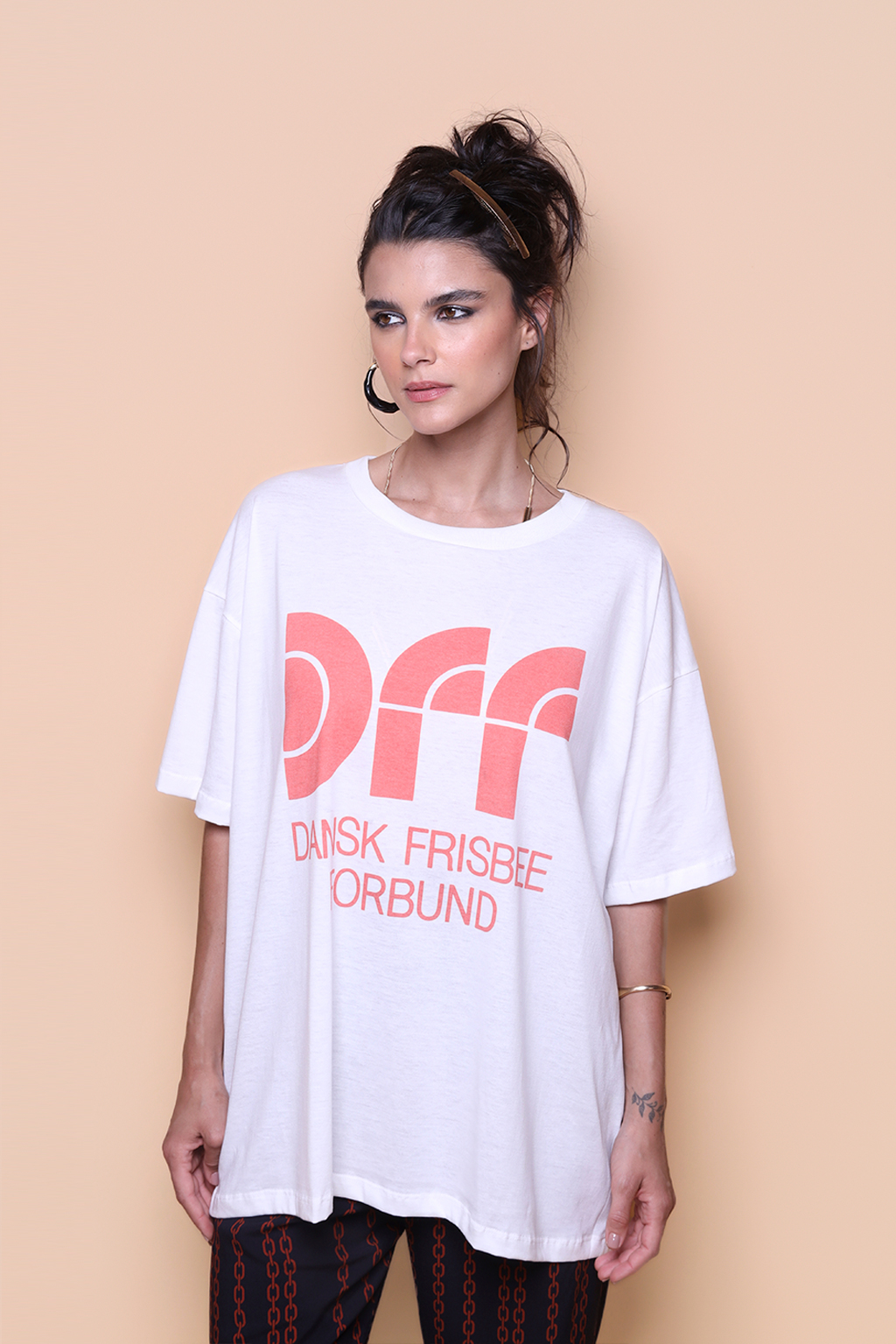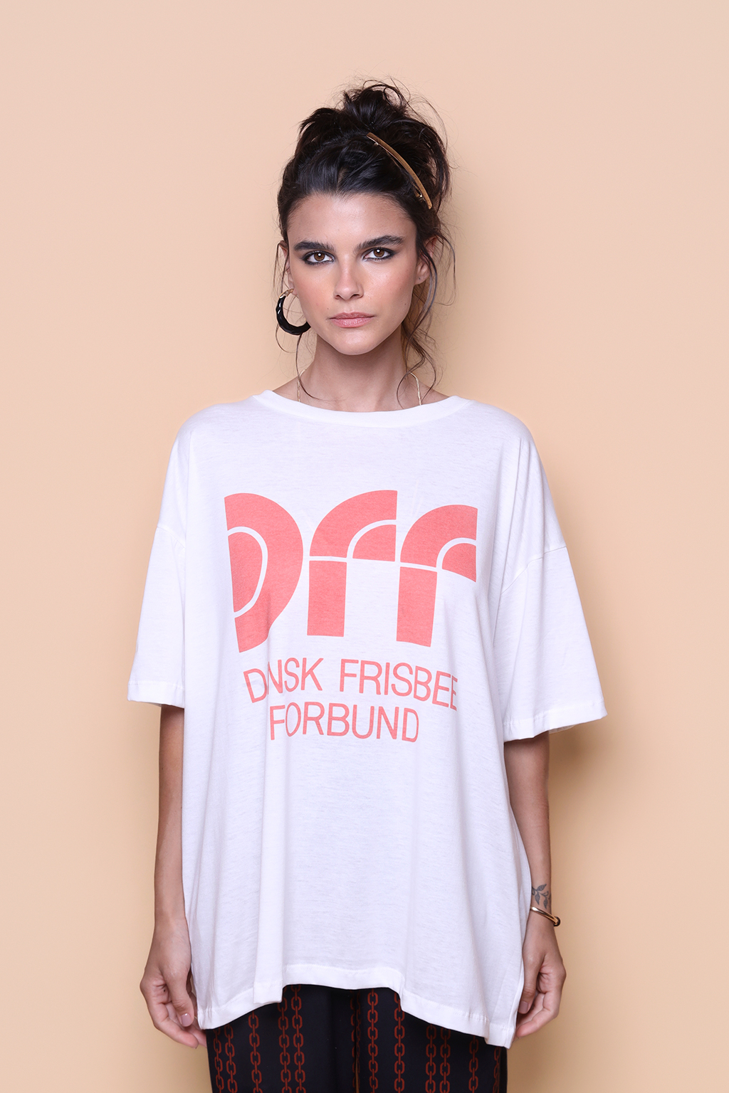 A camiseta oversize DFF é confeccionada em tecido meia malha de algodão, dando um toque mais macio e agradável. Além disso, tem como estampa o escudo da DFF (Dansk Frisbee Forbund – Associação Dinamarquesa de Frisbee). Como conhecemos hoje, o frisbee surgiu em 1957, porém sua primeira aparição na história data de 1871, quando William Frisbie abriu a Frisbie Pie Company, e estudantes universitários arremessavam as caixas de torta vazias entre si, gritando “frisbee!”.