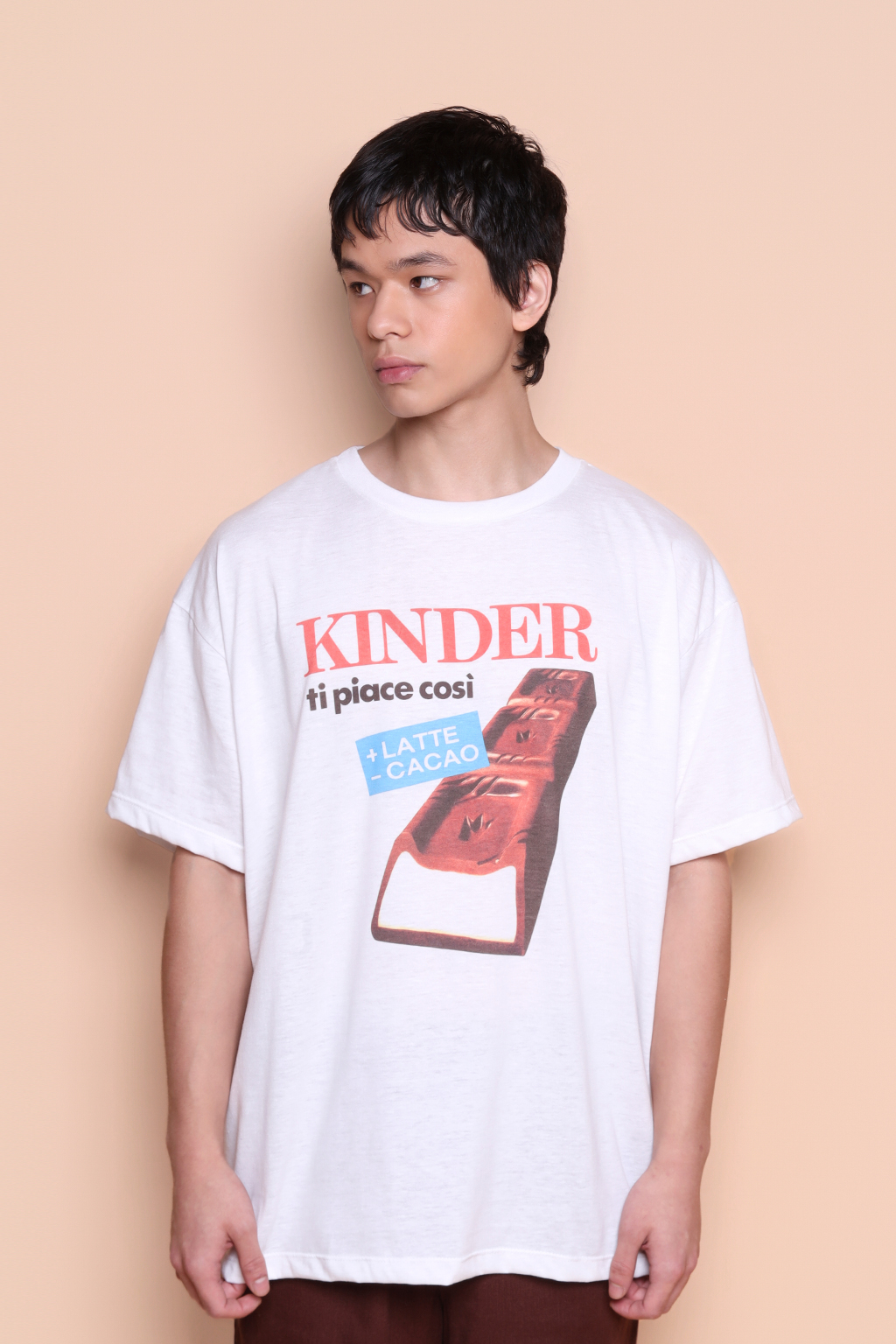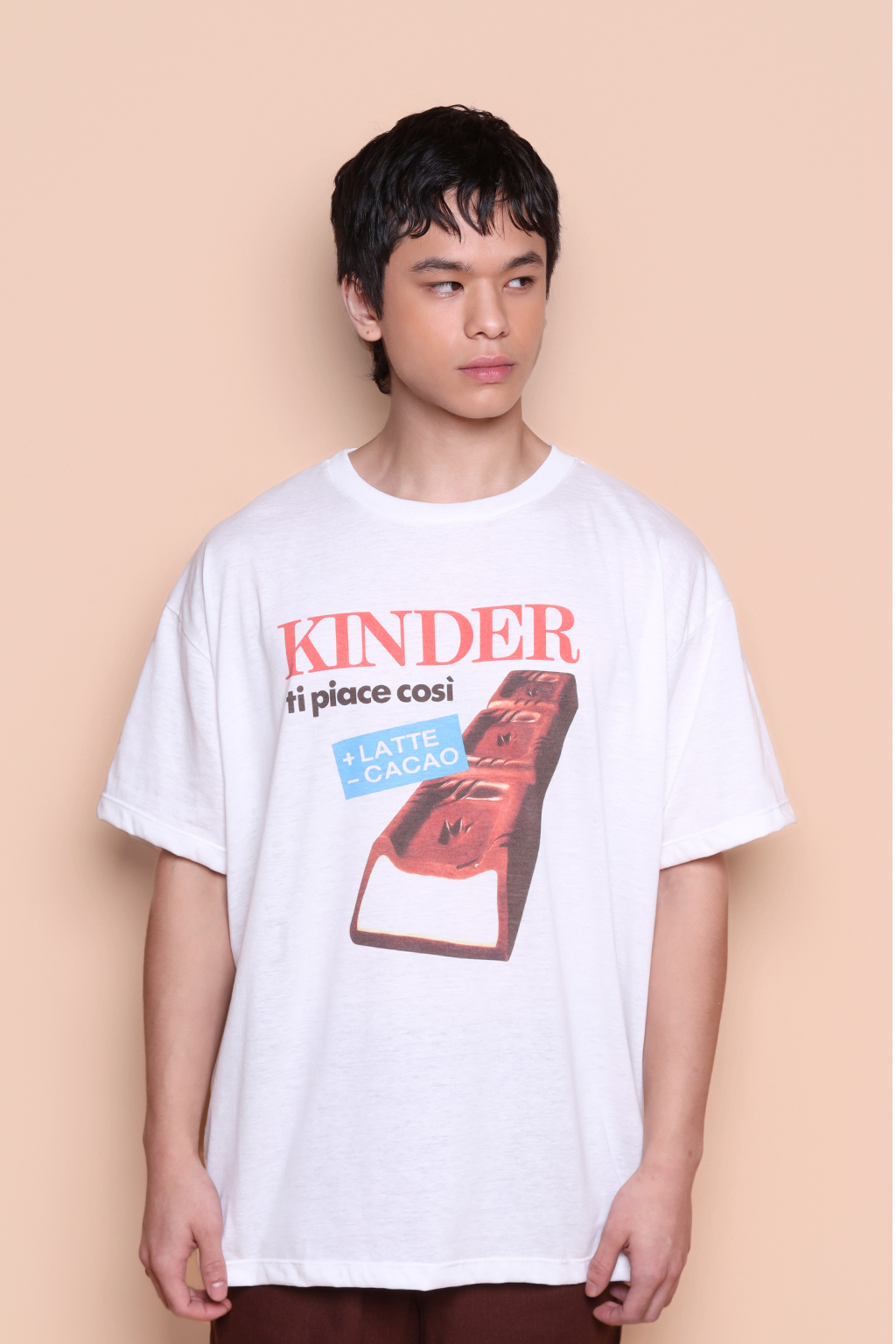 A camiseta oversize Ferrero Kinder é confeccionada em tecido meia malha de algodão, dando um toque mais macio e agradável. Além disso, tem como estampa uma peça publicitária do Kinder, chocolate italiano da Ferrero, lançado em 1968. O slogan “+ leite, – cacau” buscava reconfortar e mostrar às que seu produto era o melhor para as crianças. Além disso, tem a frase em italiano “Ti piase cosi”, que pode ser traduzida para “Vocês gostam assim”.