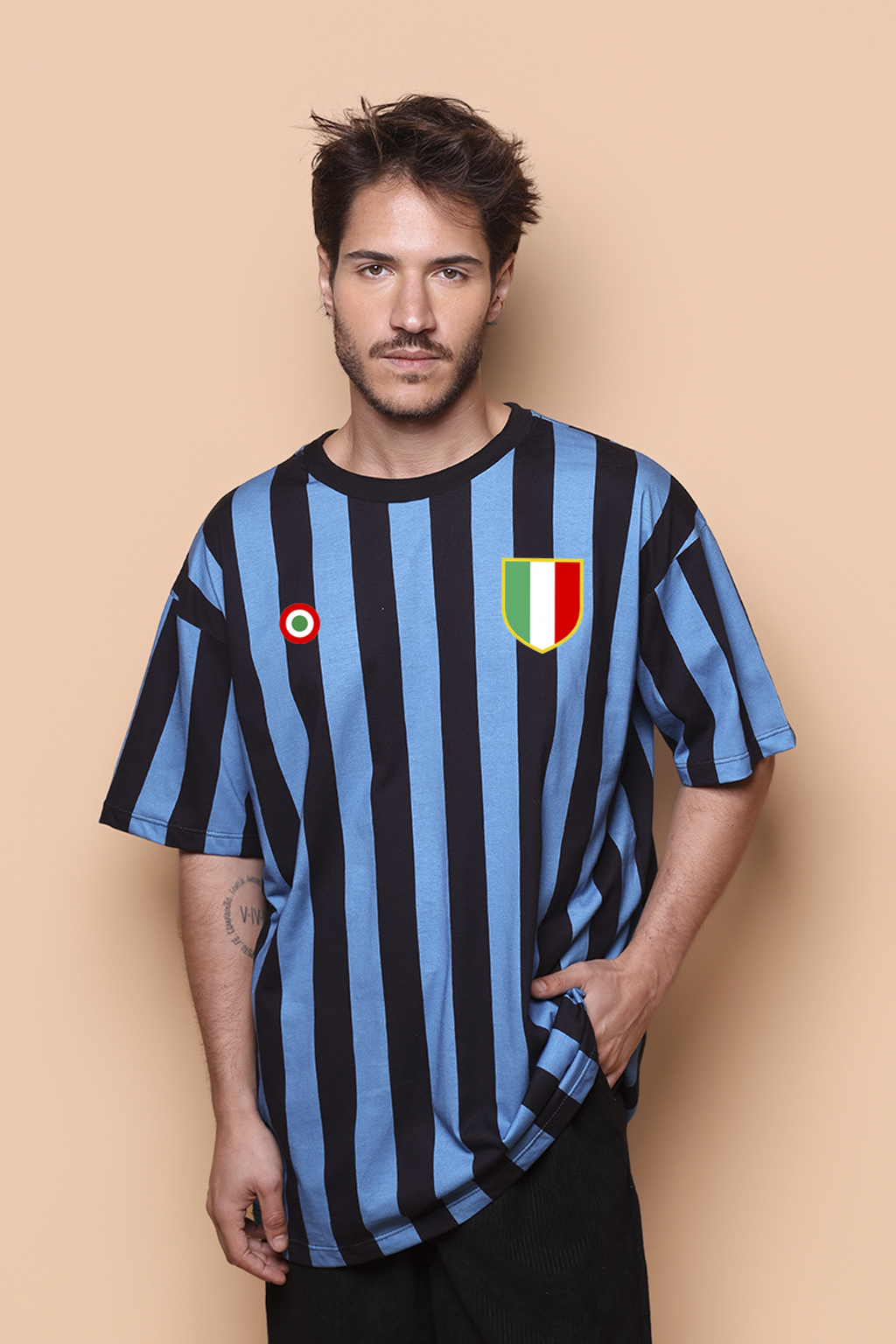 A camiseta oversize Internazionale é confeccionada em tecido meia malha de algodão, dando um toque mais macio e agradável. Além disso, tem como estampa o uniforme principal do Football Club Internazionale Milano, a Inter de Milão, fundada em 1908. O uniforme de 1980 marca uma transição histórica no esporte como um todo, esta foi a última temporada antes da introdução dos patrocínios master nas camisas de futebol. O modelo tem listras azuis e pretas (“Nerazzurri”, daí a origem do apelido do time, os “pretos e azuis”). O uniforme também tem estes dois emblemas, a Cocarda (Coccarda), círculo vermelho (à direita do peito) que indica que o clube foi campeão da Copa da Itália, e o Escudeto (Scudetto), localizado à esquerda do peito, brasão utilizado pelo campeão da Liga Italiana.