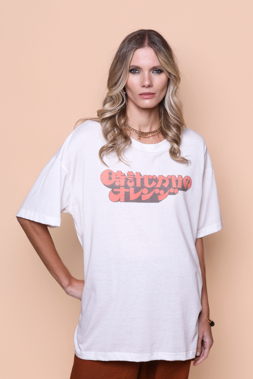 A camiseta oversize Laranja Mecânica é confeccionada em tecido meia malha de algodão, dando um toque mais macio e agradável. Além disso, tem como estampa o logo do filme Laranja Mecânica em japonês. Lançado em 1971 e dirigido por Stanley Kubrick baseado no romance de mesmo nome escrito por Anthony Burguess. O escritor vendeu os direitos cinematográficos de seu romance por 500 doláres, e, originalmente, era projetado para estrelar a banda Rolling Stones.