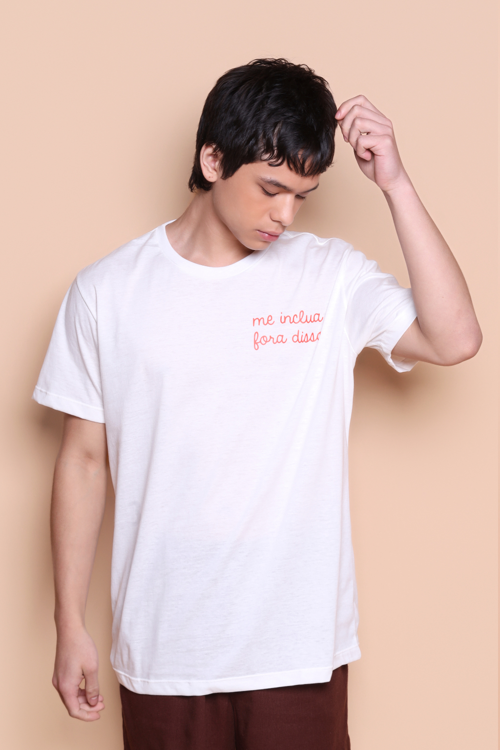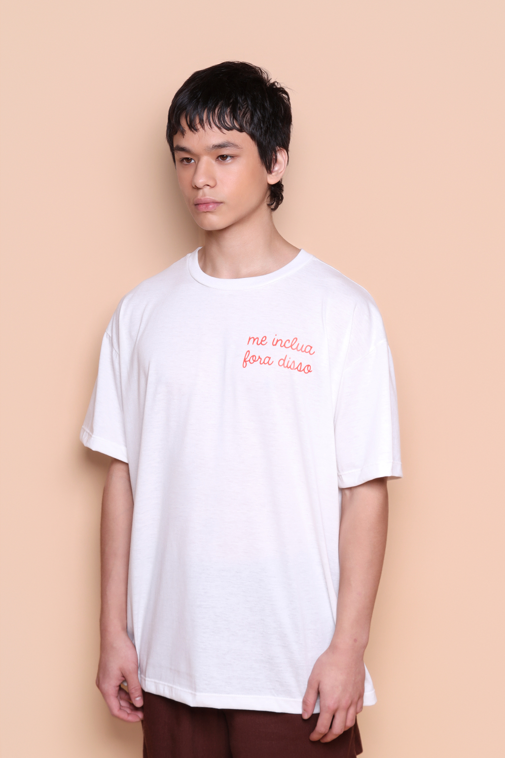 A camiseta oversize Me inclua fora disso é confeccionada em tecido meia malha de algodão, dando um toque mais macio e agradável. Além disso, tem como estampa a frase “me inclua fora disso”, localizado à esquerda do peito. Essa frase brinca com o oxímoro (combinação de duas palavras de sentidos opostos) “incluir fora”.