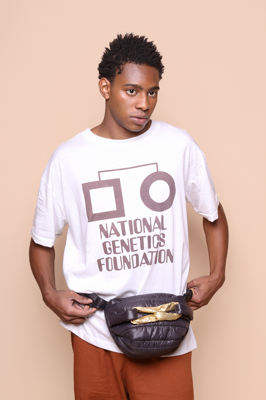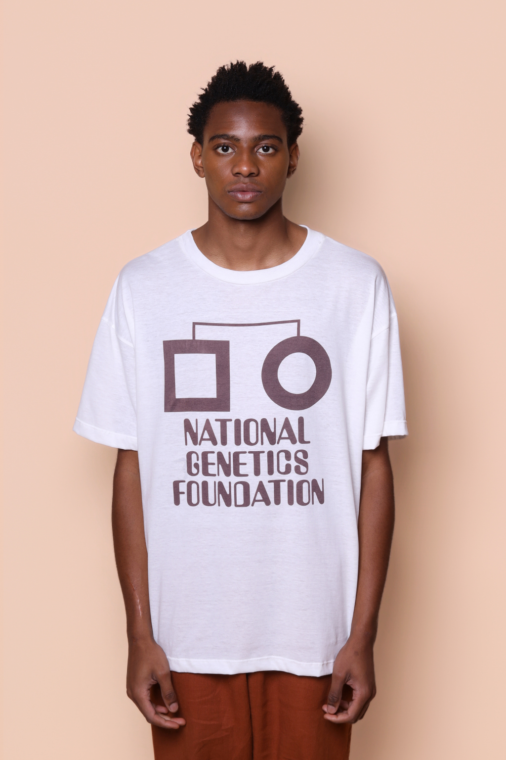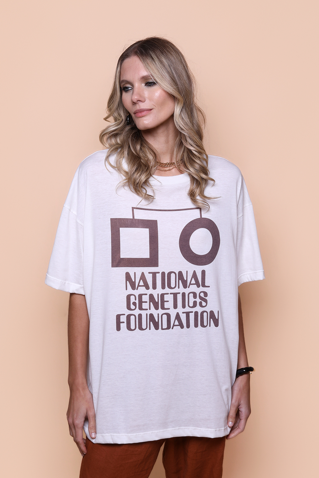 A camiseta oversize NGF é confeccionada em tecido meia malha de algodão, dando um toque mais macio e agradável. Além disso, tem como estampa um heredograma com a frase “National Genetics Foundation” logo abaixo, que pode ser traduzida para “Fundação Nacional de Genética”.
