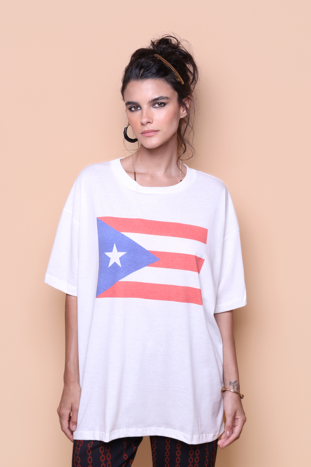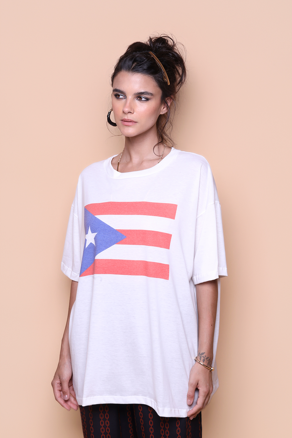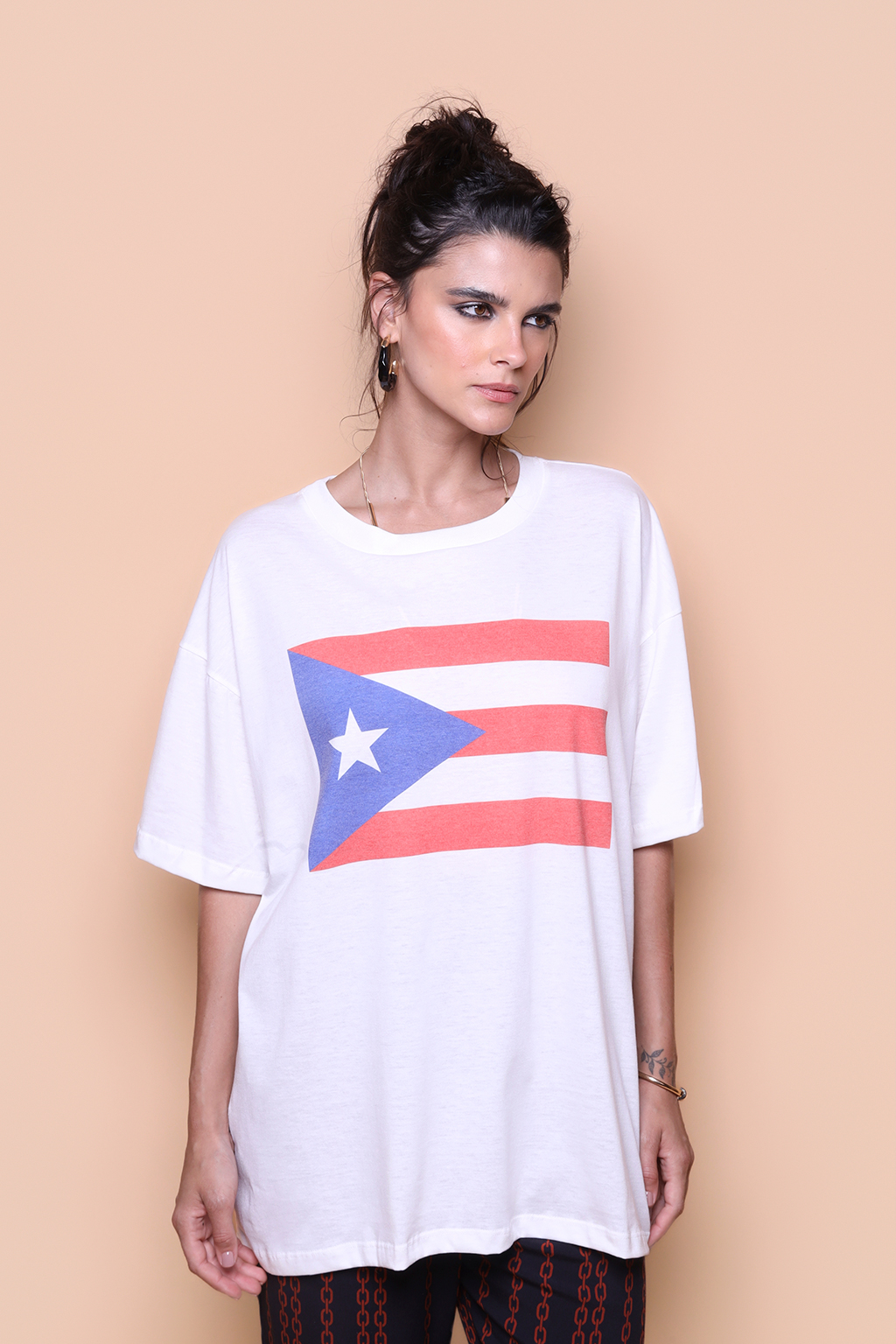 A camiseta oversize Porto Rico é confeccionada em tecido meia malha de algodão, dando um toque mais macio e agradável. Além disso, tem como estampa a bandeira de Porto Rico. Oficialmente Estado Livre Associado de Porto Rico, é um território não incorporado dos EUA, localizado no Mar do Caribe. O território é um arquipélago composto por diversas ilhas menores, como Mona, Culebra e Vieques, além da ilha maior de Porto Rico.
