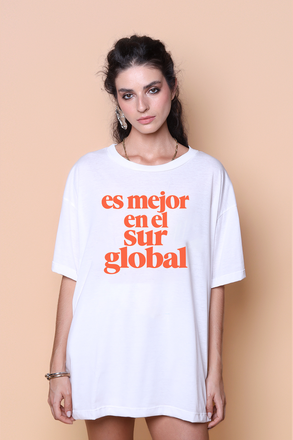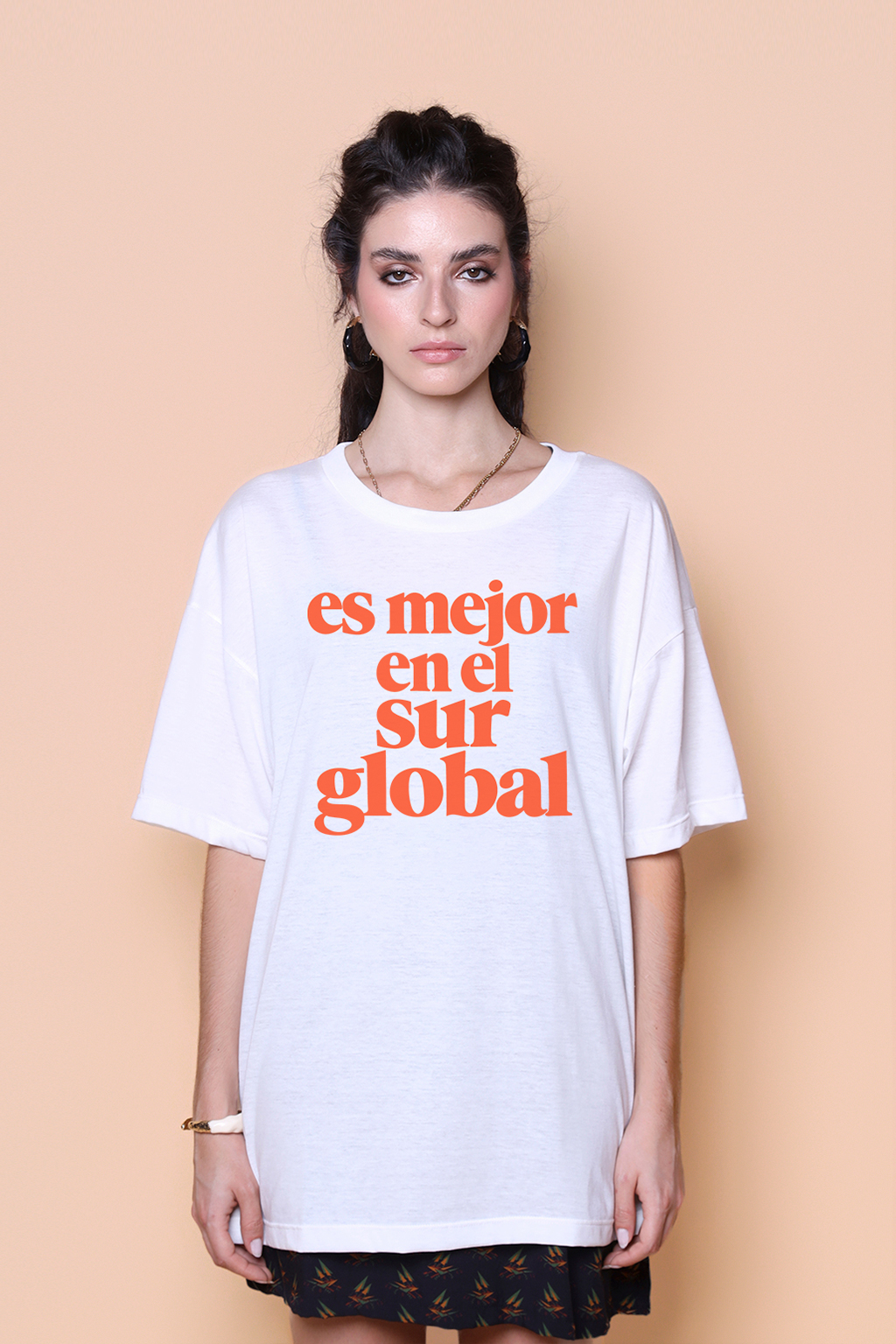 A camiseta oversize Sur global é confeccionada em tecido meia malha de algodão, dando um toque mais macio e agradável. Além disso, tem como estampa uma frase em espanhol “es mejor en el sur global”, que pode ser traduzida para “é melhor no sul global”.