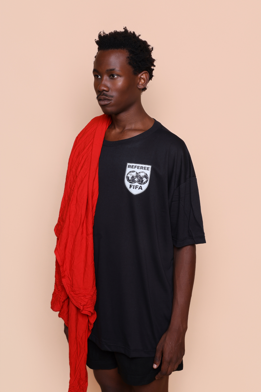 Camiseta oversize preta Árbitro. Ambos os modelos vestem tamanho 1.