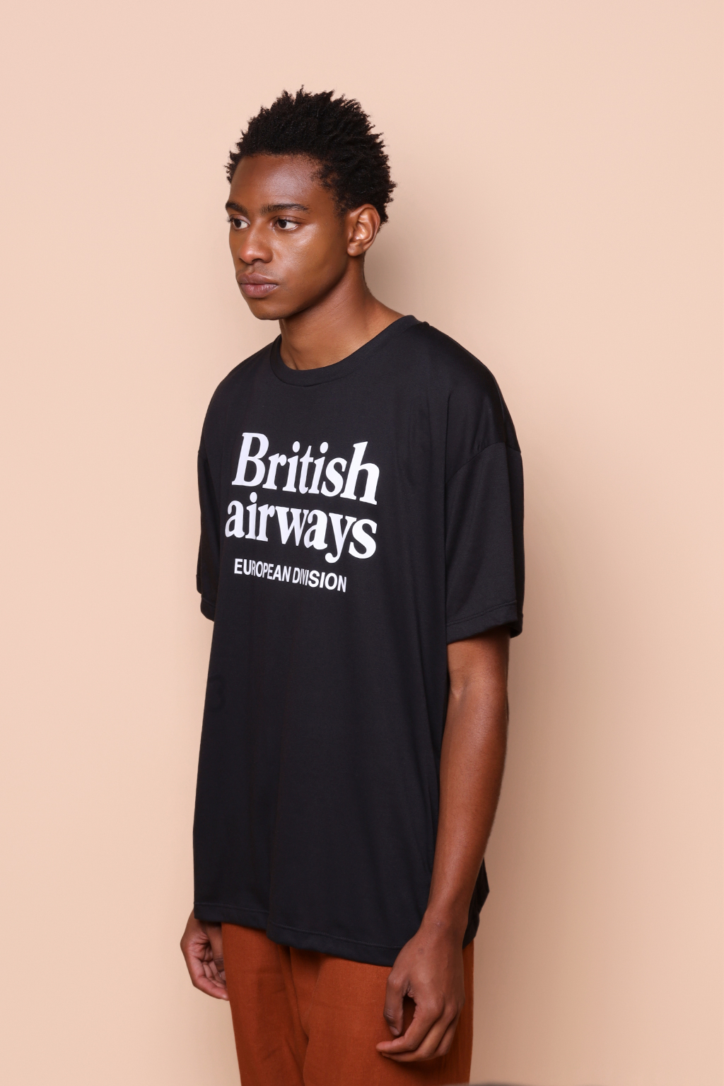 Camiseta oversize preta estampada British Airways. A modelo mede 1,72 e o modelo mede 1,78 e ambos usam tamanho 1.