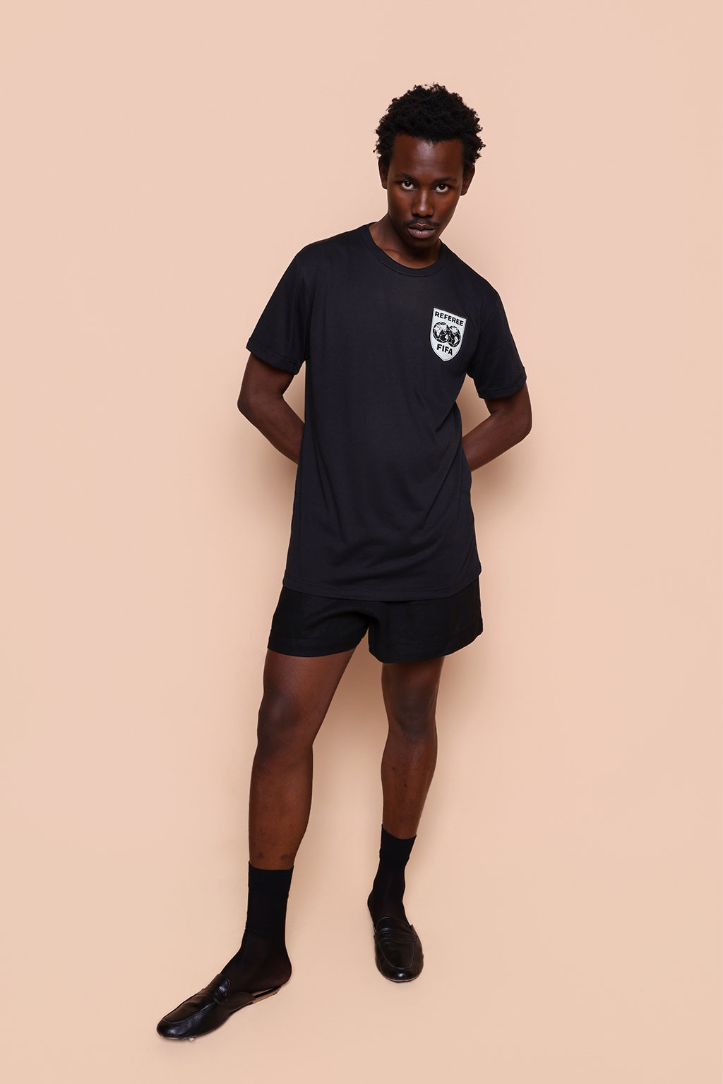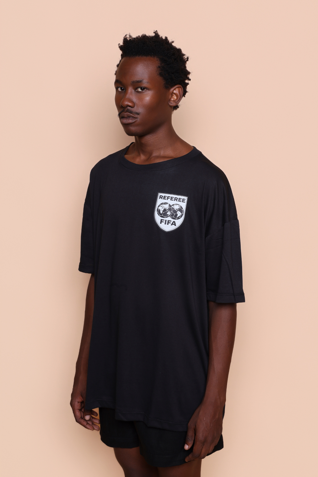 Camiseta preta Árbitro. Ambos os modelos vestem tamanho P.