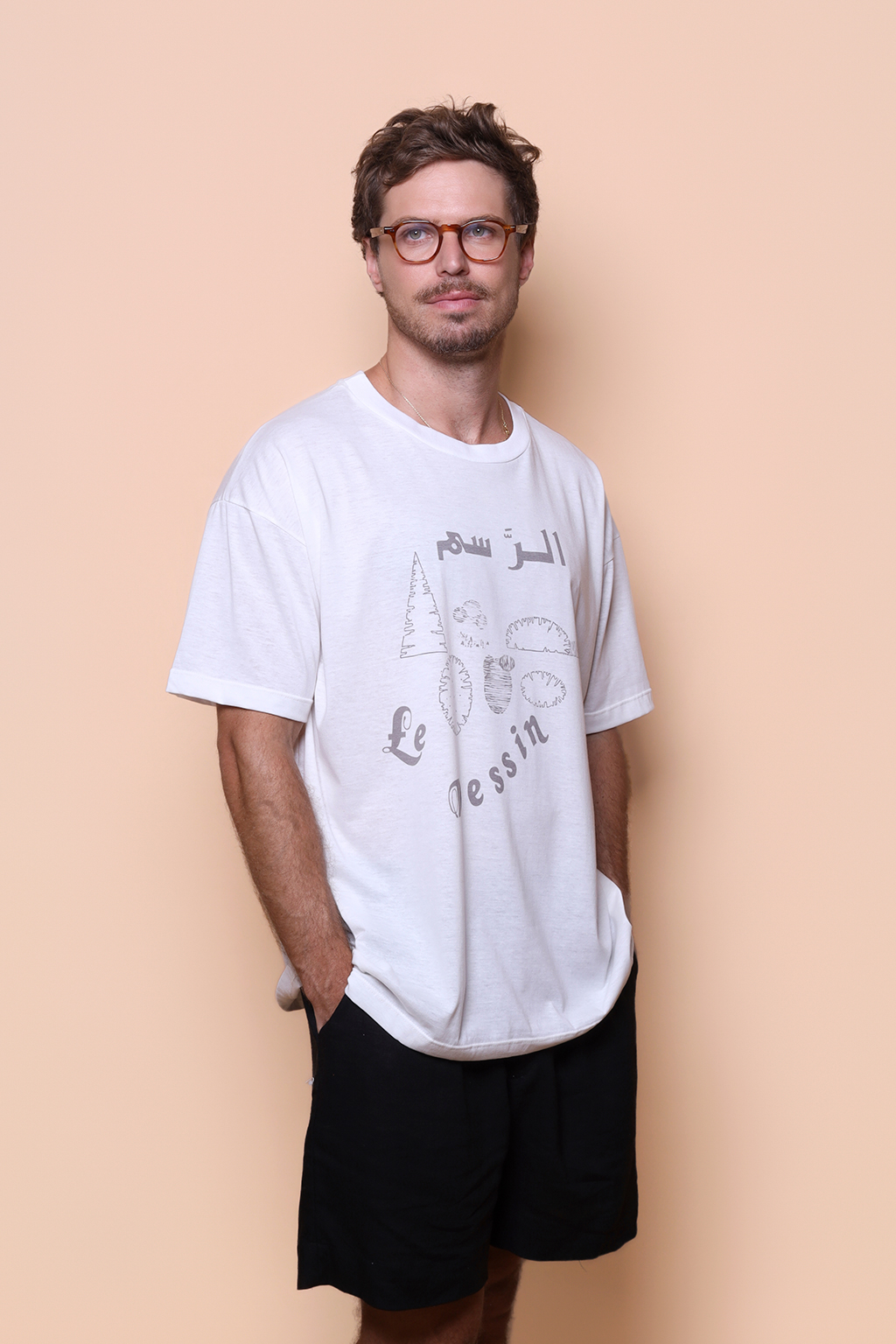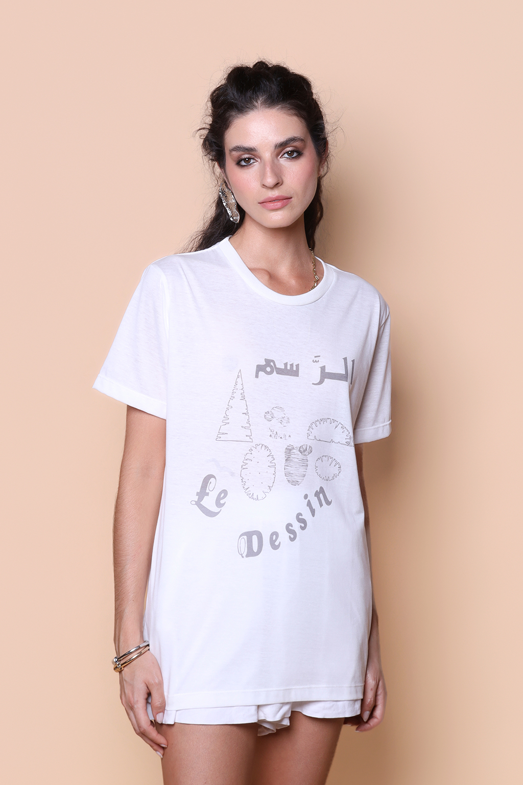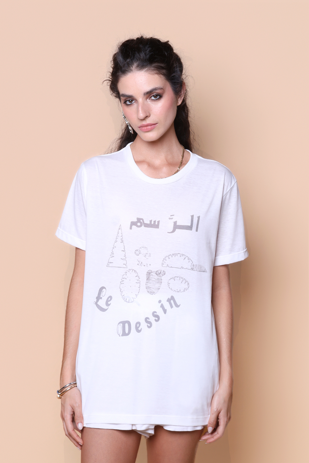 A camiseta Le Dessin é confeccionada em tecido meia malha de algodão, dando um toque mais macio e agradável. Além disso, tem como estampa desenhos de formas estilizadas com a frase “o desenho” escrita em árabe e francês.