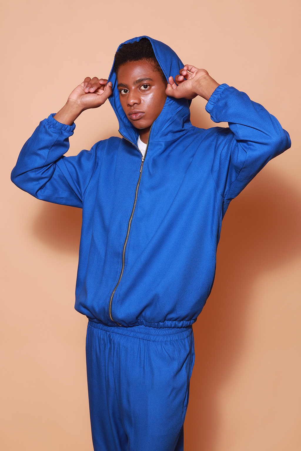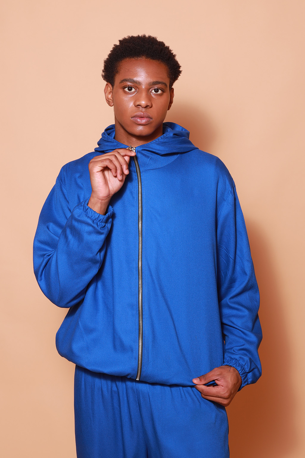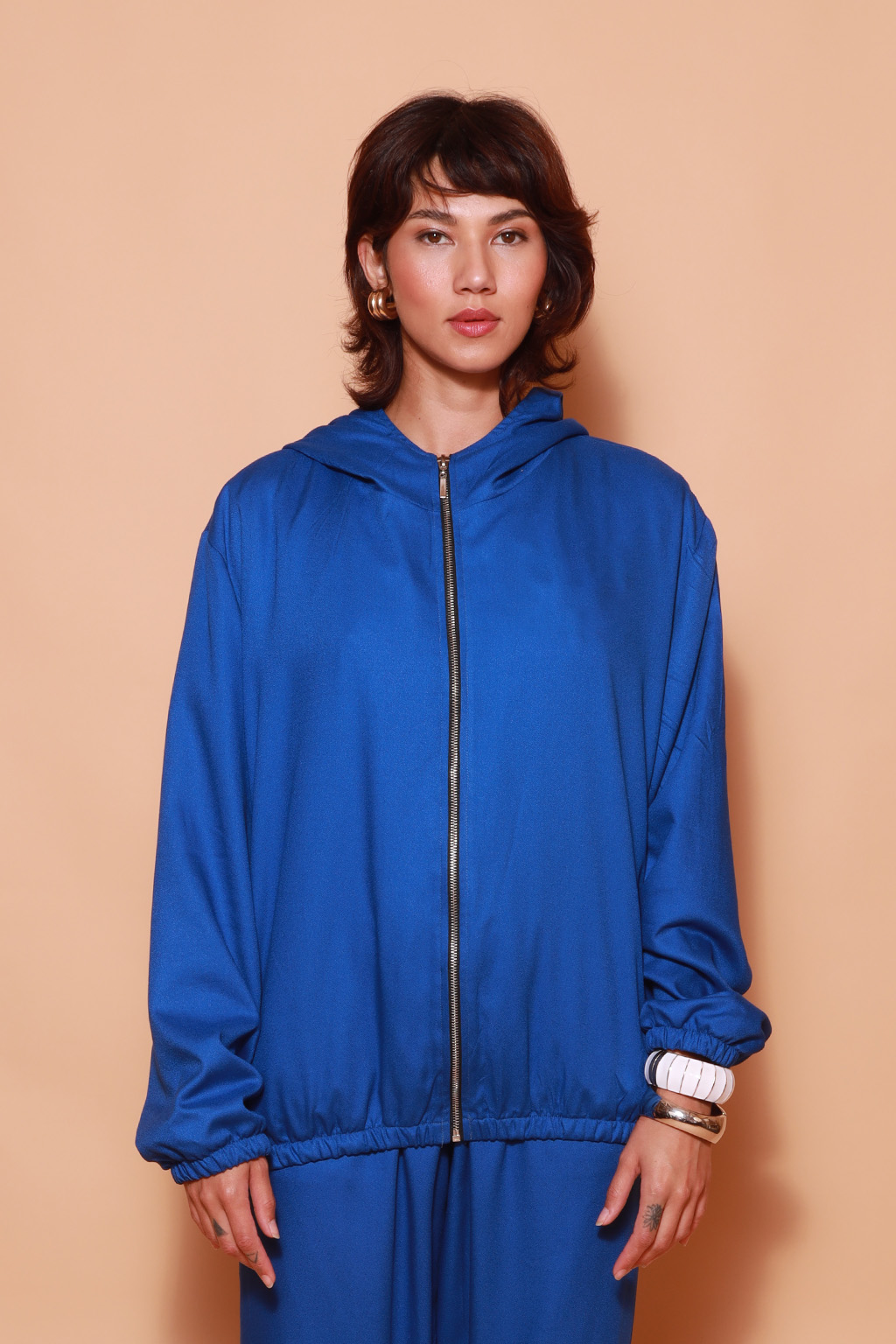 Jaqueta capuz azul estampada AIFF DTF. A modelo mede 1,74 e o modelo mede 1,78 e ambos usam tamanho P.