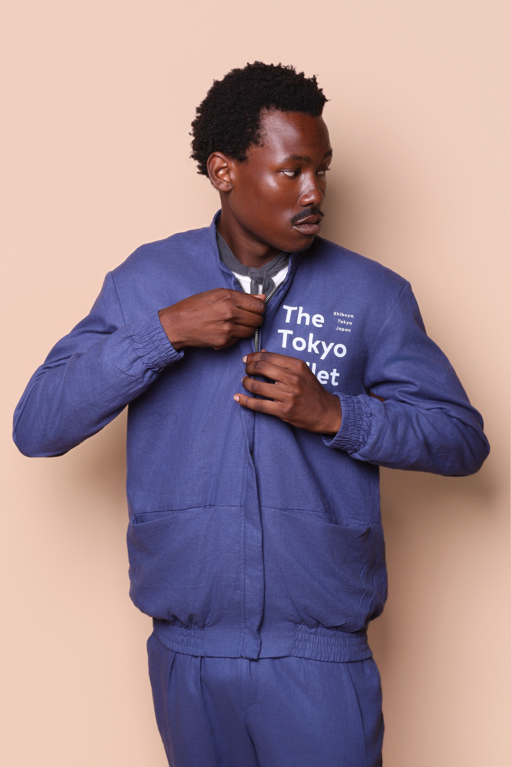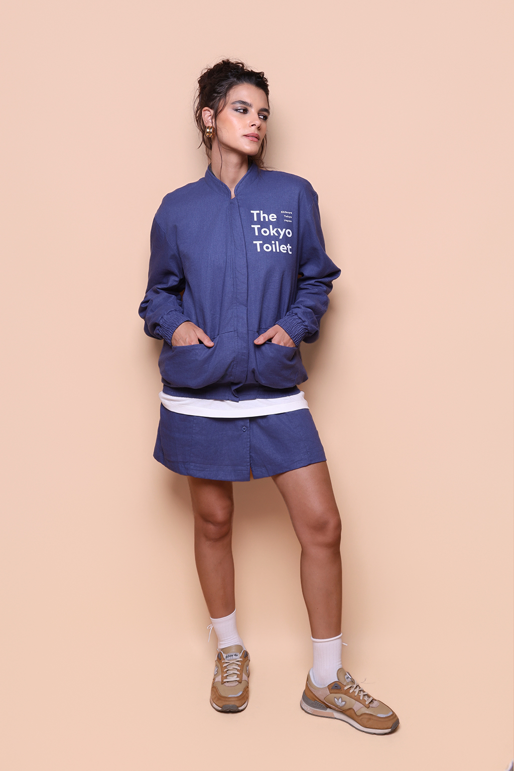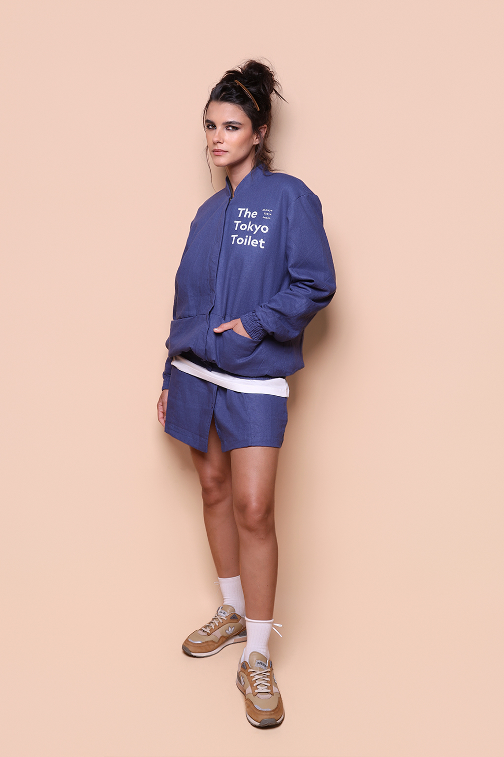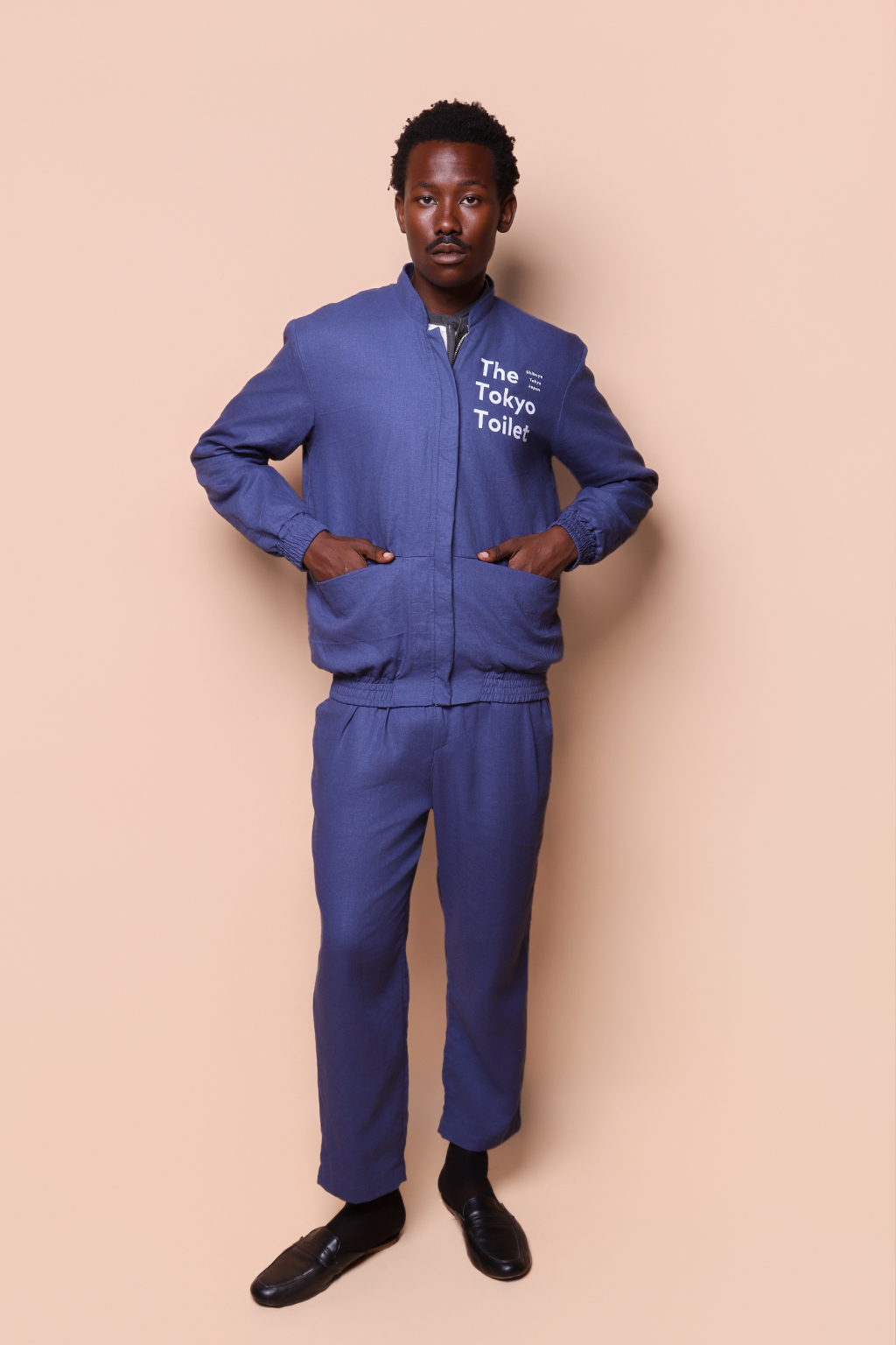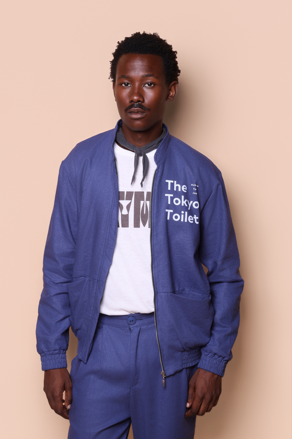 Jaqueta linho azul índigo Tokyo Toilet. Ambos os modelos vestem tamanho P.