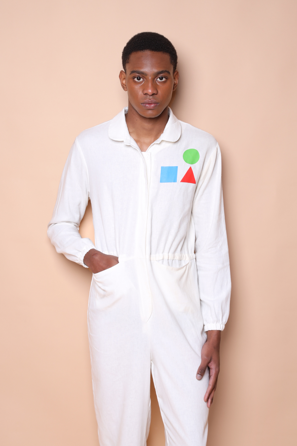 Macacão acinturado linho off-white Formas. A modelo mede 1,72 e o modelo mede 1,78 e ambos usam tamanho P