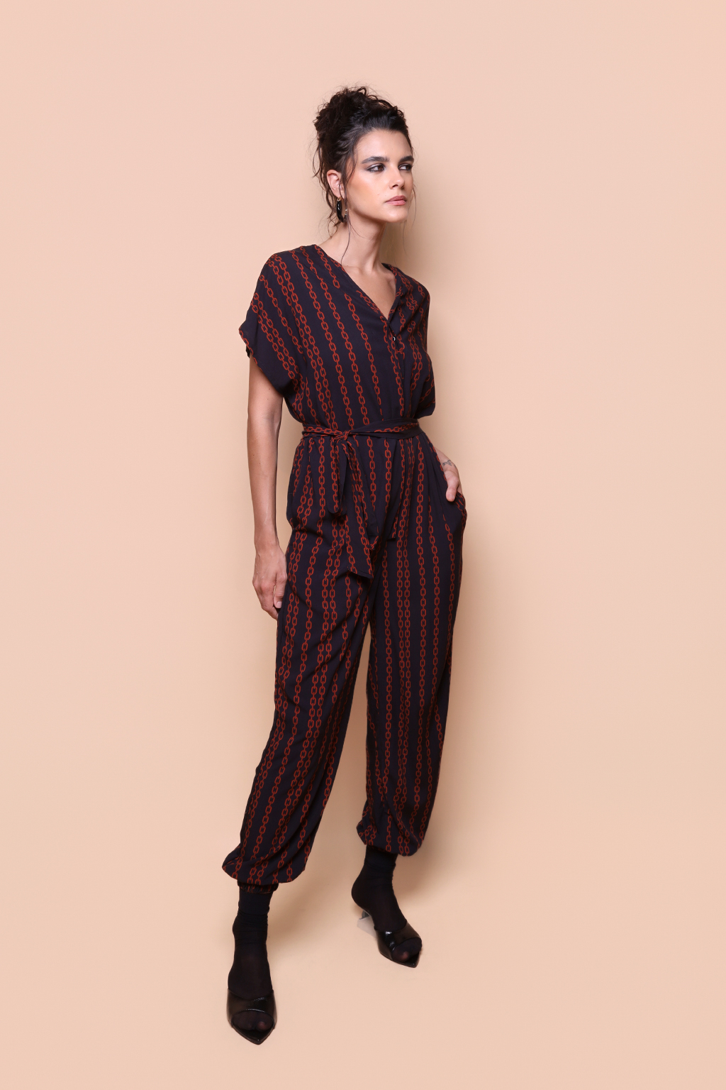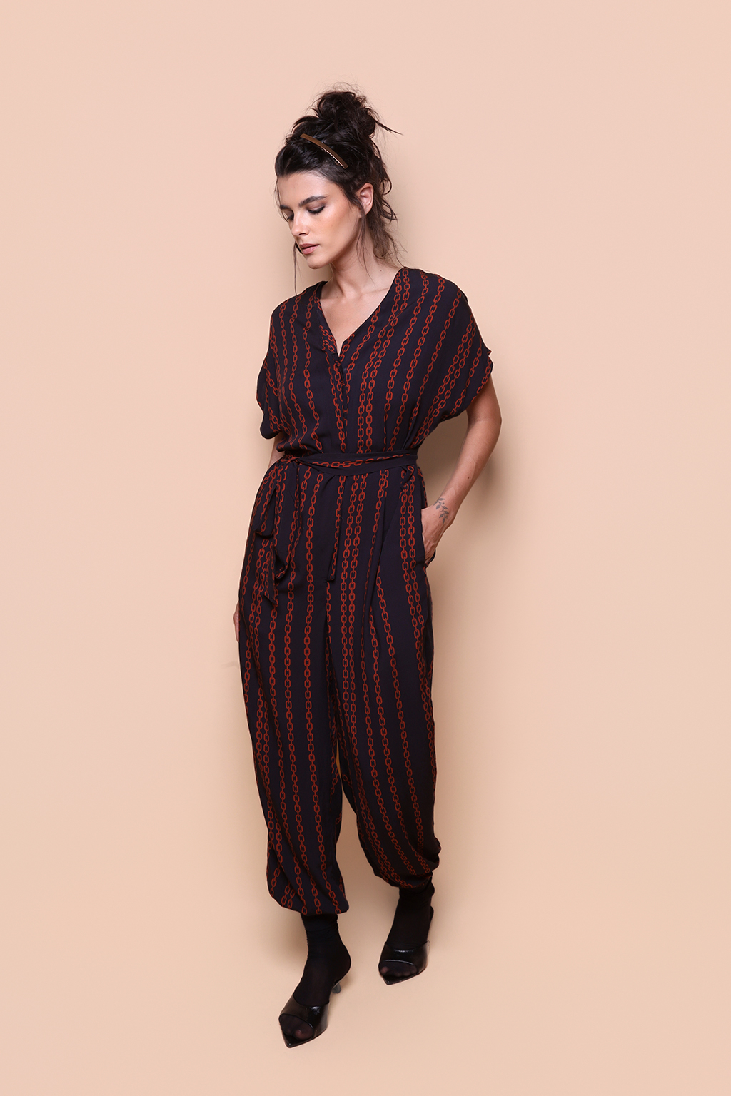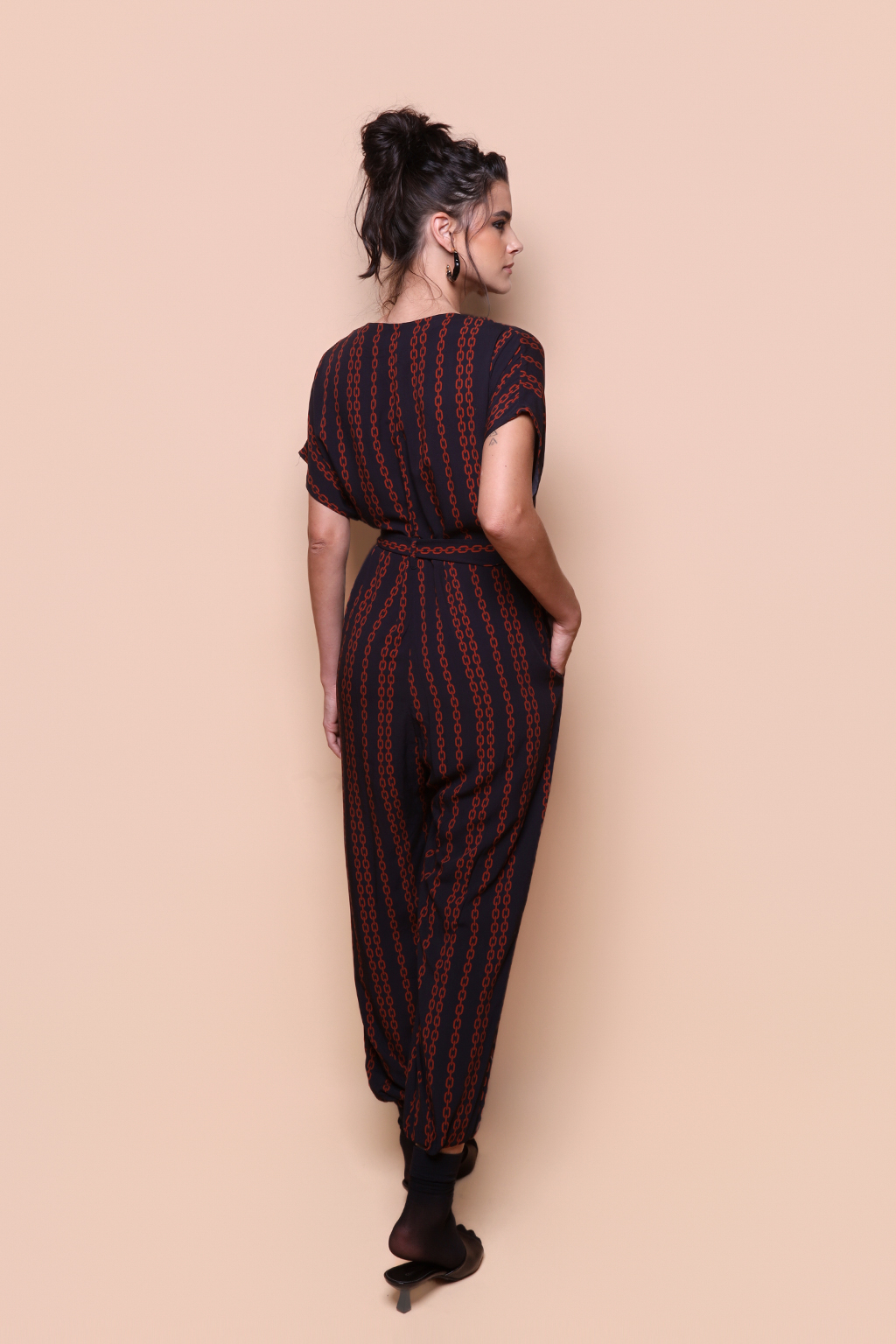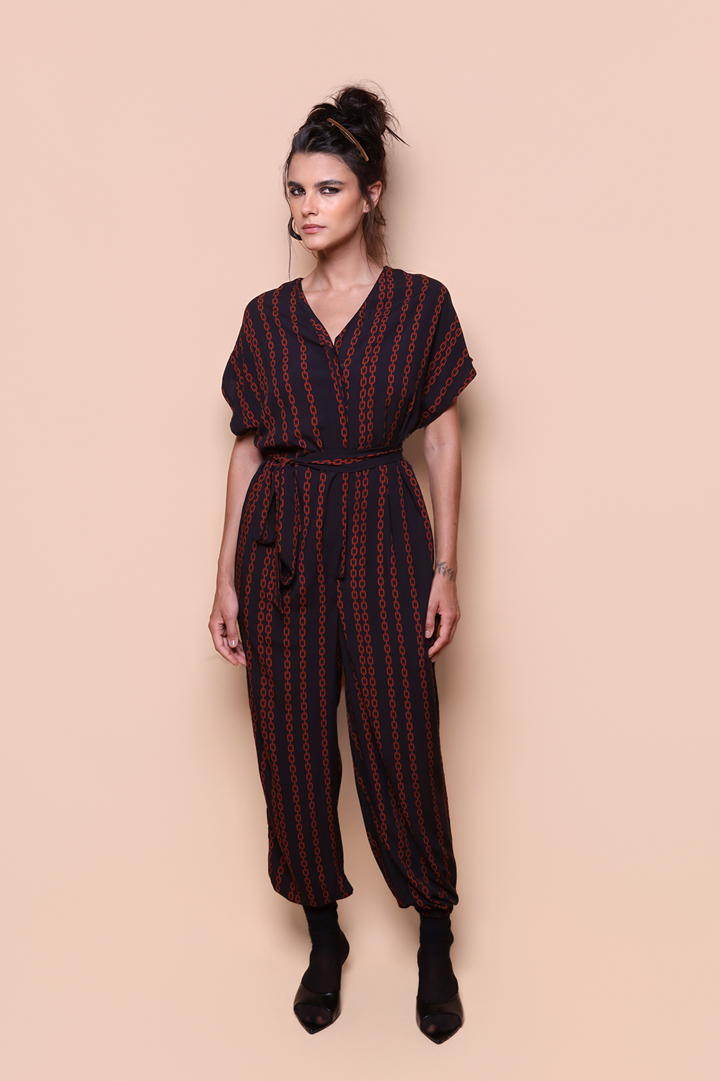 Macacão com laço estampado Correntes. A modelo veste tamanho P.