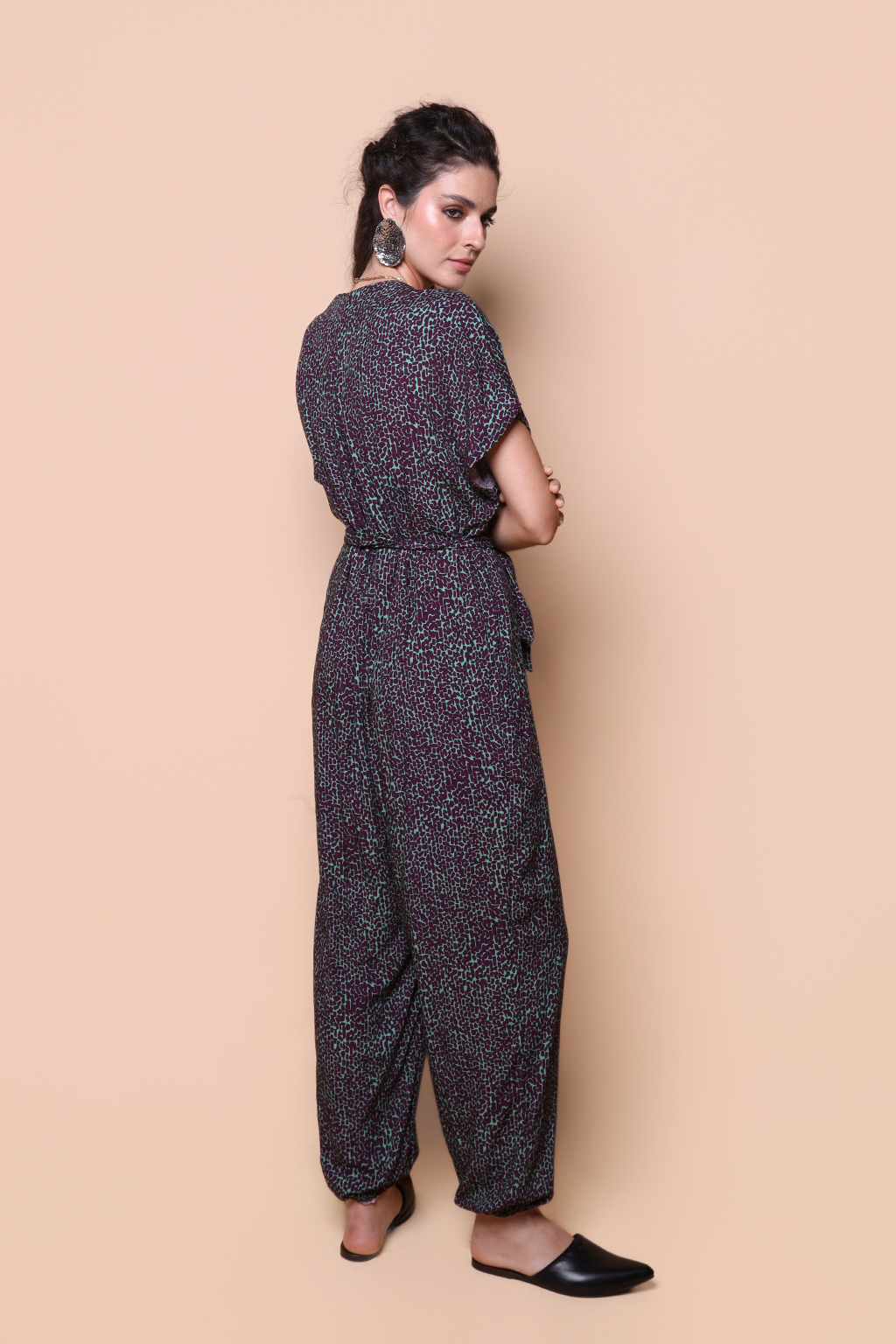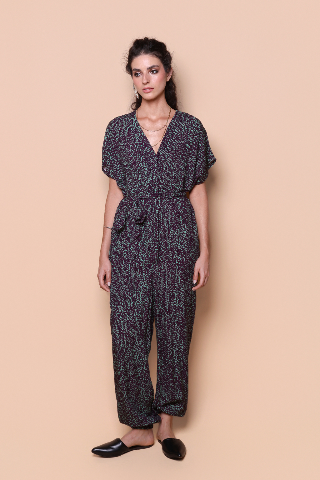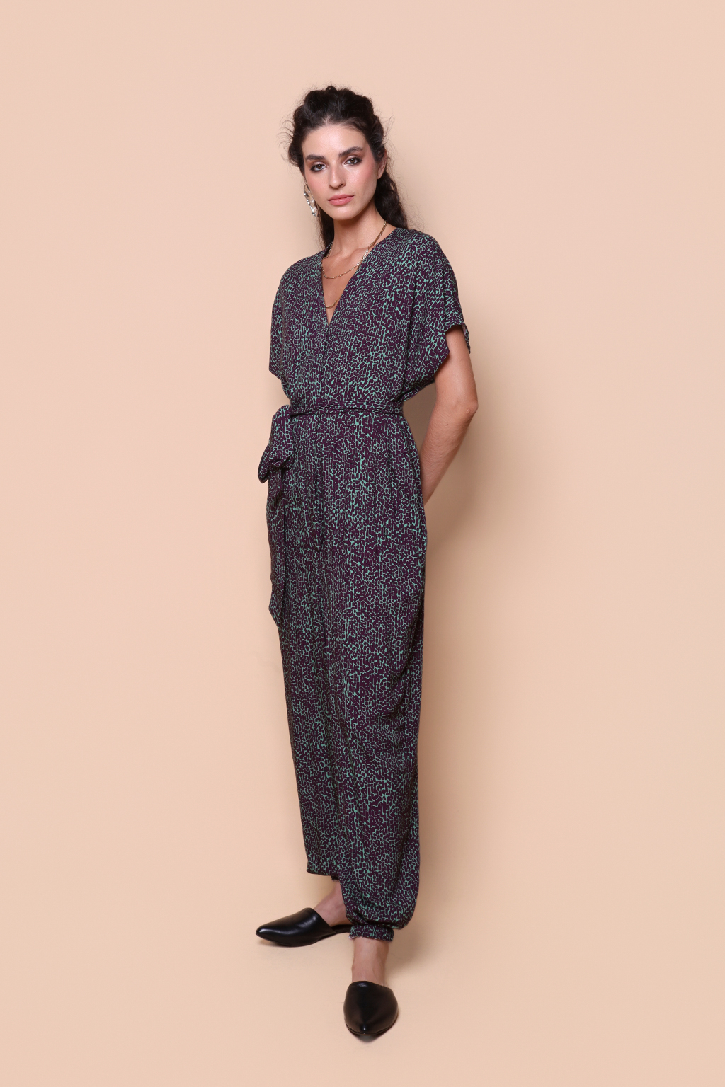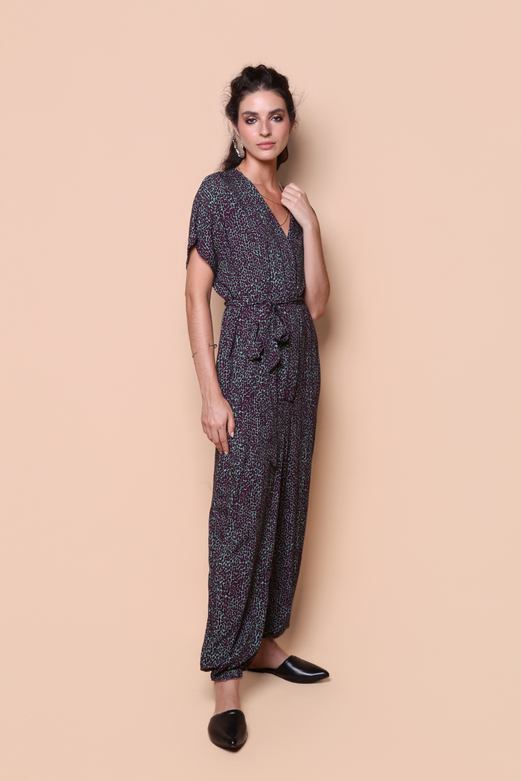 Macacão com laço estampado Desfiladeiro ametista. A modelo veste tamanho P.