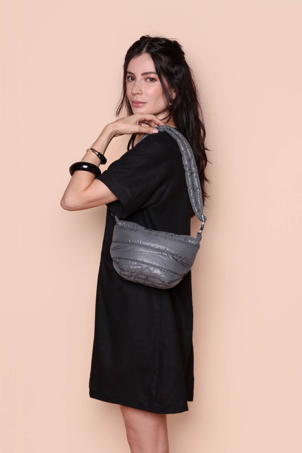 A pochete AMP puffer cinza é feita em tecido matelassê 100% poliéster, com acabamento em cirrê, dando brilho à peça. Apresenta alça de ombro regulável, fechamento em zíper e bolso lateral com fechamento em botão magnético. O enchimento da bolsa puffer traz conforto e a sensação de aconchego.