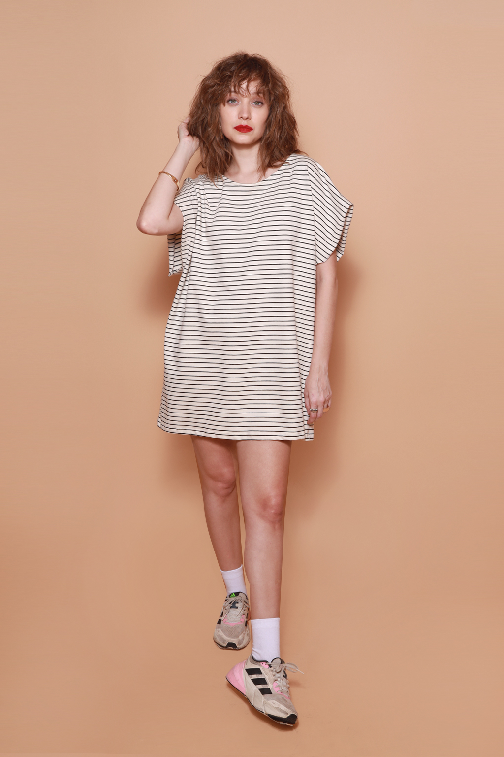 Regata masculina malha listrada. A modelo mede 1,72 e o modelo mede 1,75 e ambos usam tamanho 1.