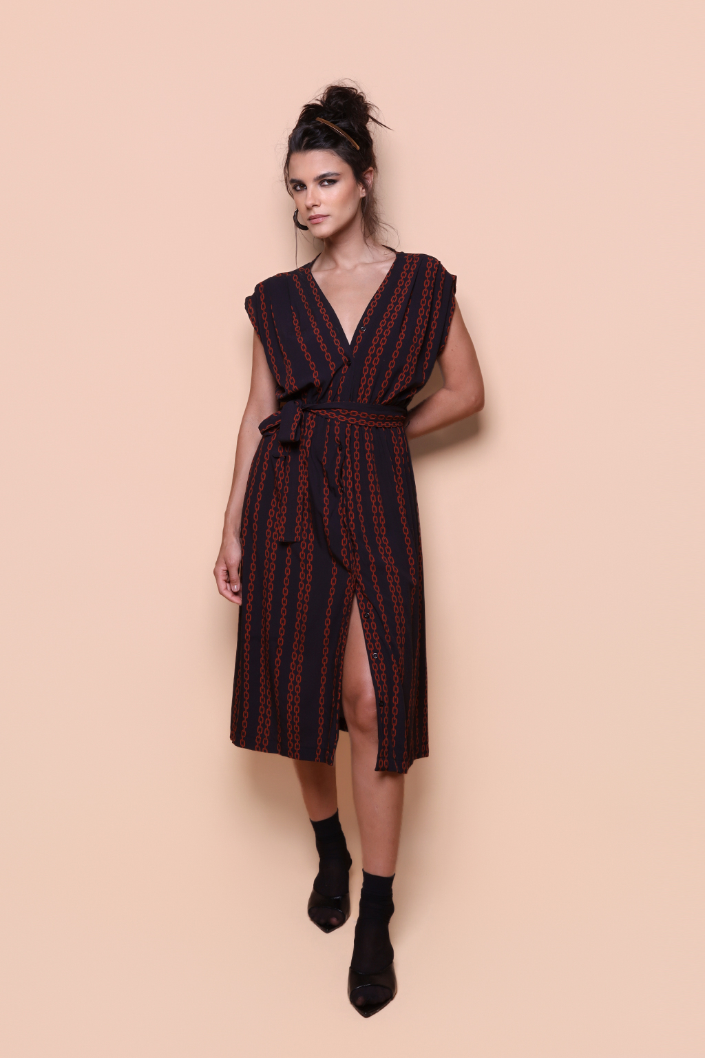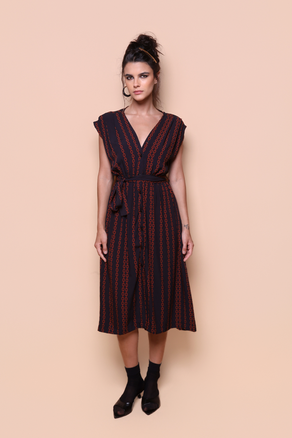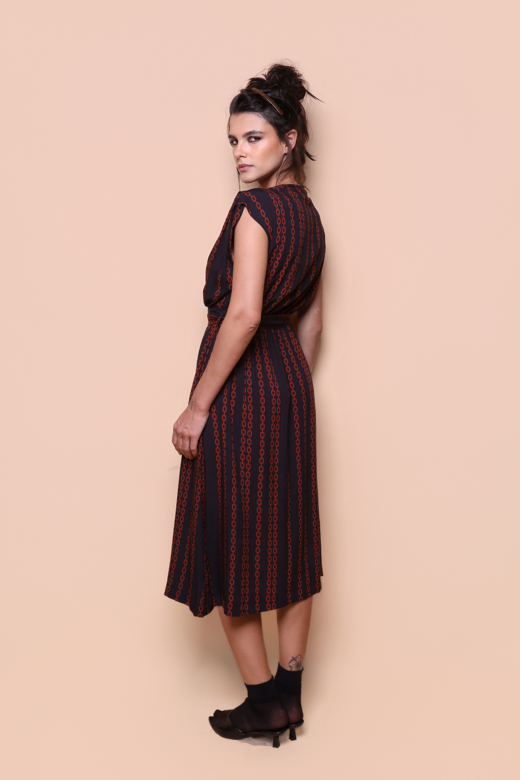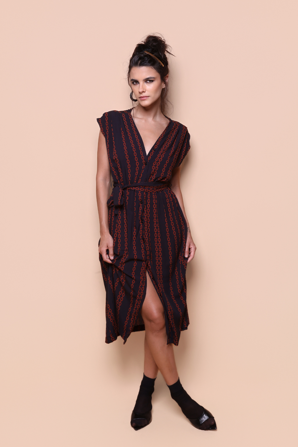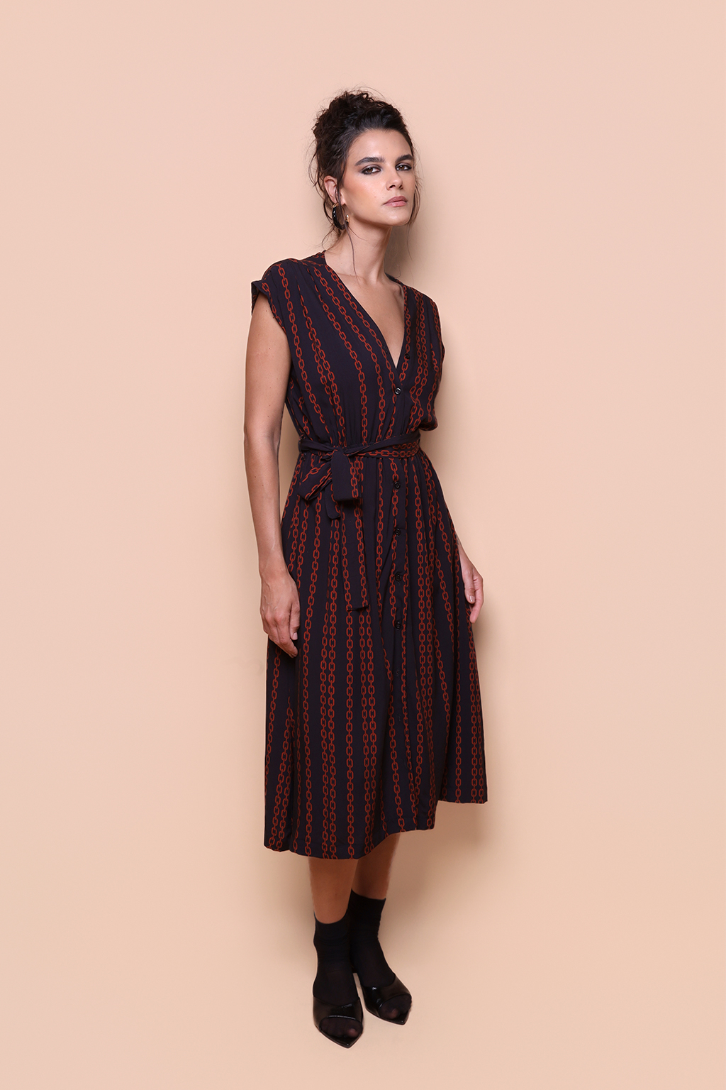 Vestido acinturado estampado Correntes. A modelo veste tamanho P