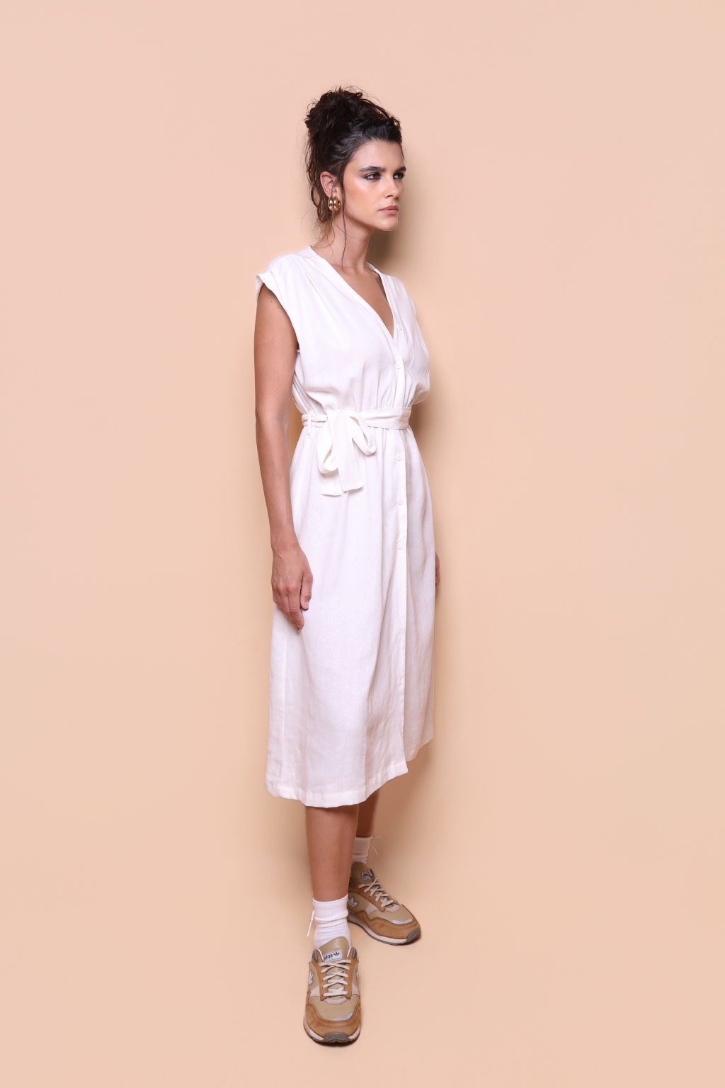 Vestido acinturado linho off-white l. A modelo veste tamanho P.