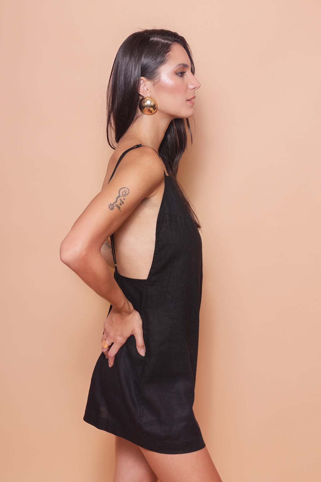 Vestido curto costas abertas linho preto. A modelo mede 1,80 e usa tamanho P