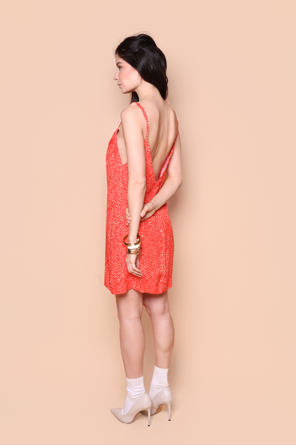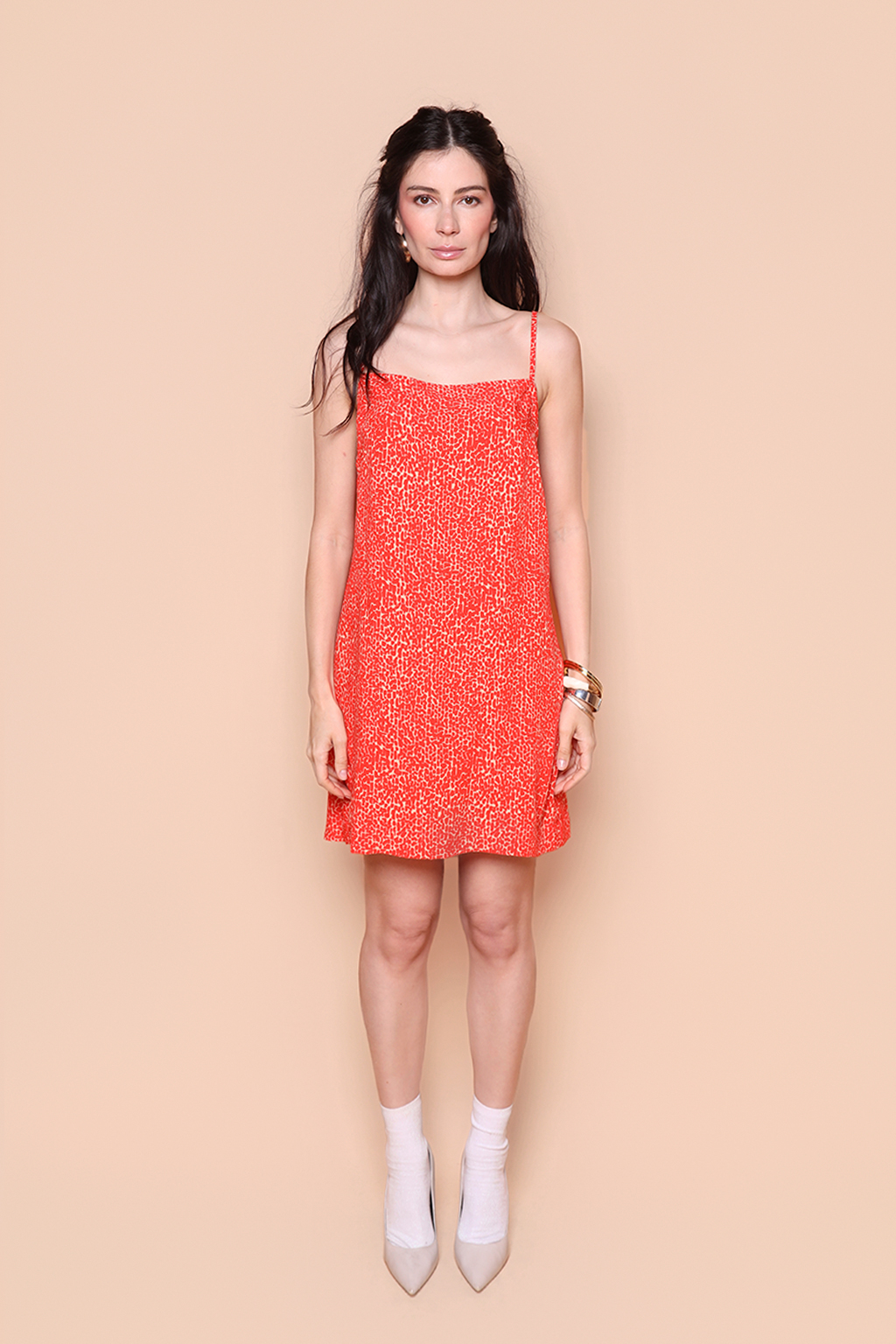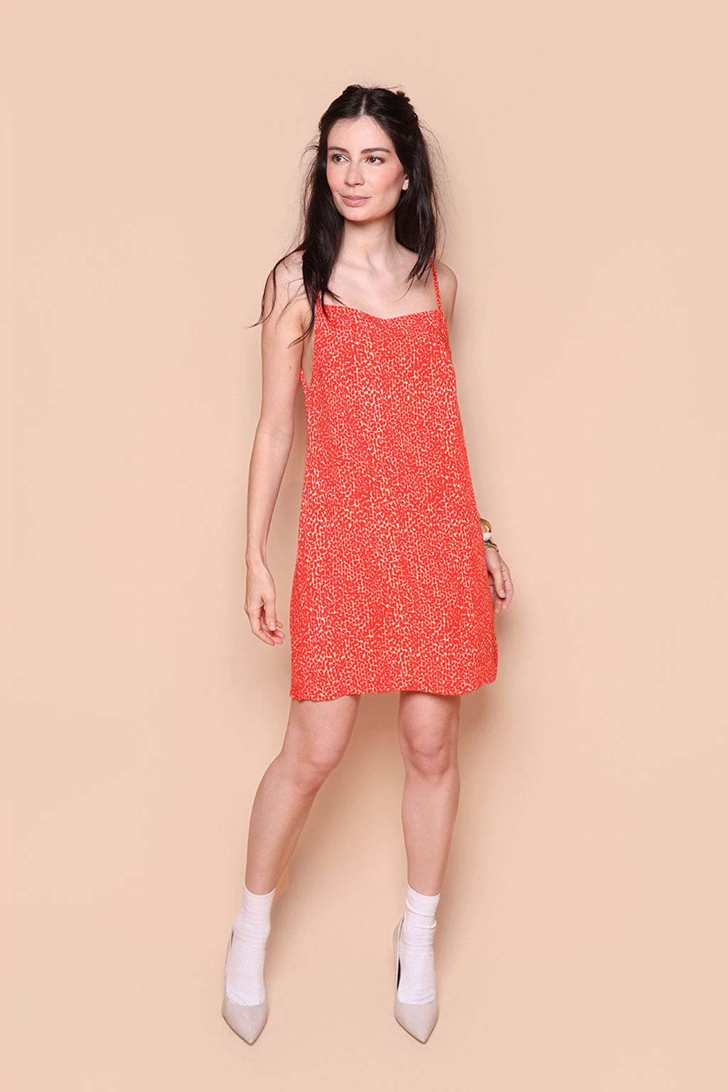 Vestido decote quadrado Desfiladeiro Coral. A modelo mede 1,72 e usa tamanho P.