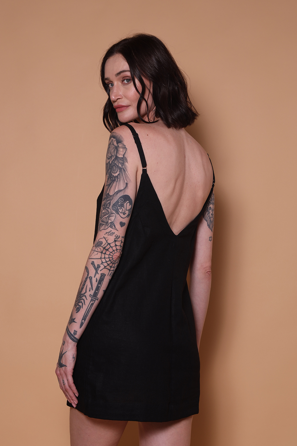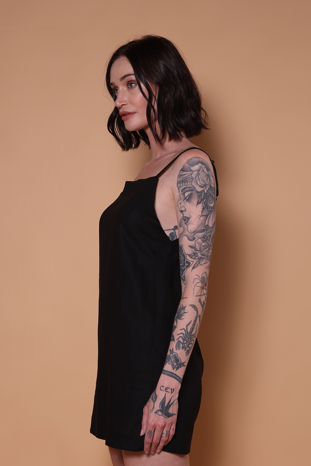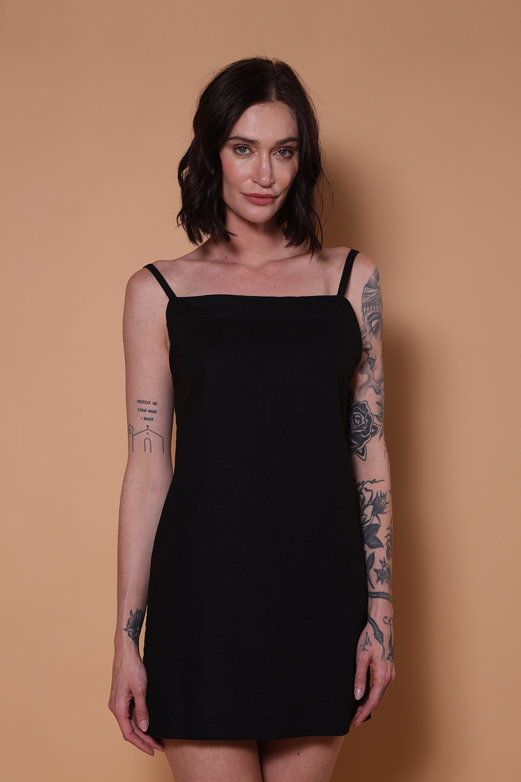 Vestido decote quadrado preto em linho. A modelo mede 1,82 e usa tamanho P