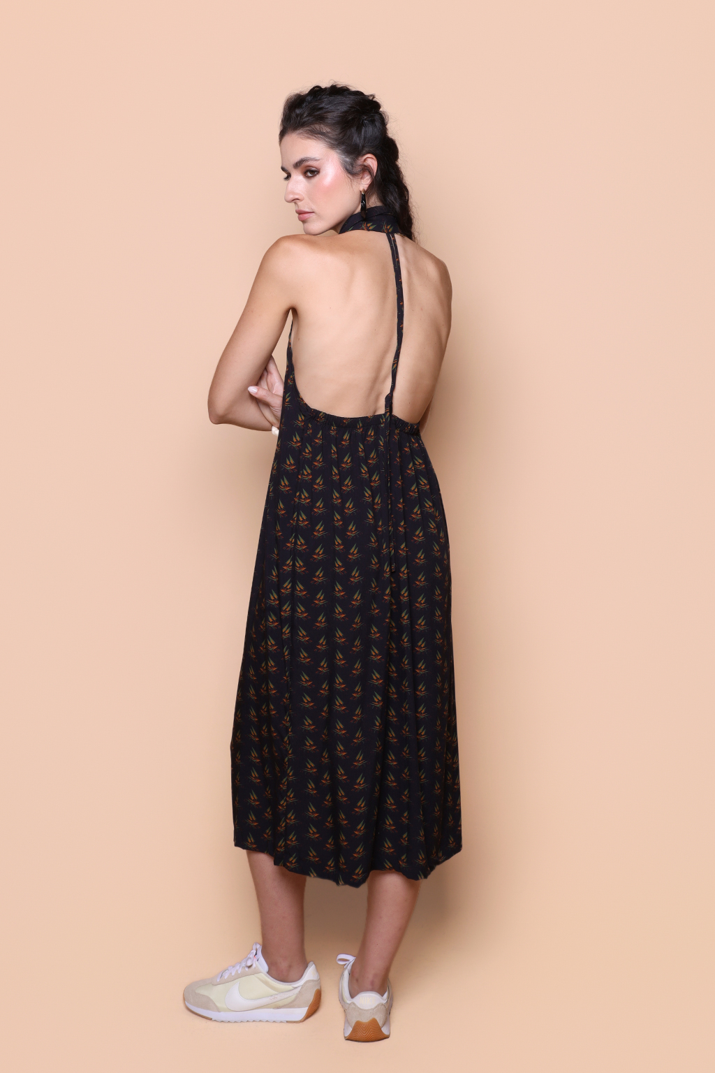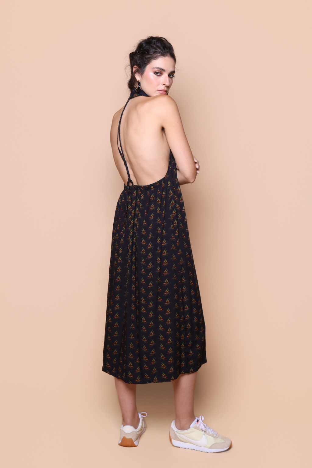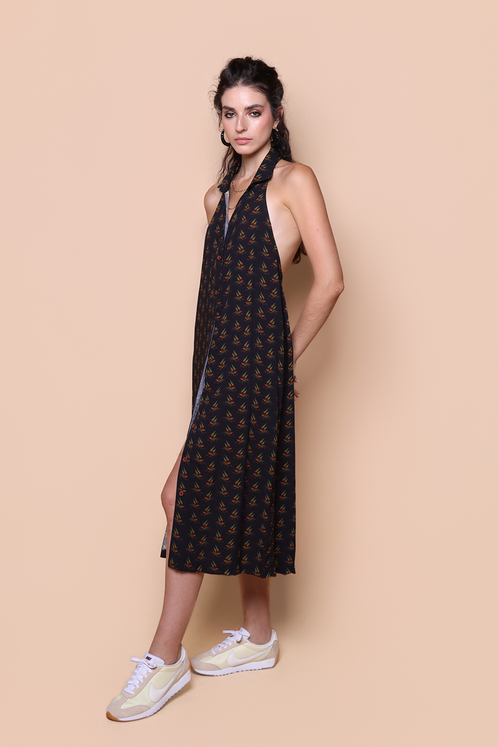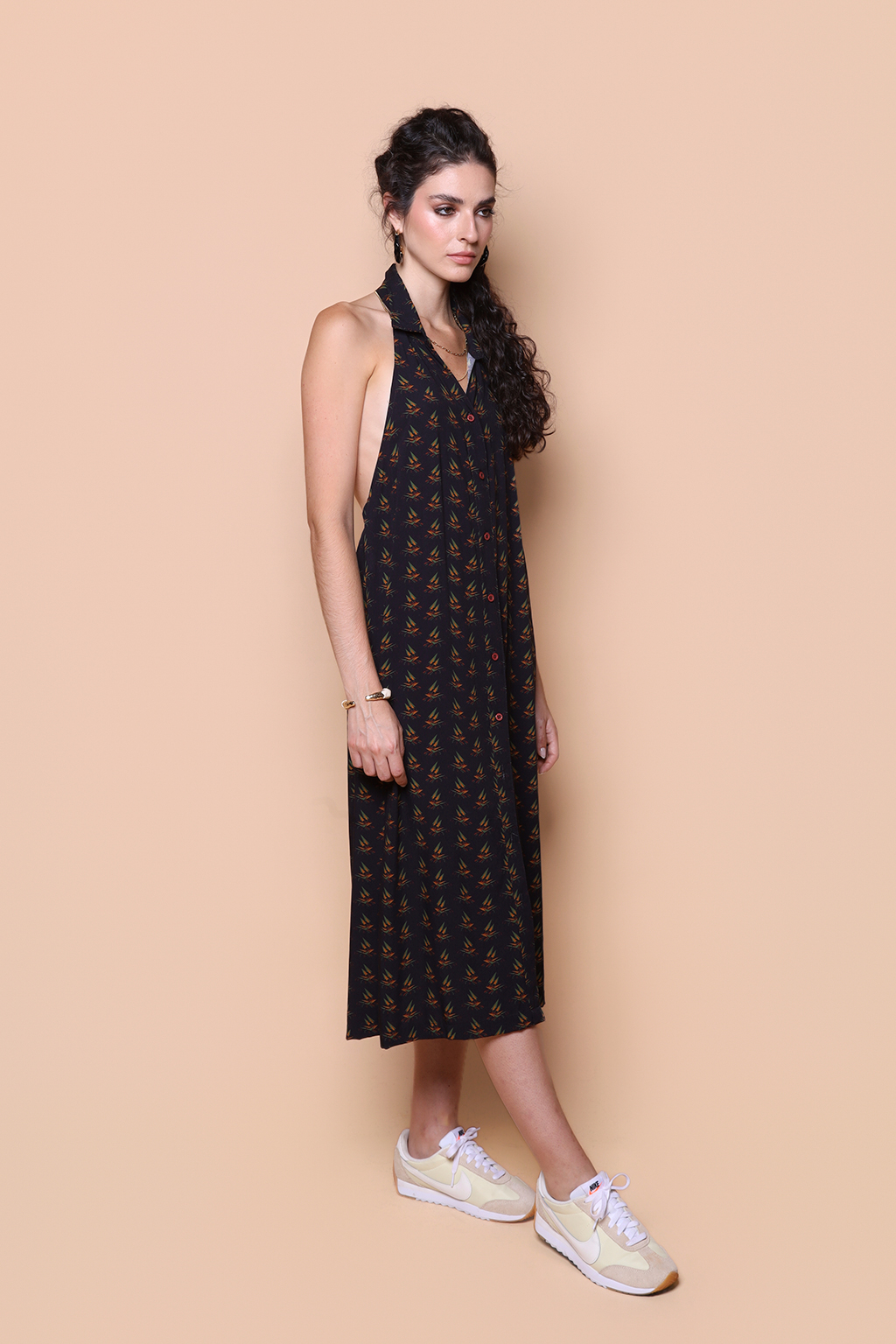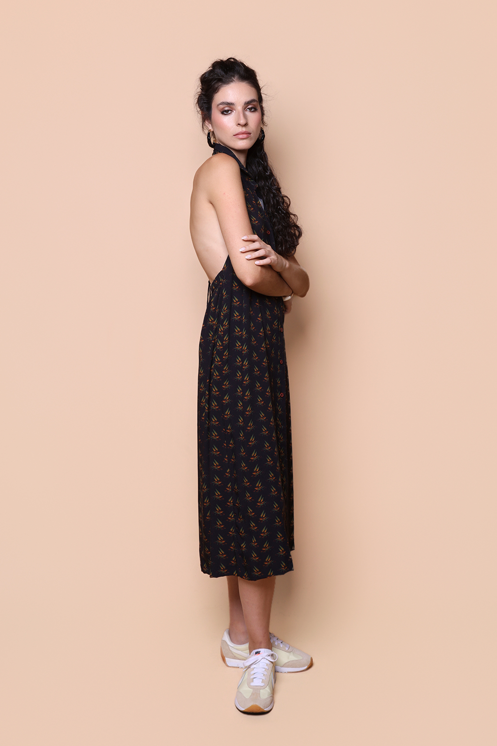 O vestido frente única é feito em viscose, que deixa o tecido com um toque mais leve e macio, ideal para os dias de verão. Nosso vestido tem modelagem reta, comprimento midi e costas abertas.