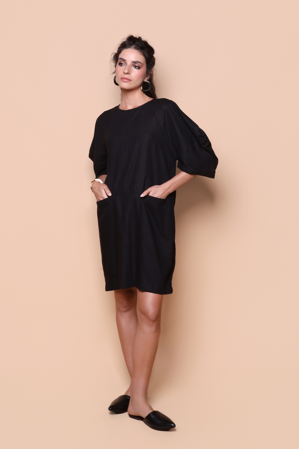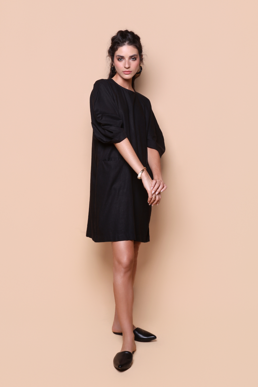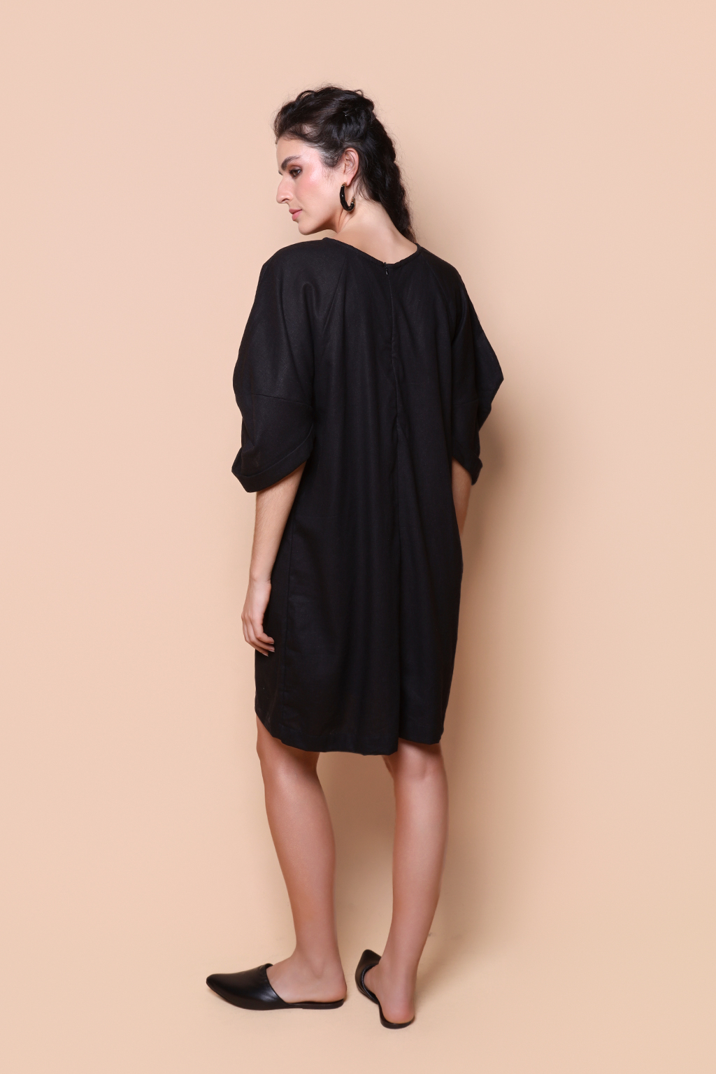 Vestido manga quadrada linho preto.