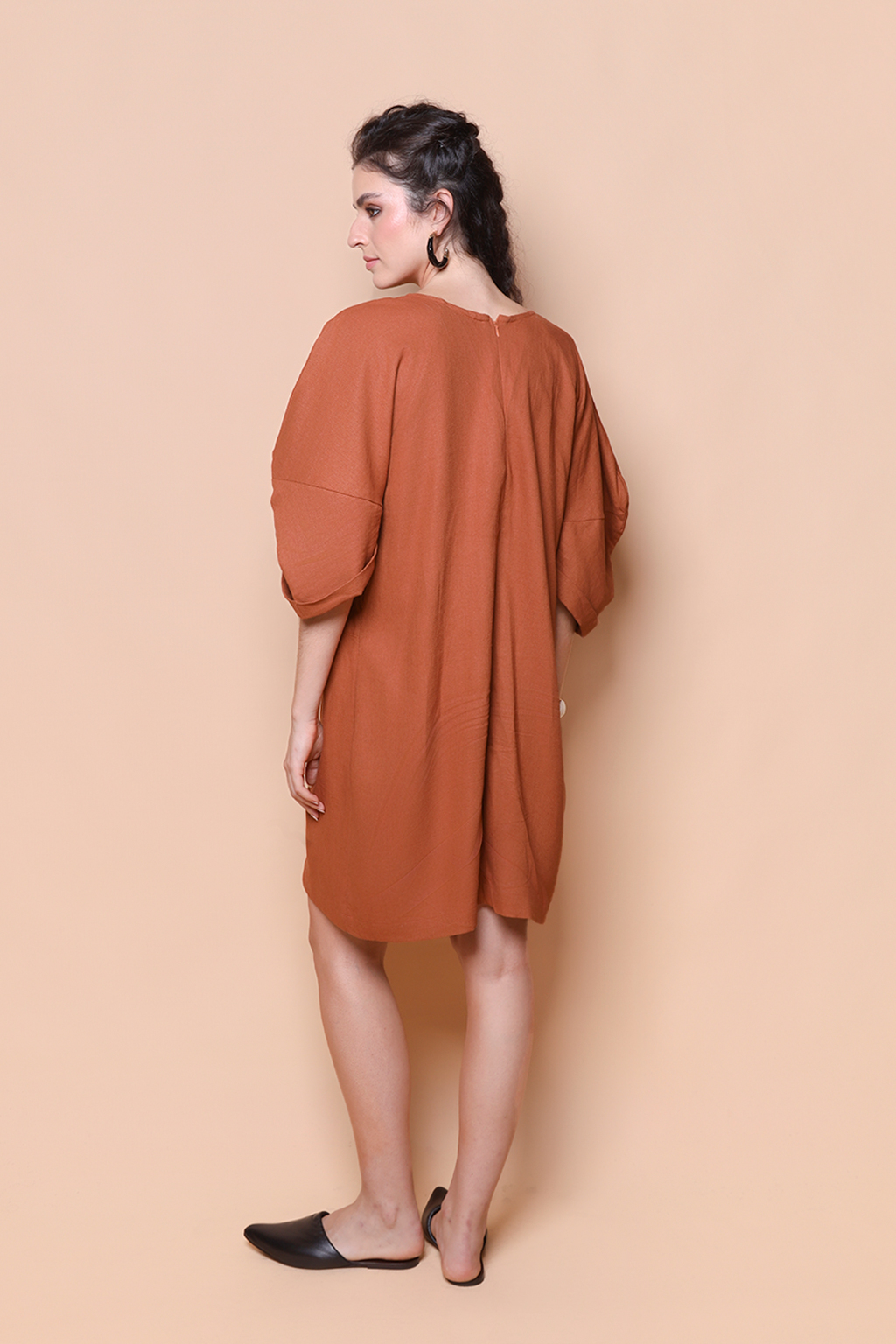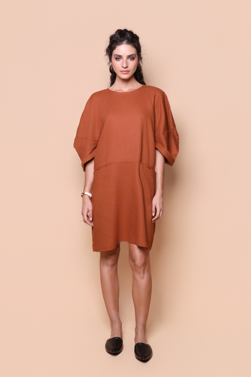 Vestido manga quadrada linho tijolo.
