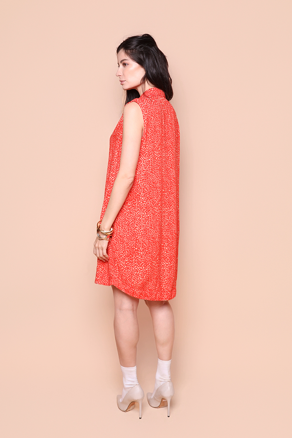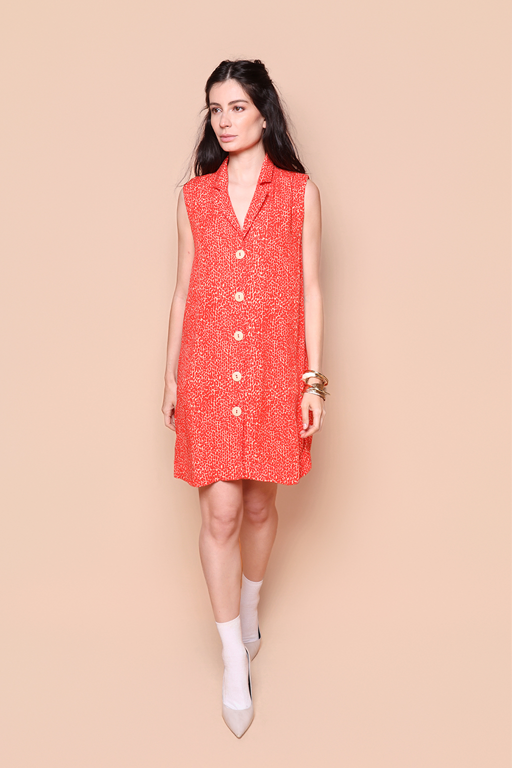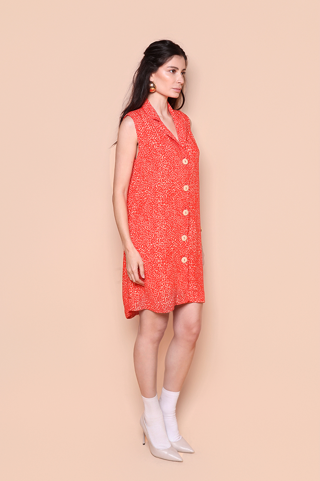 Vestido paletó Desfiladeiro Coral. A modelo mede 1,72 e usa tamanho P.