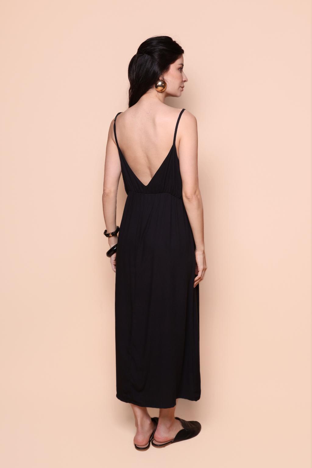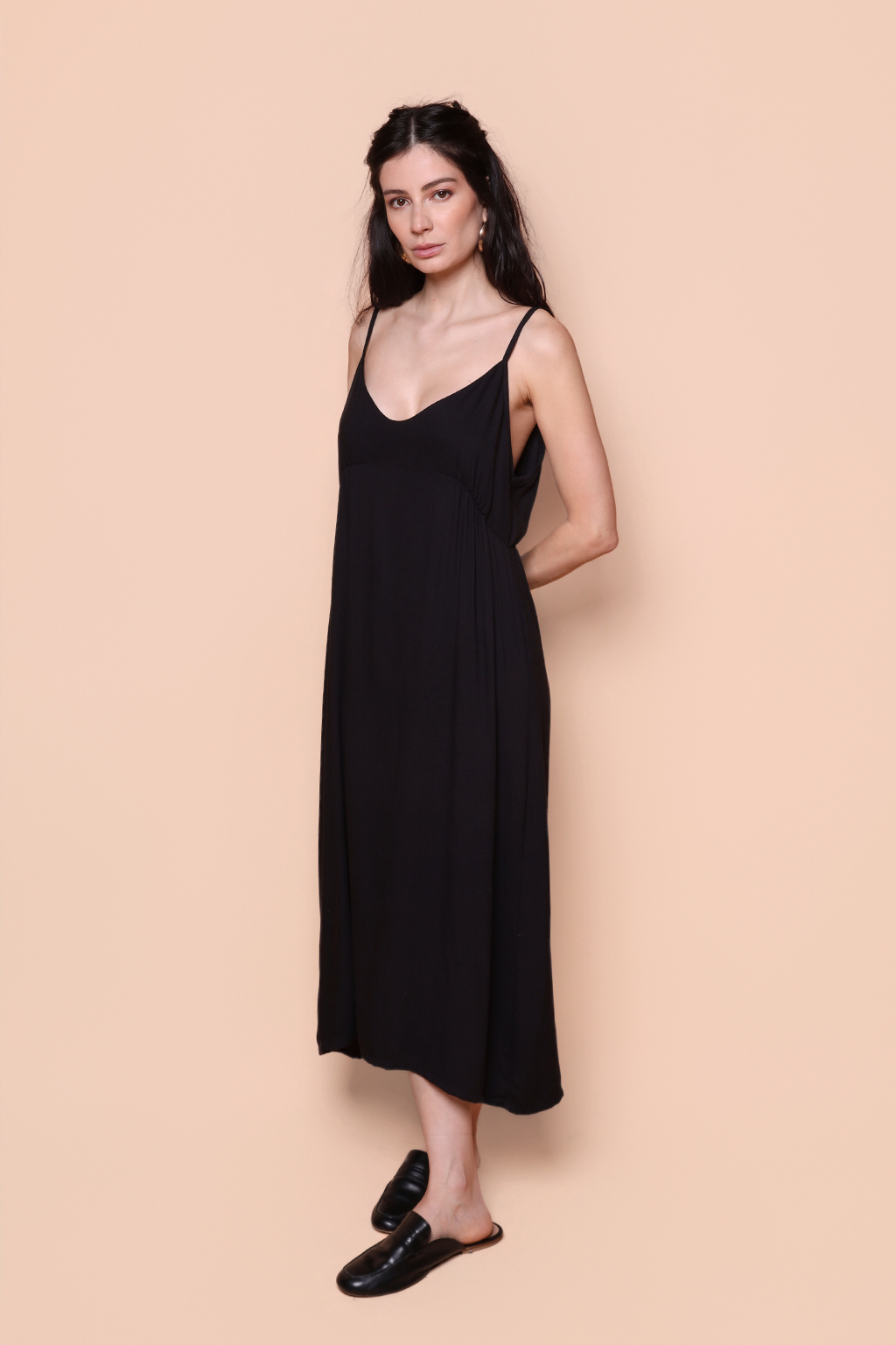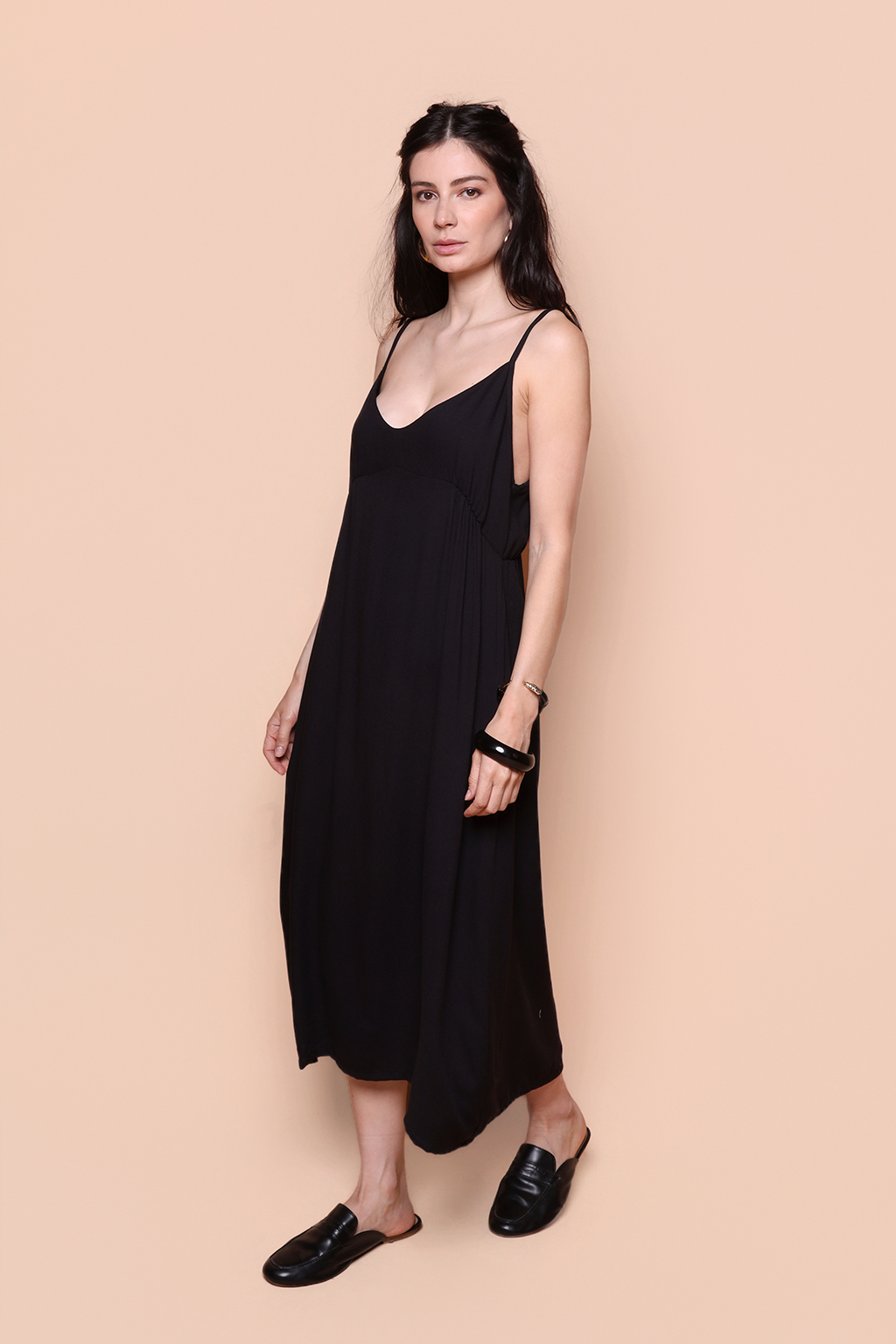 Vestido regata amplo viscose creponada preto. A modelo mede 1,72 e usa tamanho P.