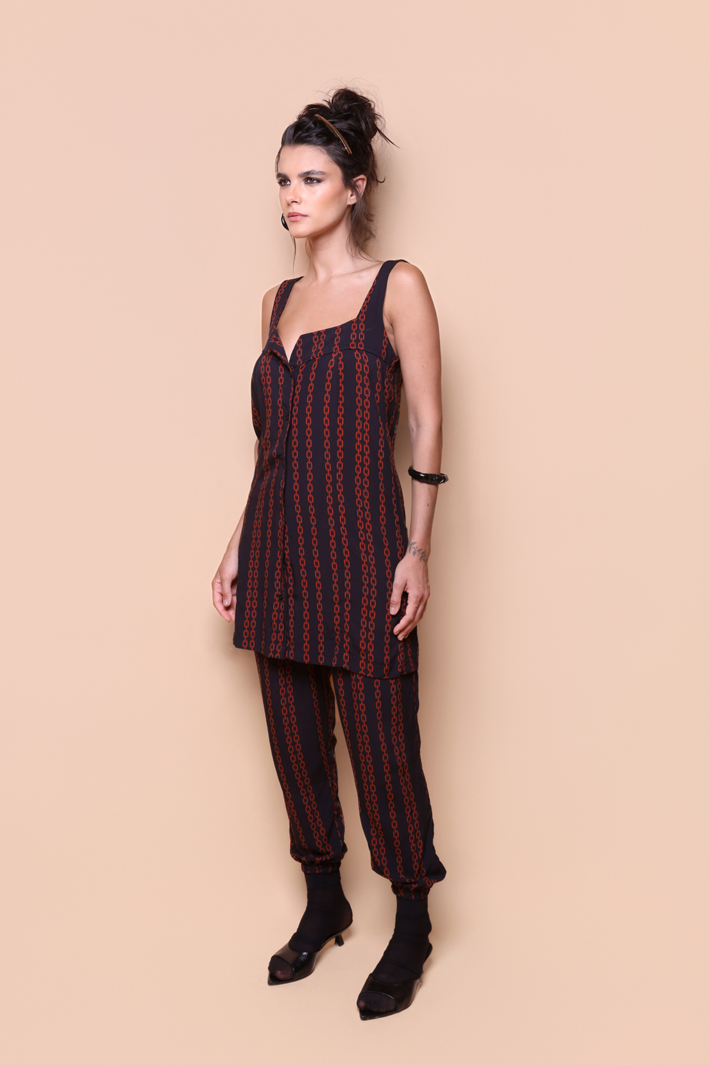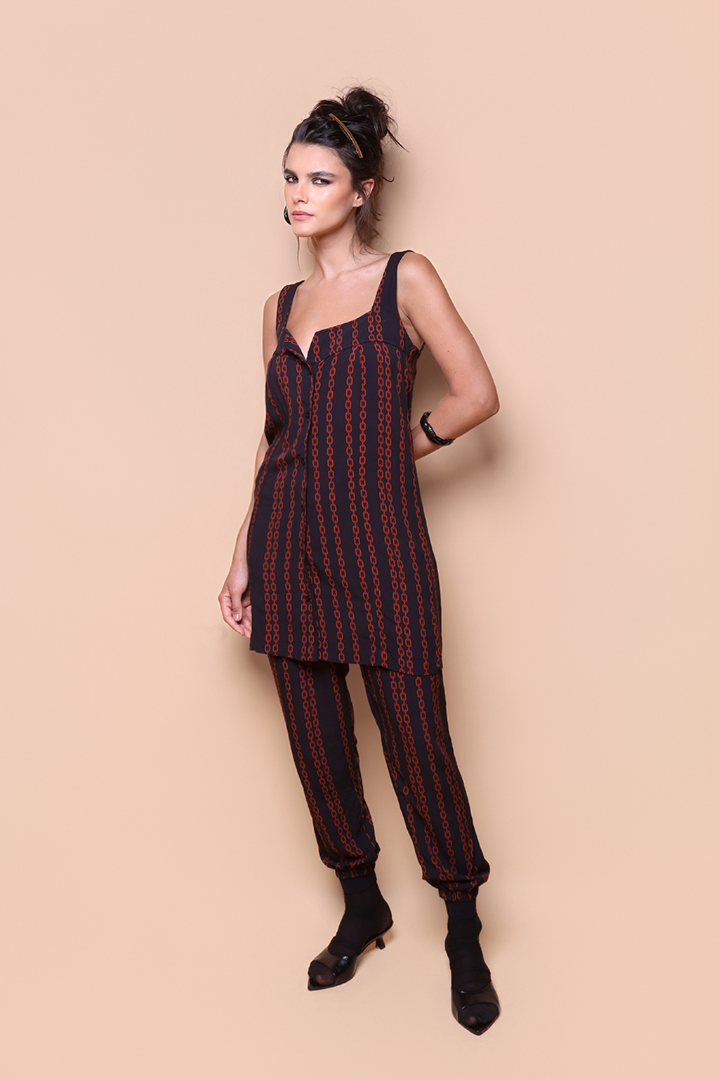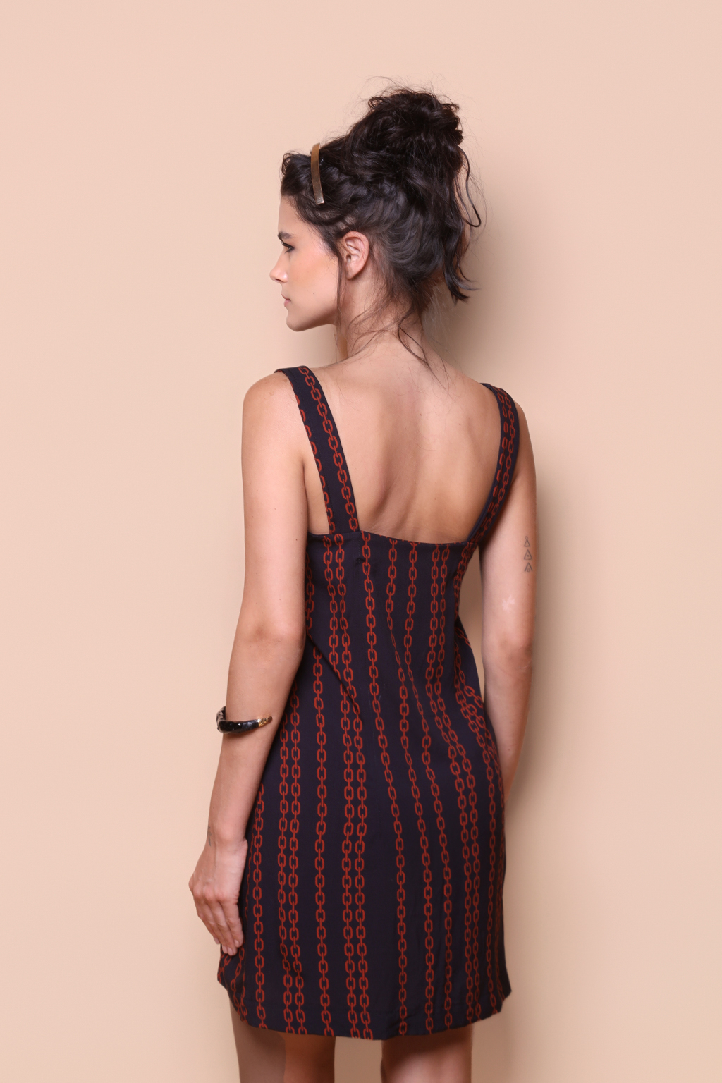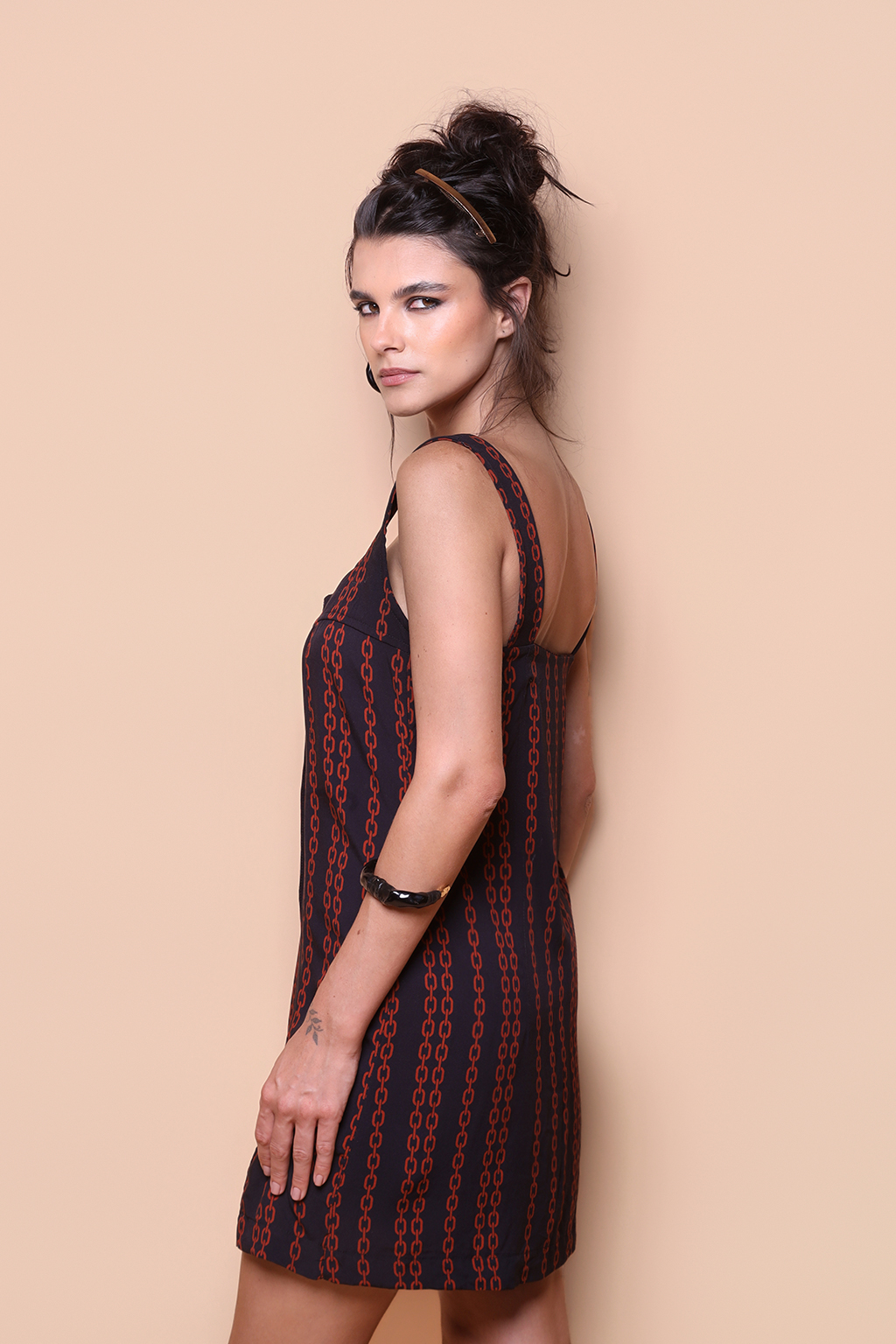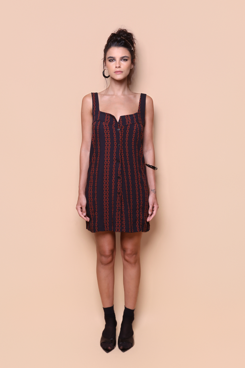 Vestido regata botão estampado Correntes. A modelo veste tamanho P.