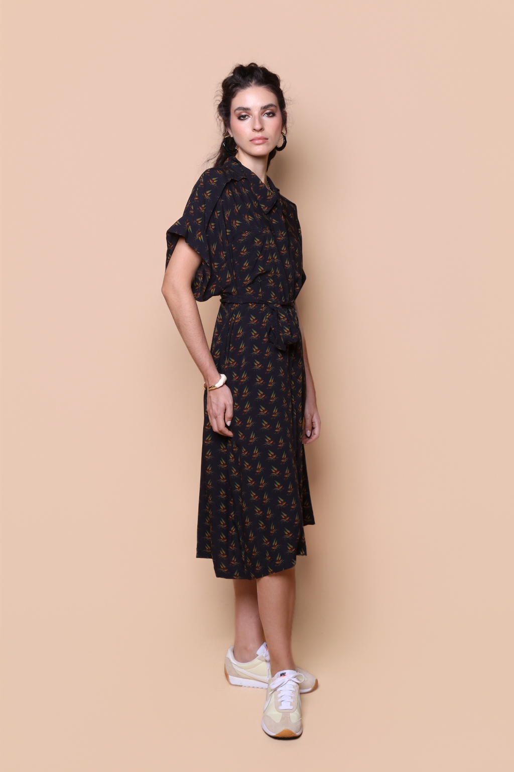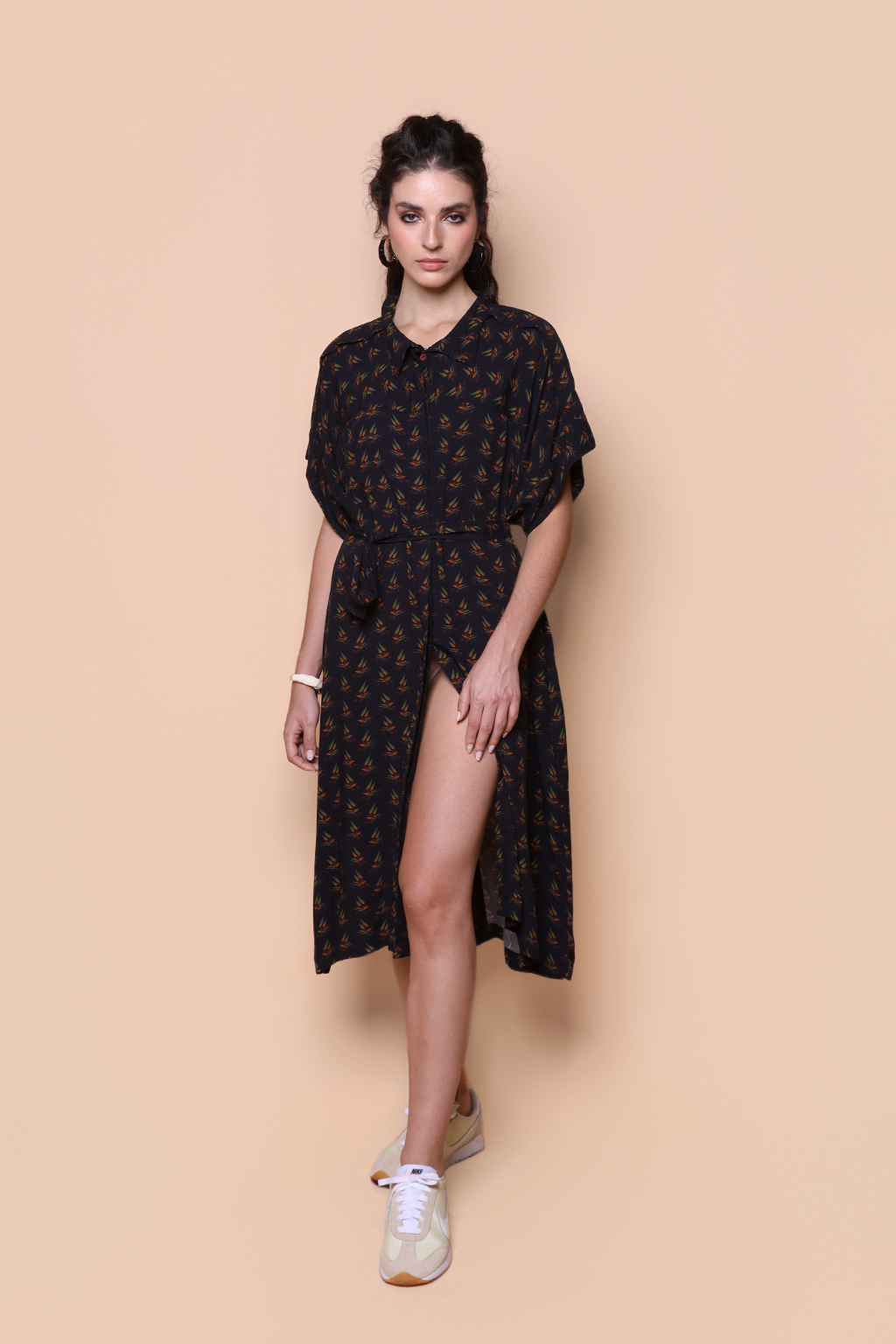O vestido sobretudo é feito em viscose, que deixa o tecido com um toque mais leve e macio, ideal para os dias de verão. Nosso vestido tem modelagem transpassada, comprimento clássico e mangas curtas.