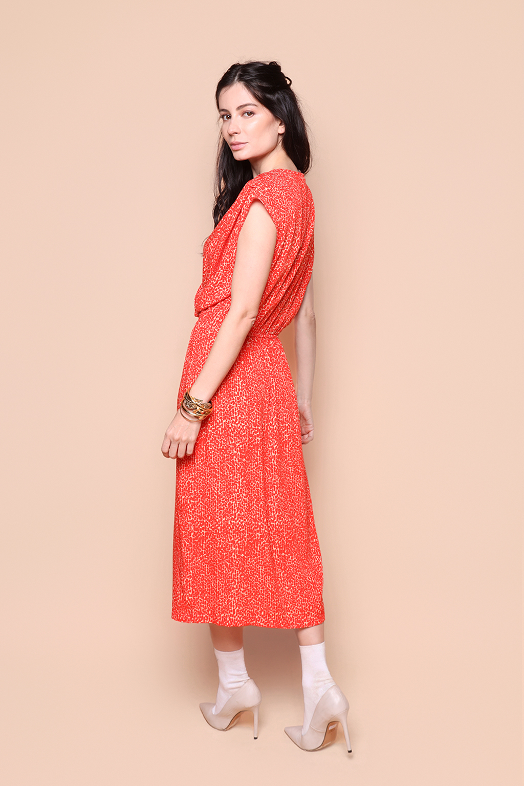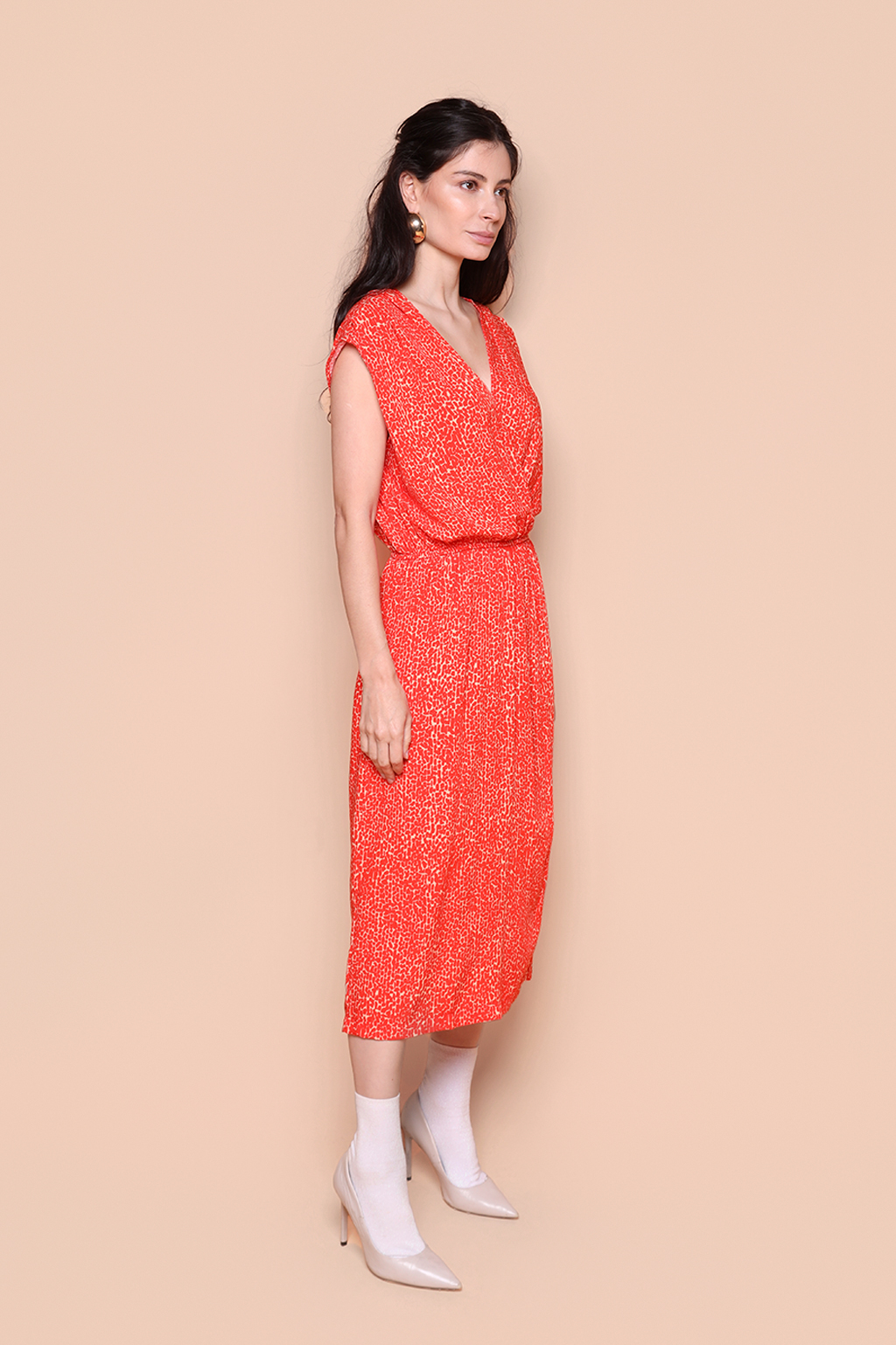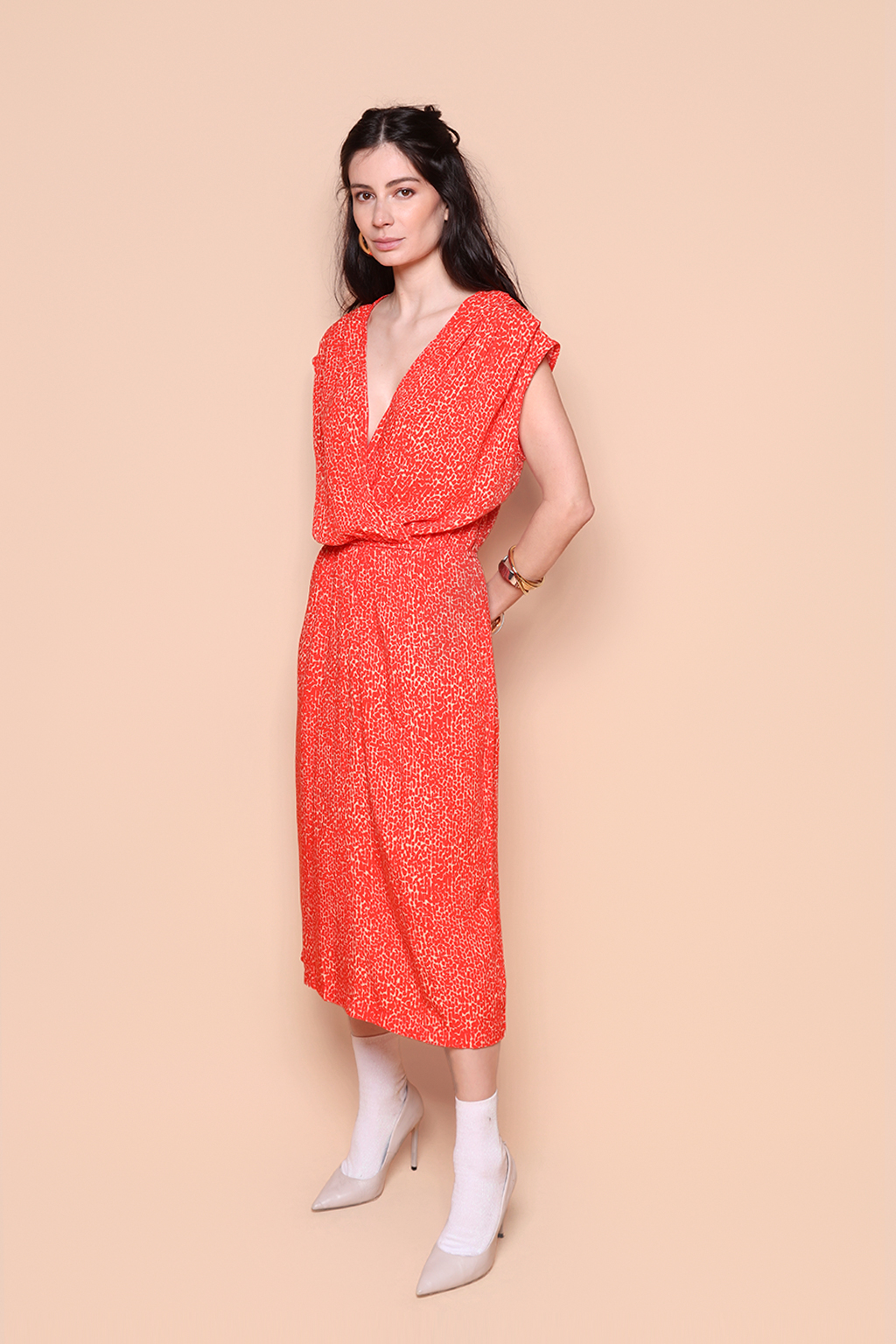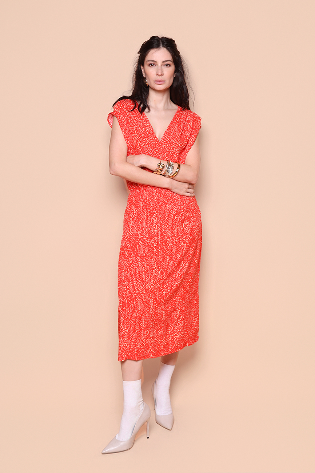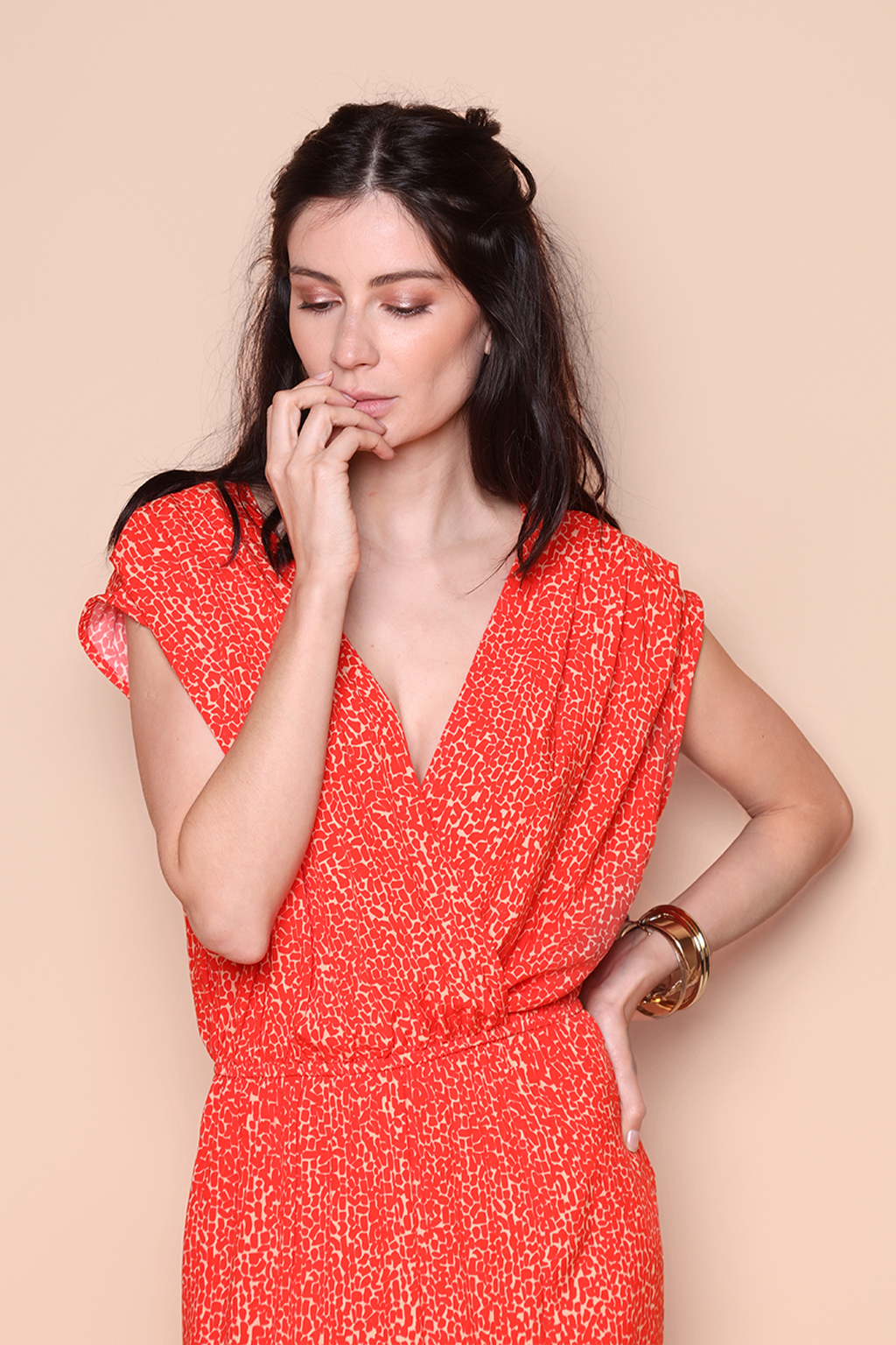 Vestido transpassado Desfiladeiro Coral . A modelo mede 1,72 e usa tamanho P.