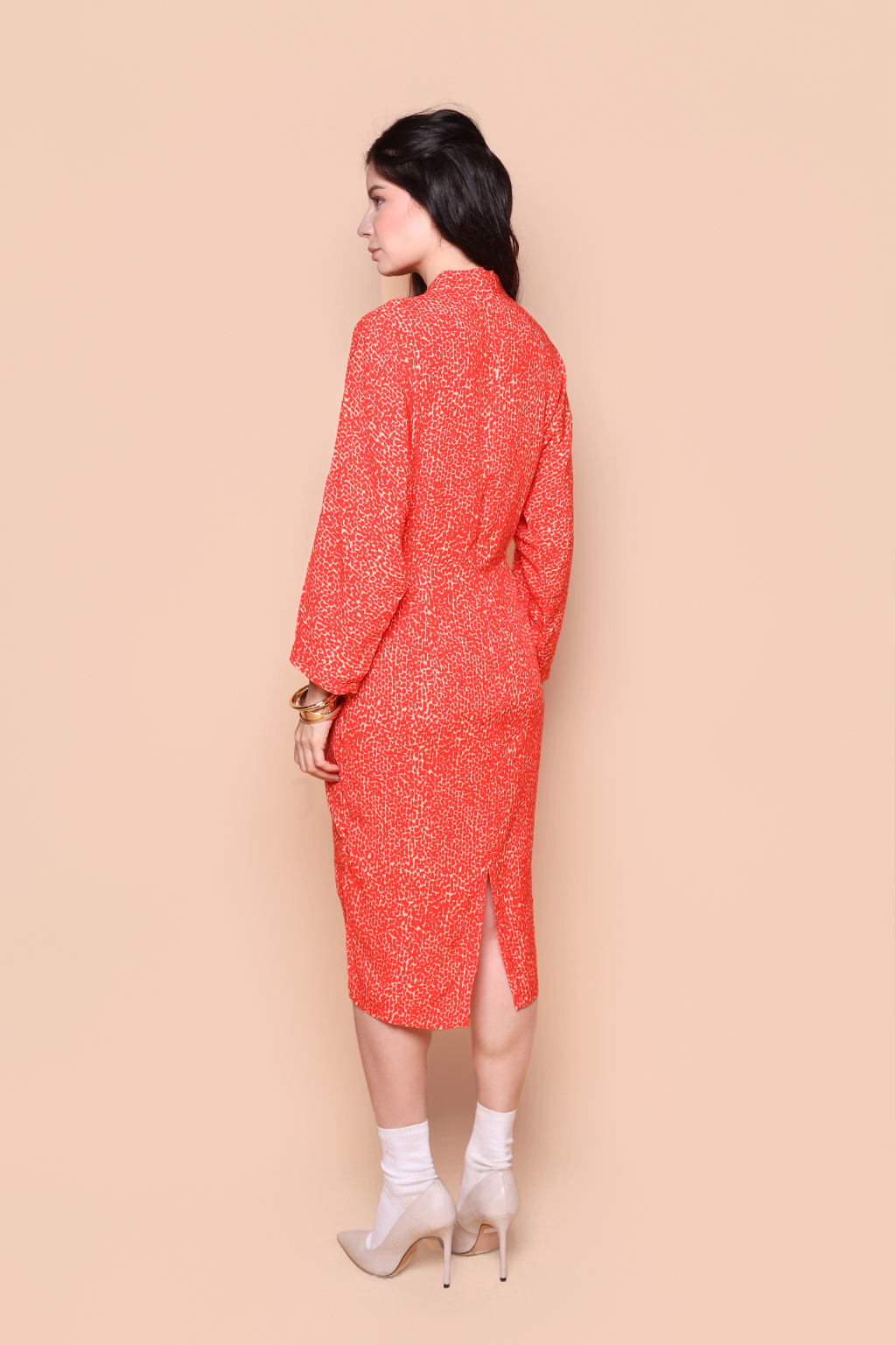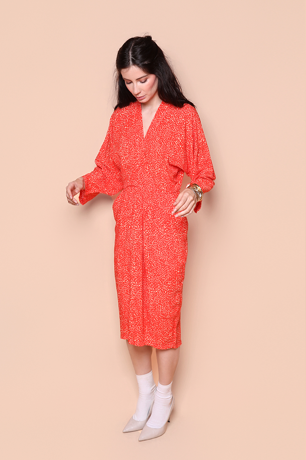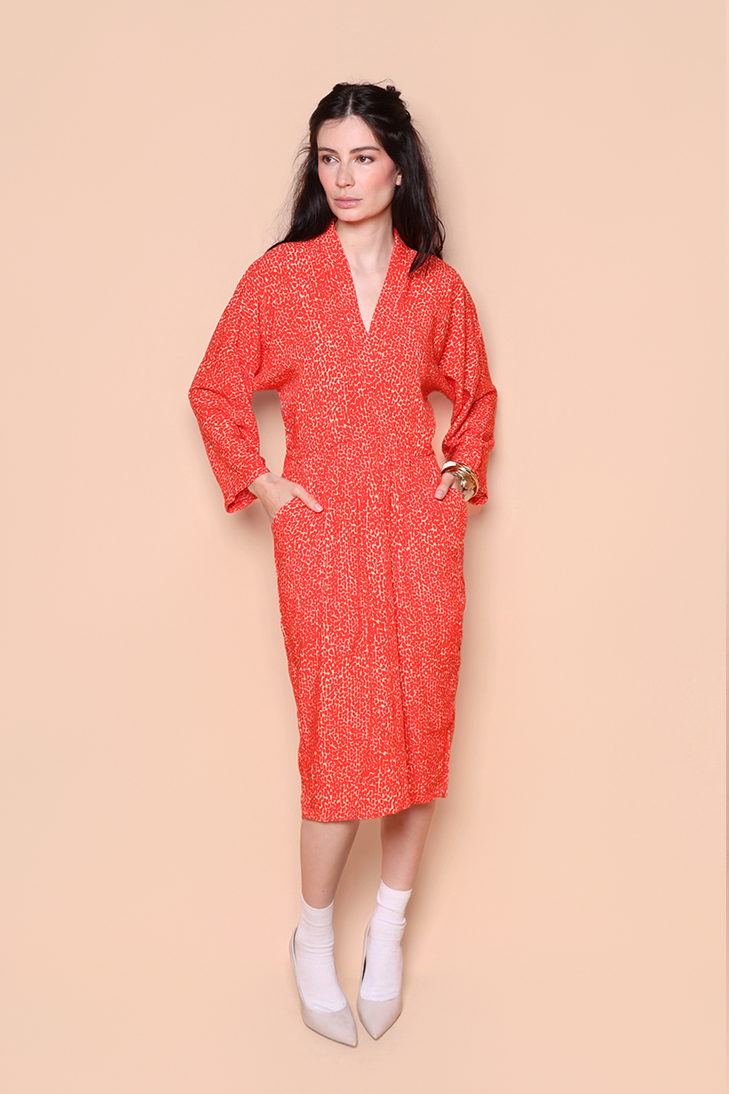 Vestido transpassado manga longa Desfiladeiro Coral. A modelo mede 1,72 e usa tamanho P.